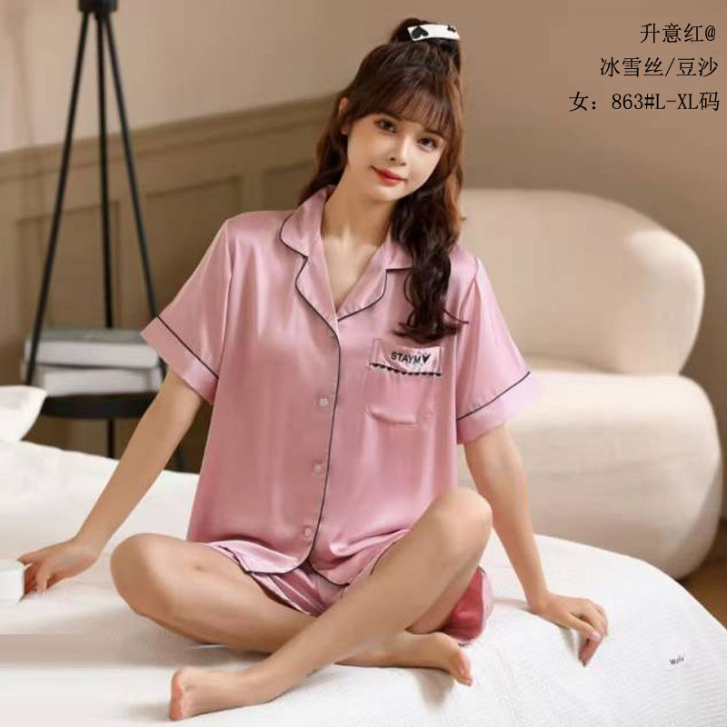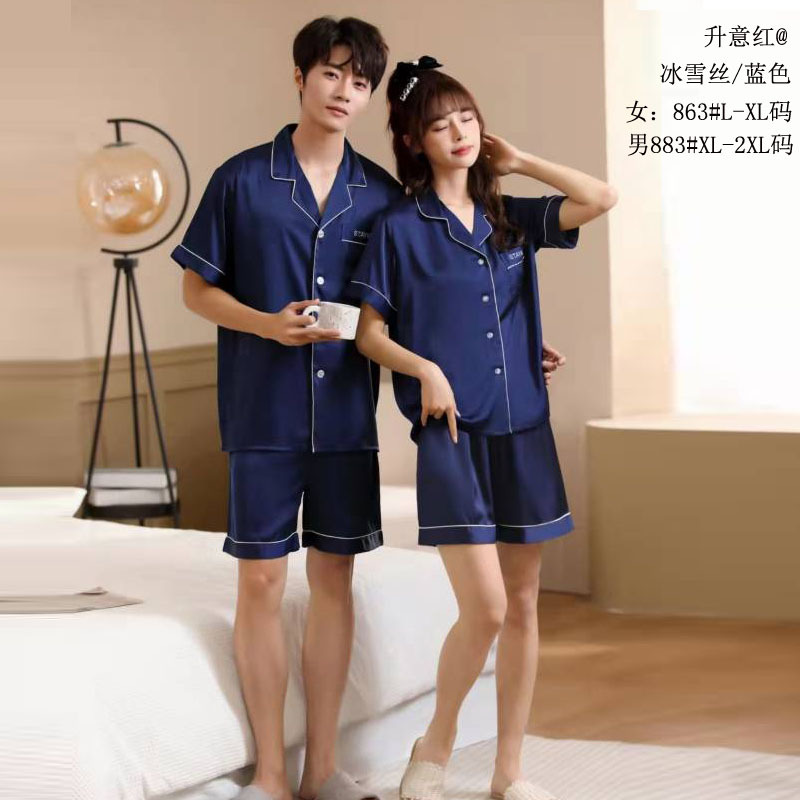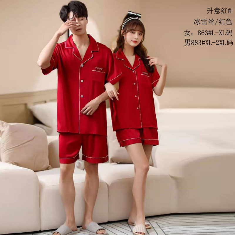 승천 레드 아이스 실크 커플 세트 아이스 실크 파자마 실크 솔리드 컬러 커플 의류 실크 짧은 소매 반바지 홈 의류