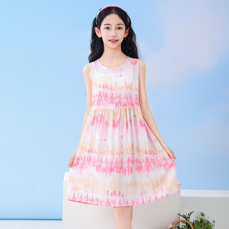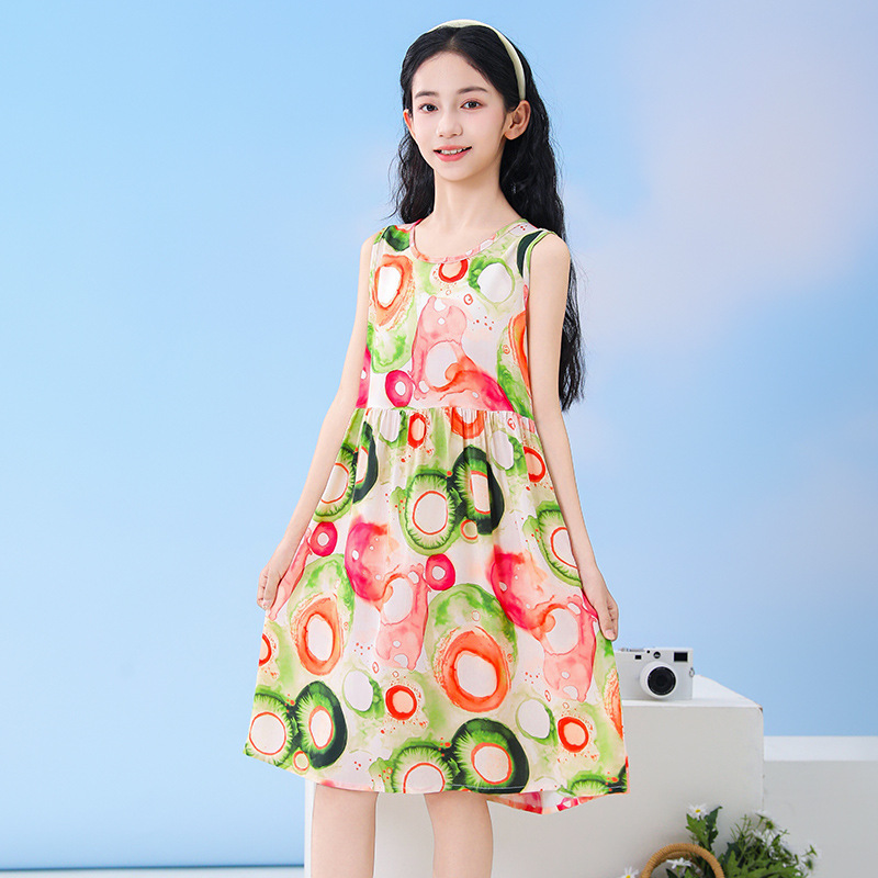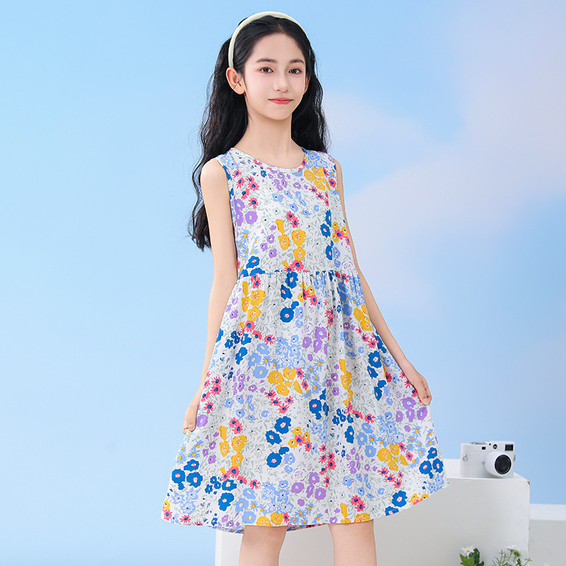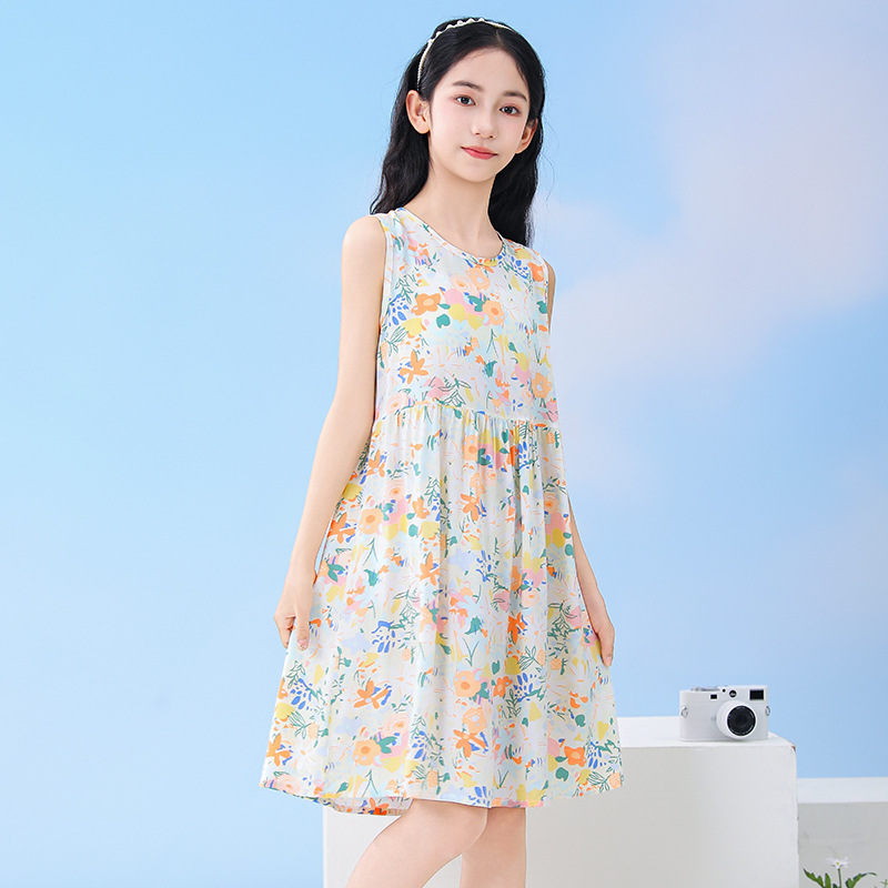 26 여름 여아 꽃무늬 민소매 조끼 원피스, 중소형 아동용 통기성 공주 드레스, 아기 만화 캐릭터 홈웨어 잠옷스토어 가기