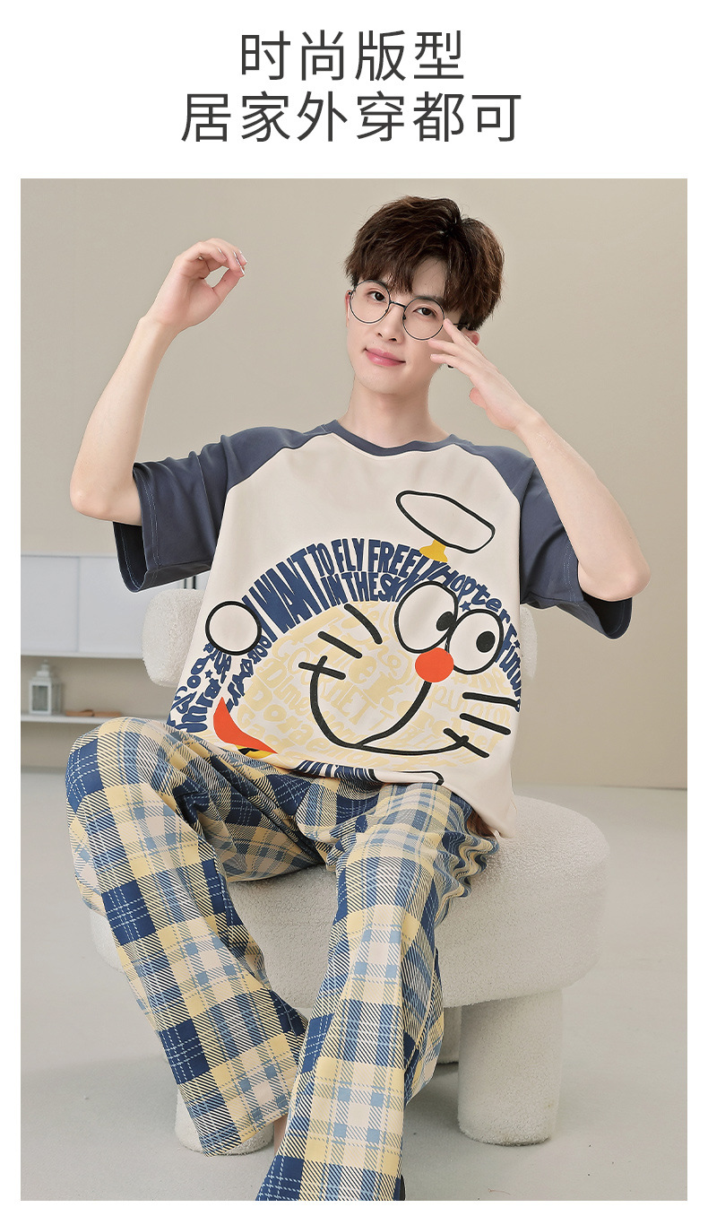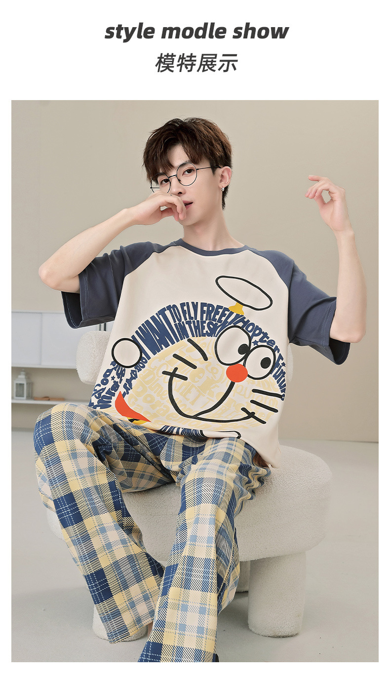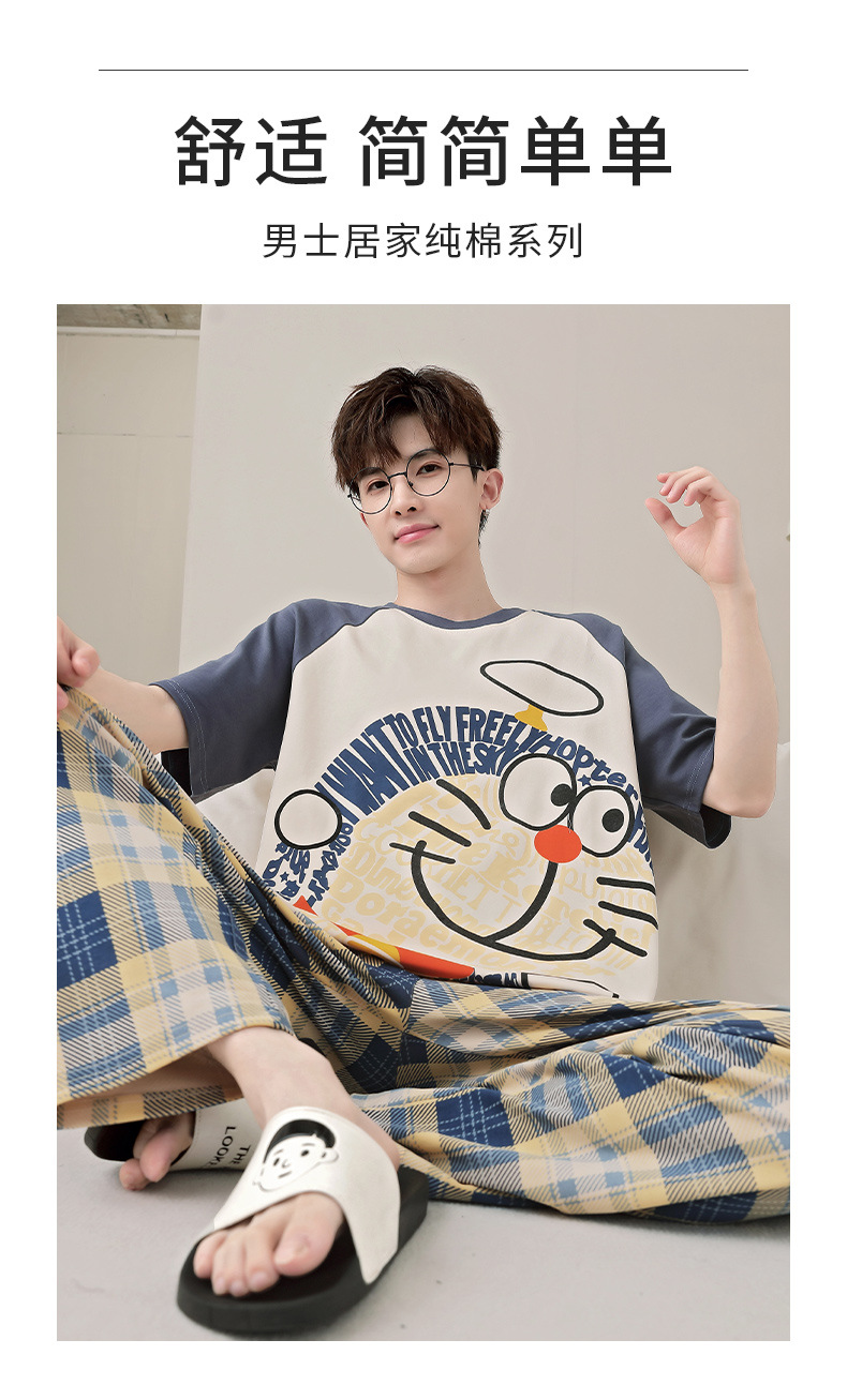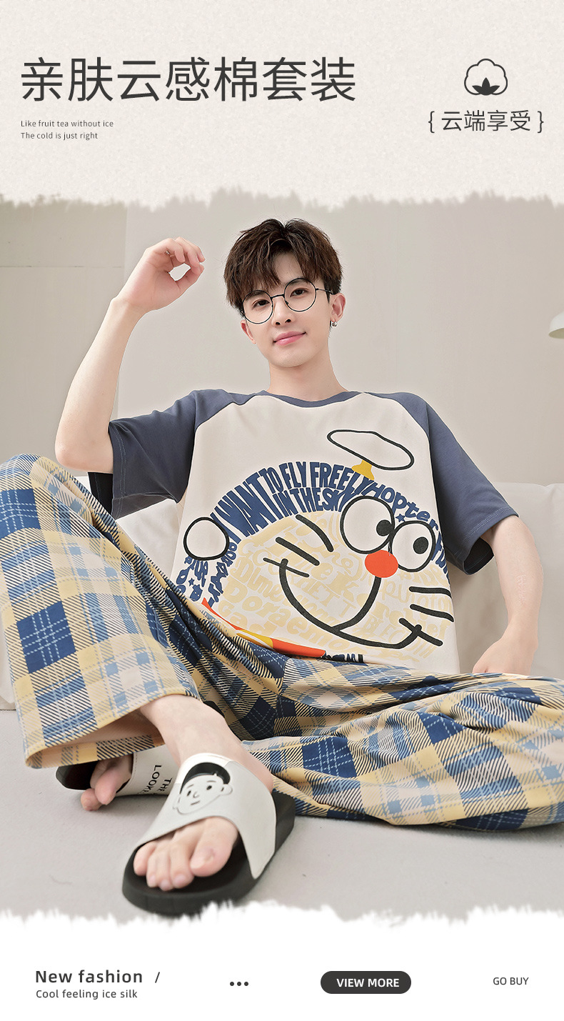 남성 잠옷 여름 순수 코튼 반팔 2025 새로운 얇은 청소년 바지 만화 대형 홈웨어 세트스토어 가기