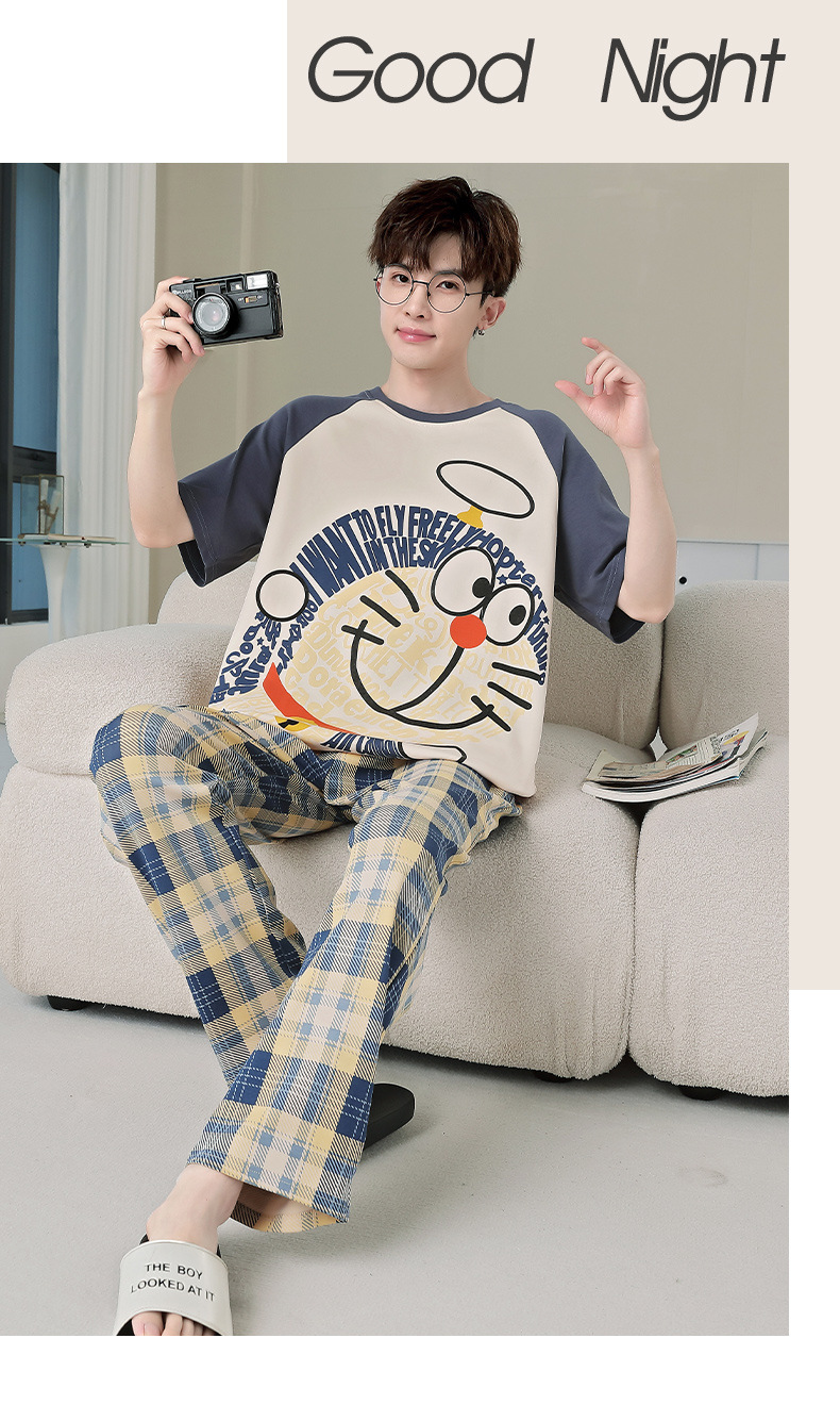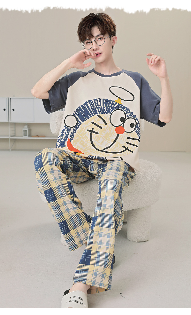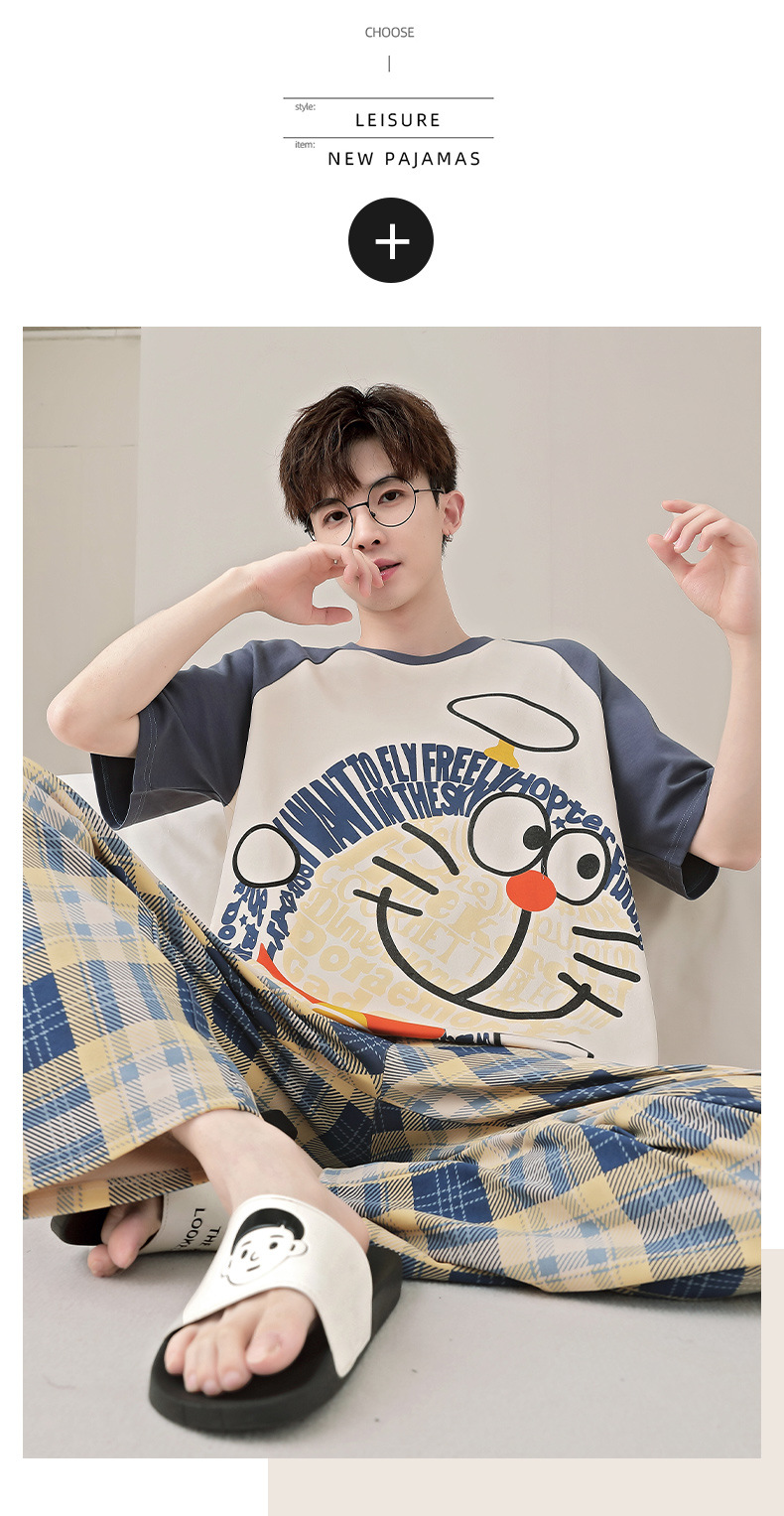 남성 잠옷 여름 순수 코튼 반팔 2025 새로운 얇은 청소년 바지 만화 대형 홈웨어 세트