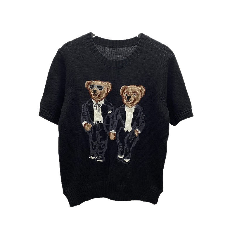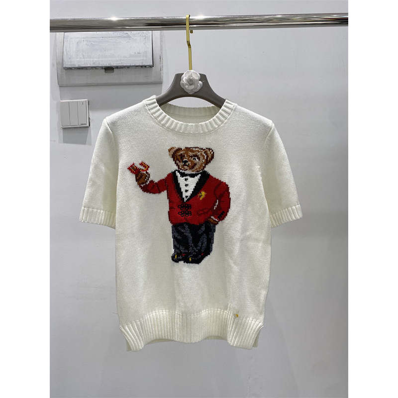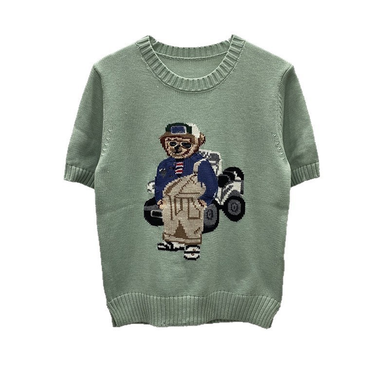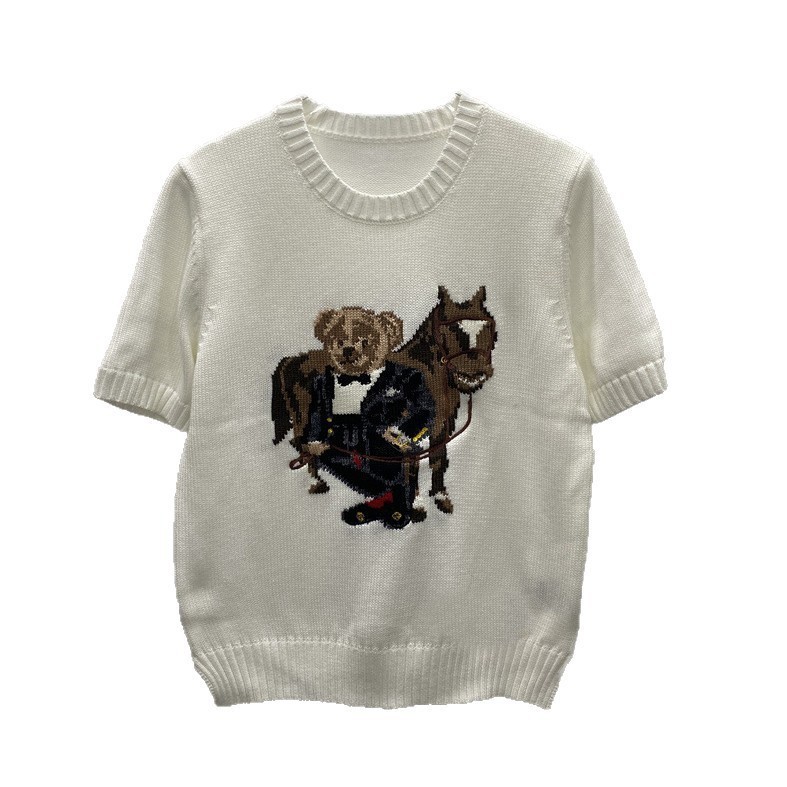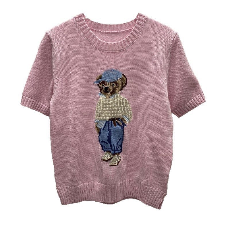 고품질의 새로운 만화 자카드 곰 스웨터 여성용 반팔 탑 2025 핫 스타일 대외 무역 AliExpress 여성 의류