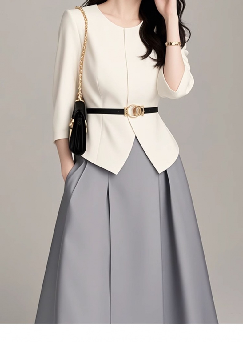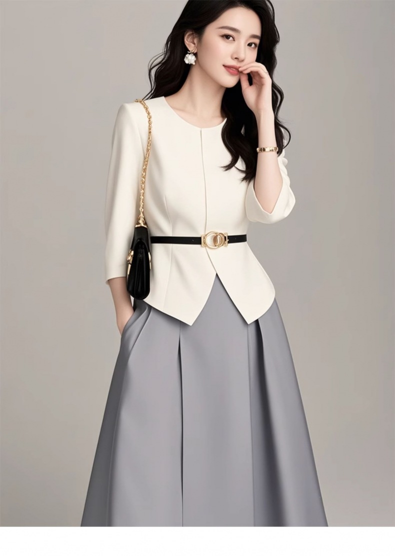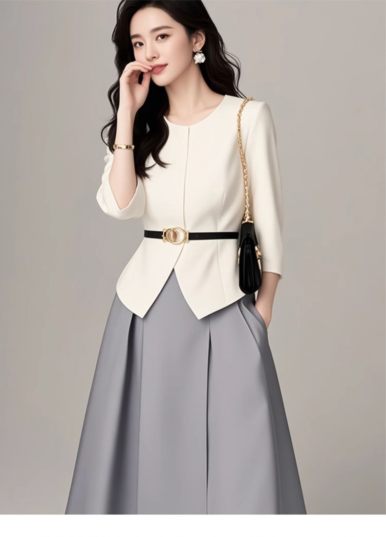 봄여름 한국 스타일 의상, 고급스럽고 여성스러운 느낌, 중요한 행사에 적합한, 세련된 분위기, 투피스 스커트 세트, 허리를 잘록하게 잡아주는 디자인