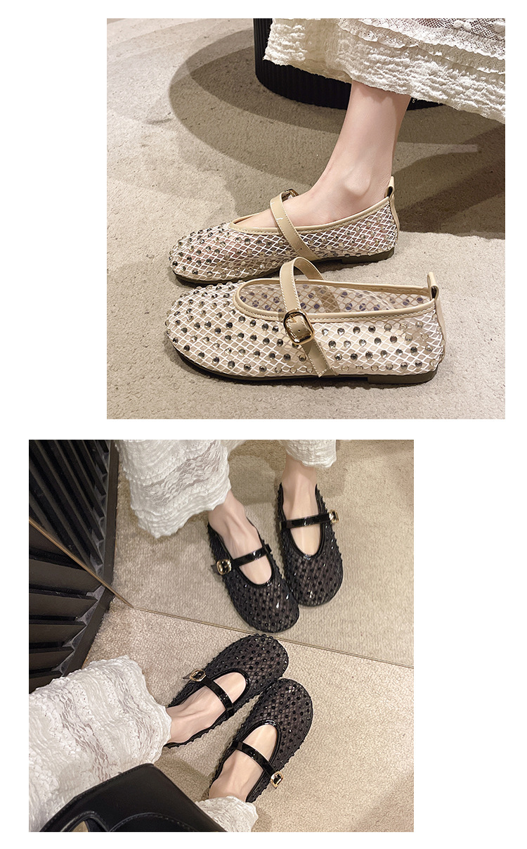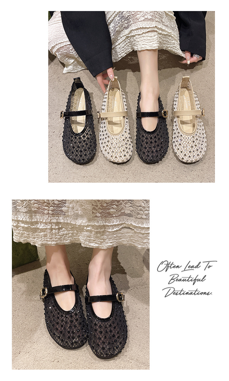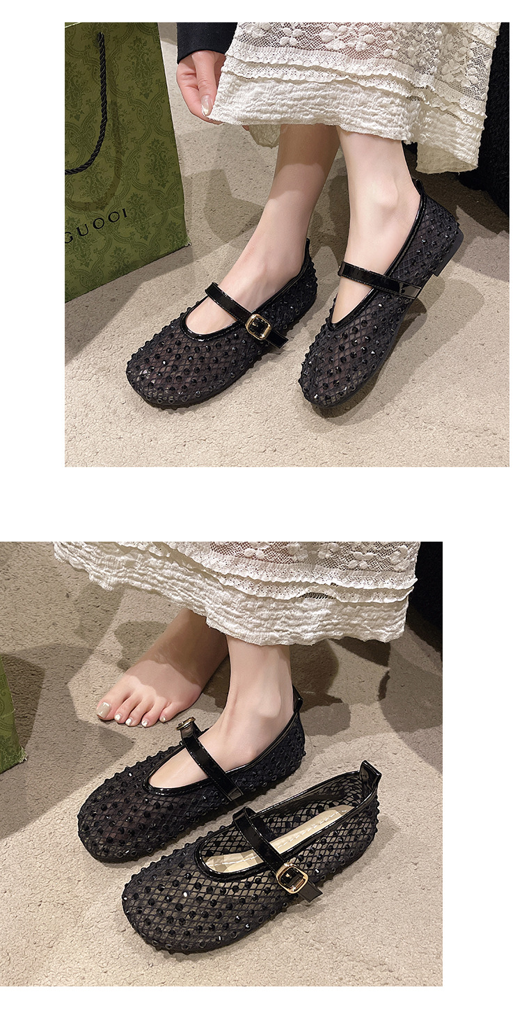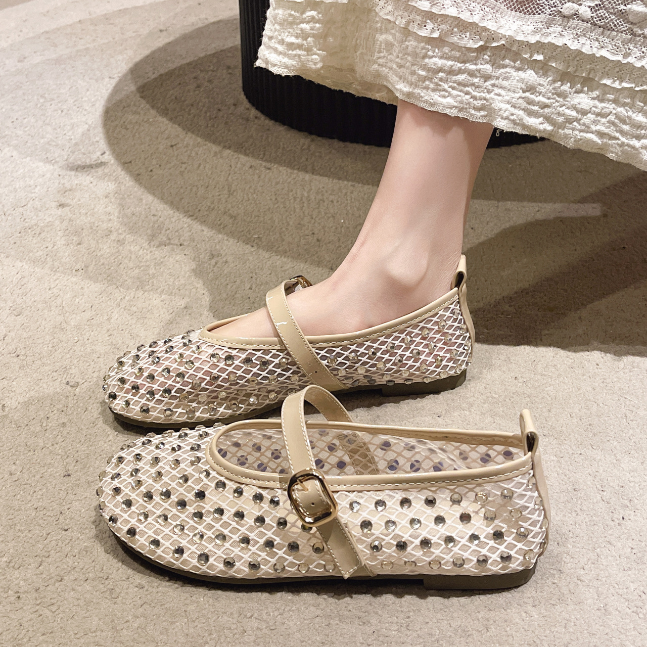 여성을위한 라인 석 메쉬 통기성 샌들 2025 봄과 여름 새로운 스타일 플랫 바닥 편안한 원 버클 펌프 메리 제인 신발