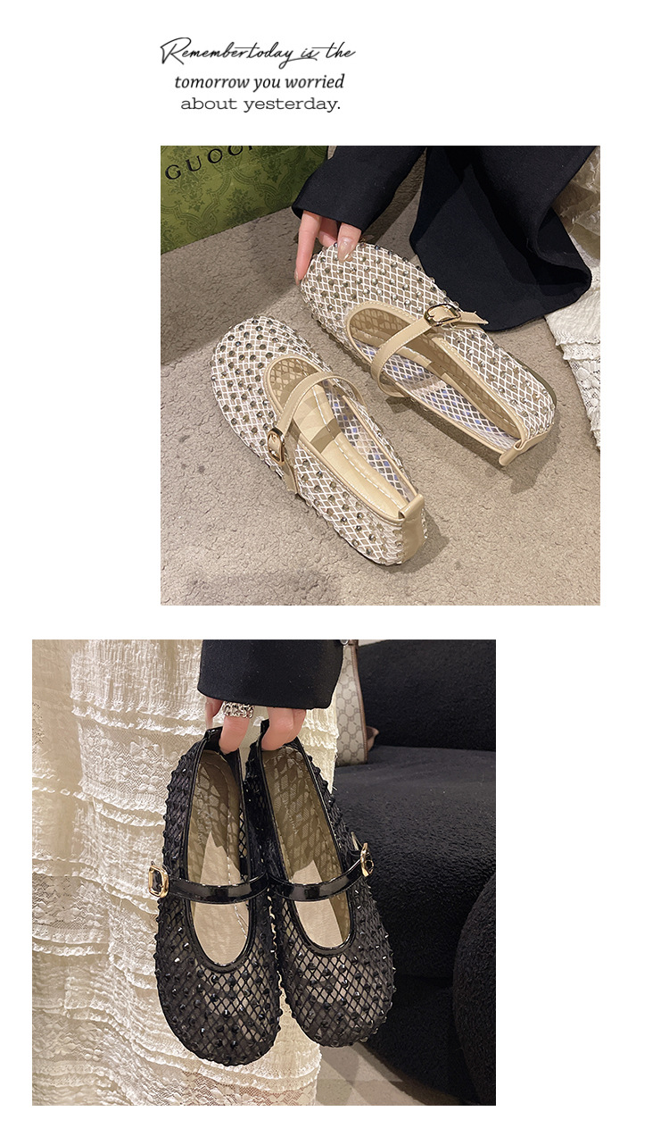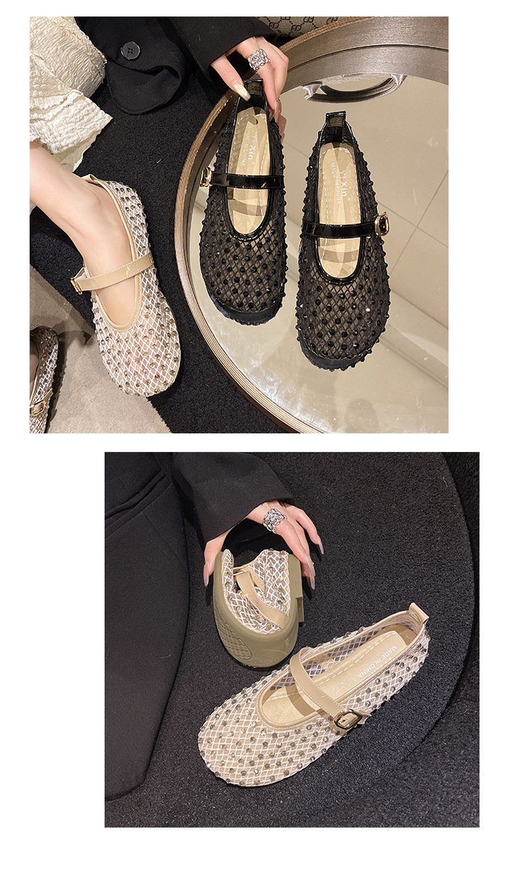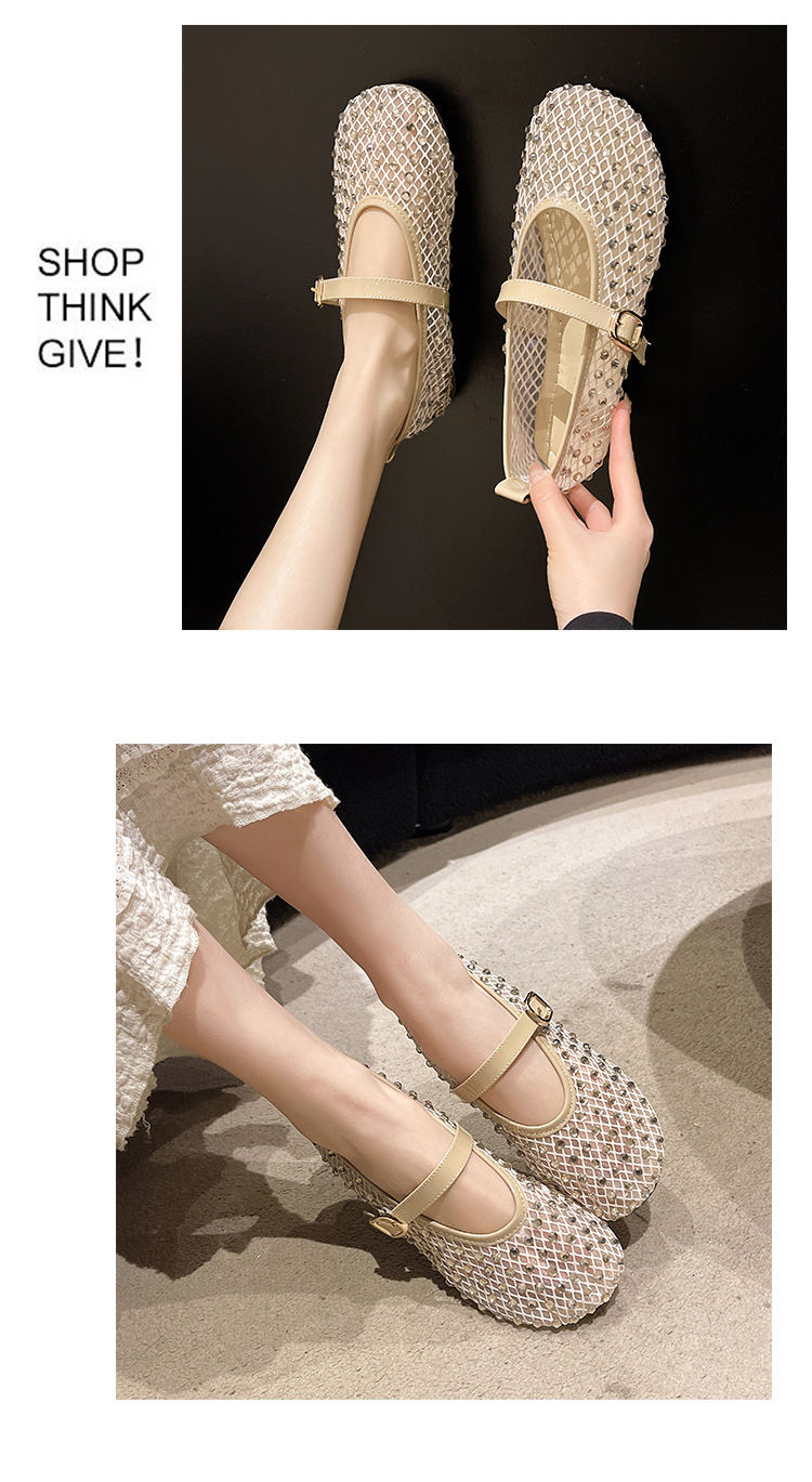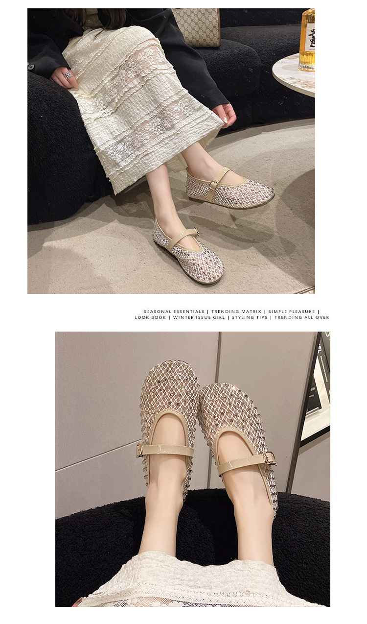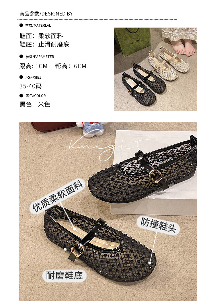 여성을위한 라인 석 메쉬 통기성 샌들 2025 봄과 여름 새로운 스타일 플랫 바닥 편안한 원 버클 펌프 메리 제인 신발