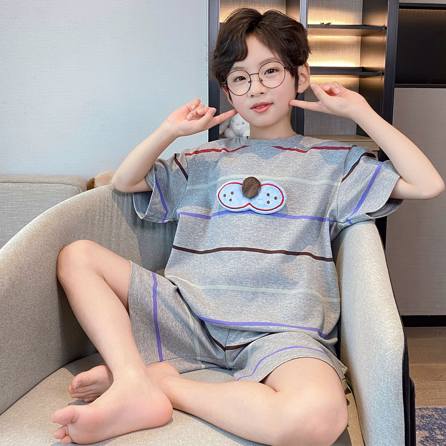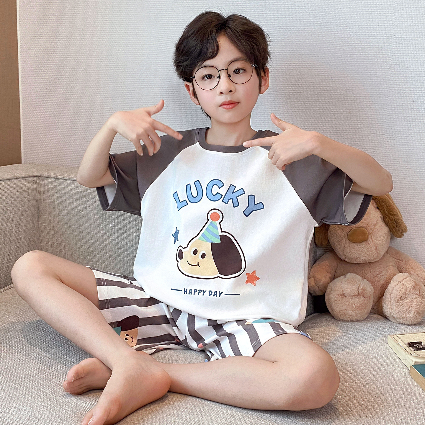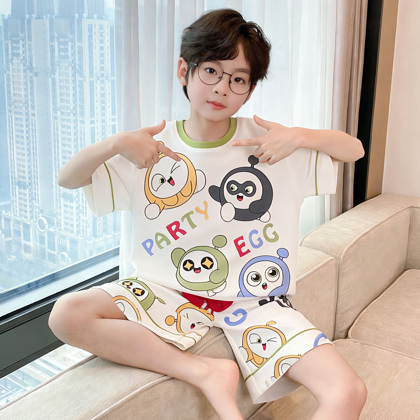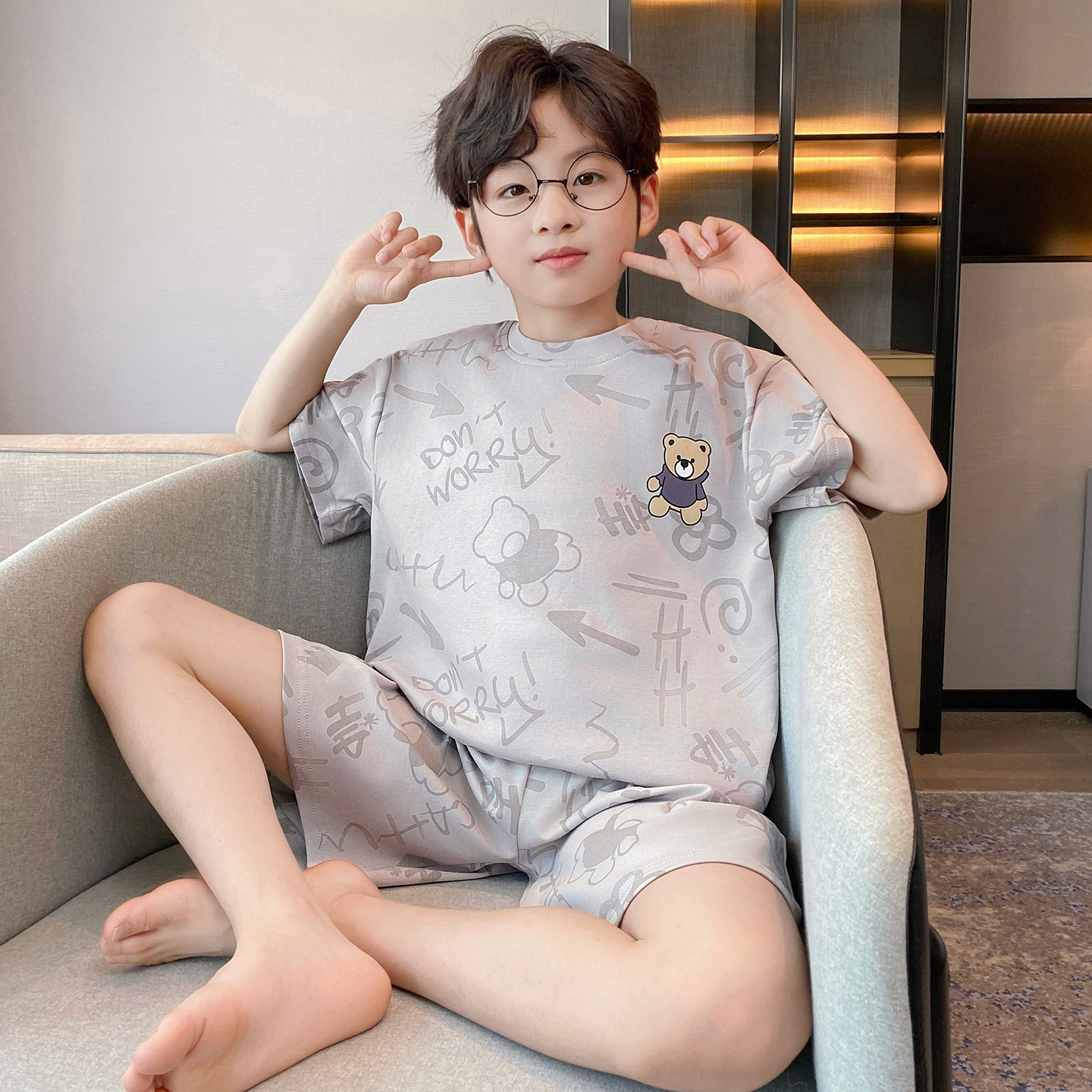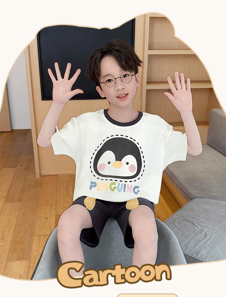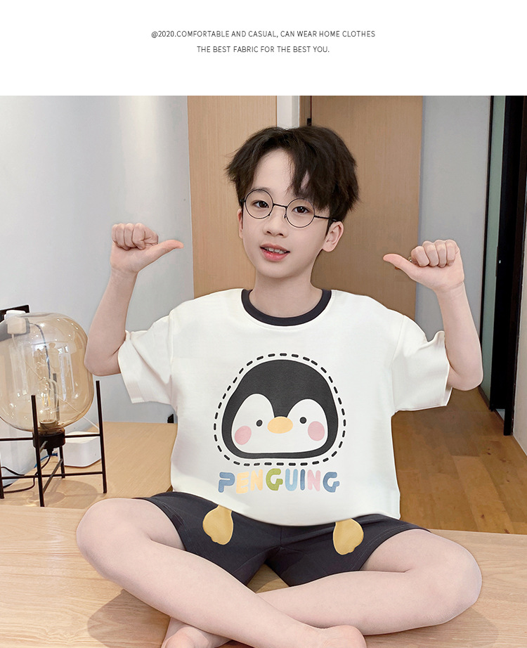 소년 잠옷 여름 반팔 얇은 순면 중대형 어린이 여름 소년 면화 어린이 부모-자식 가정복