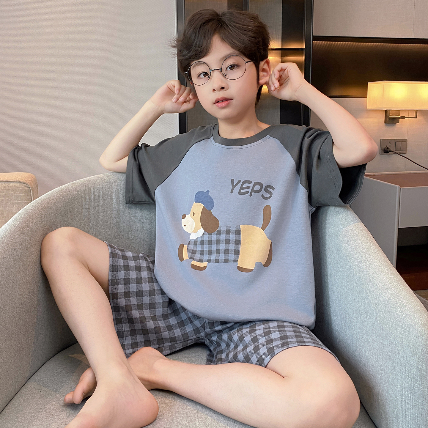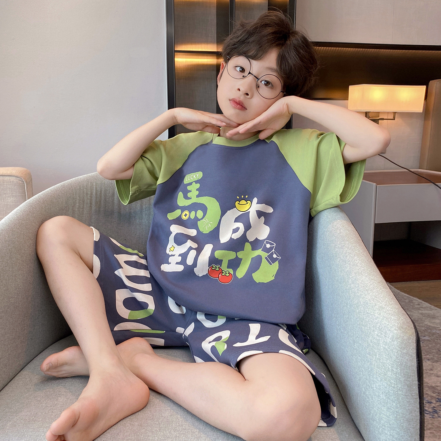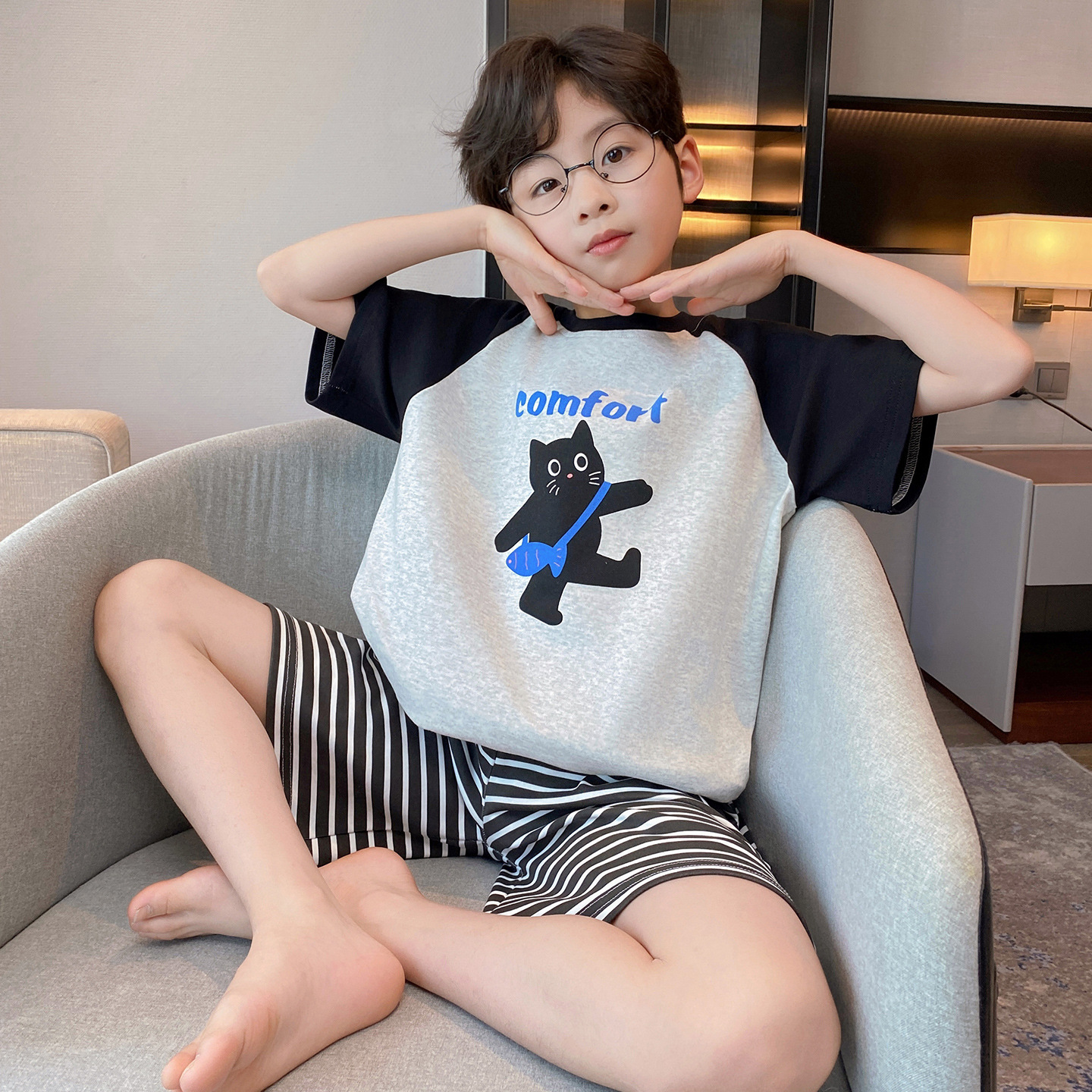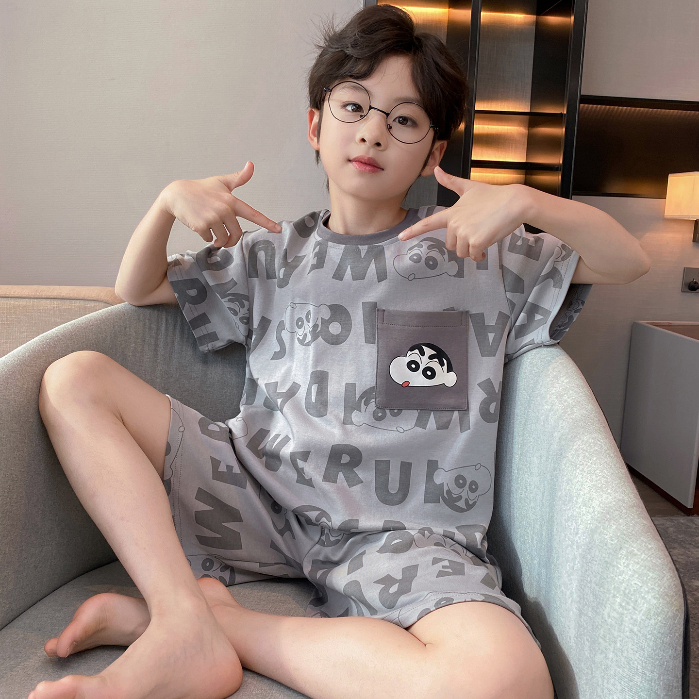소년 잠옷 여름 반팔 얇은 순면 중대형 어린이 여름 소년 면화 어린이 부모-자식 가정복