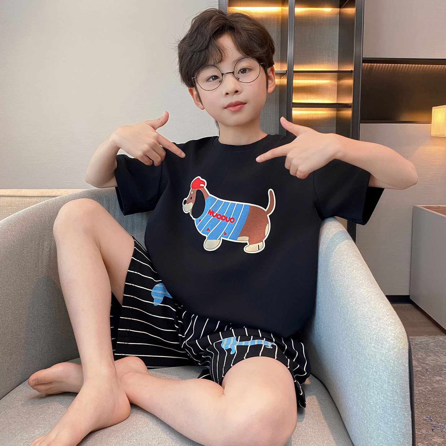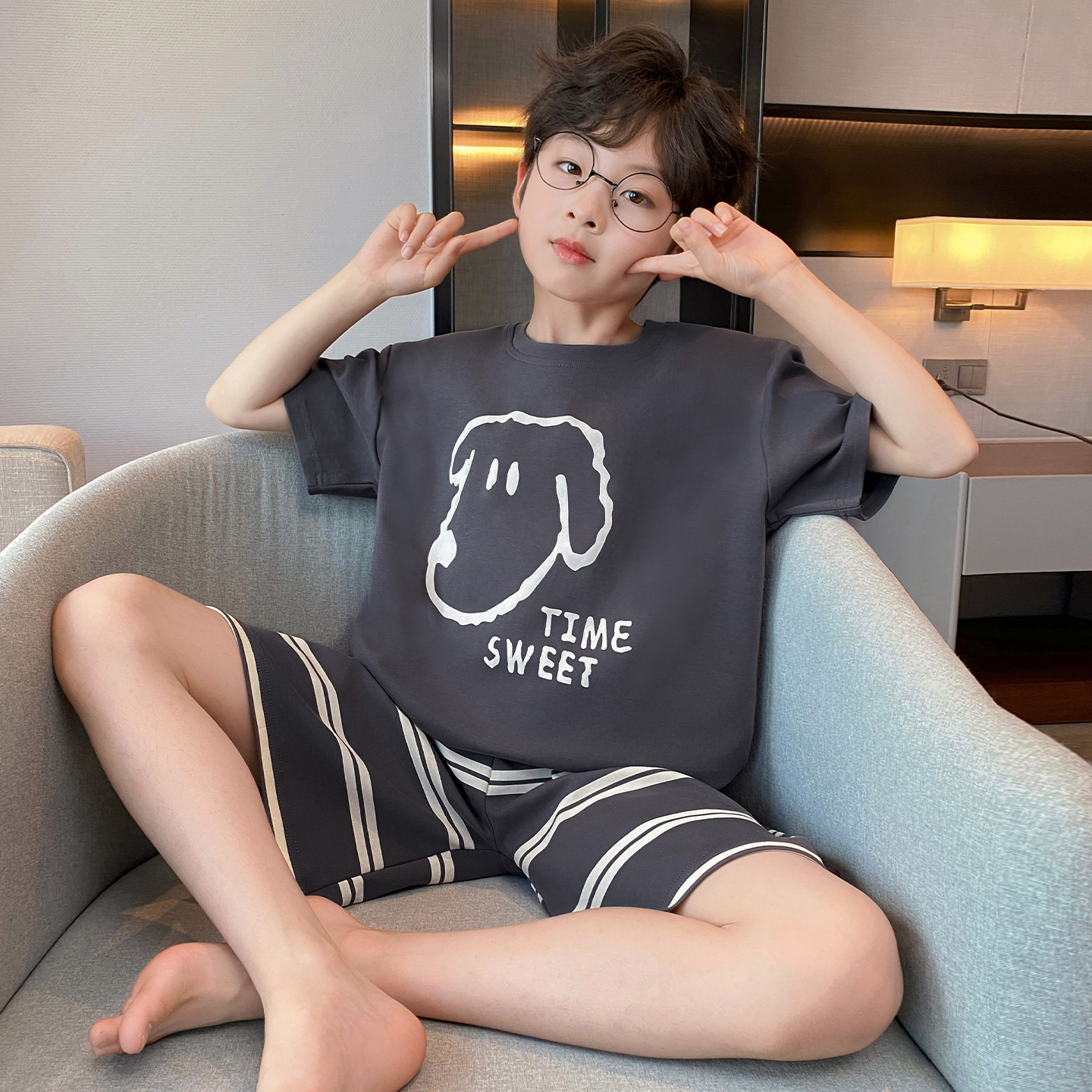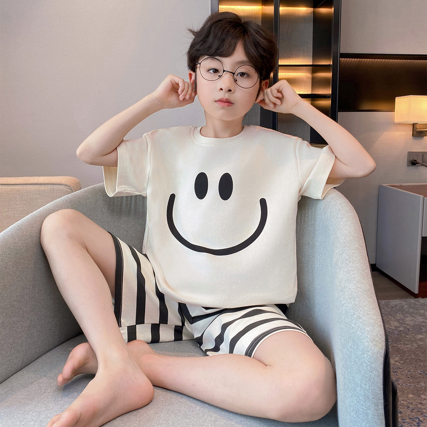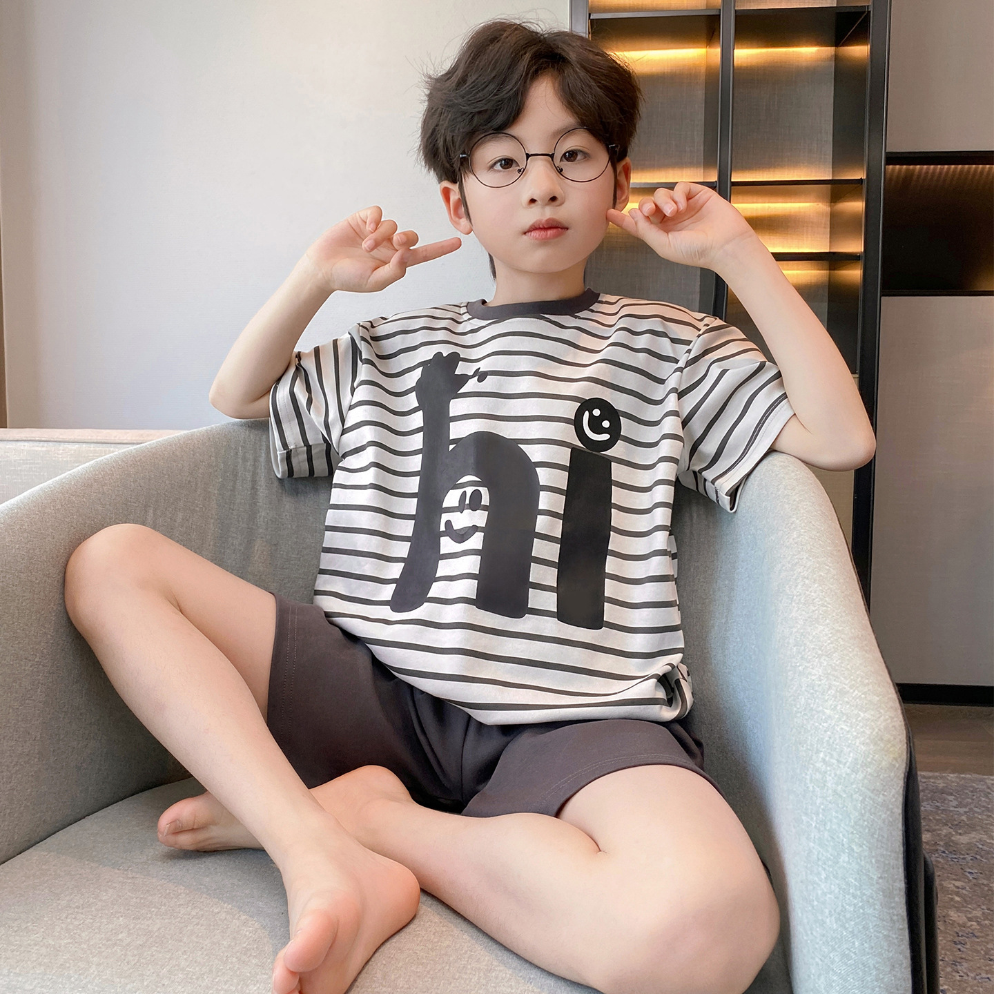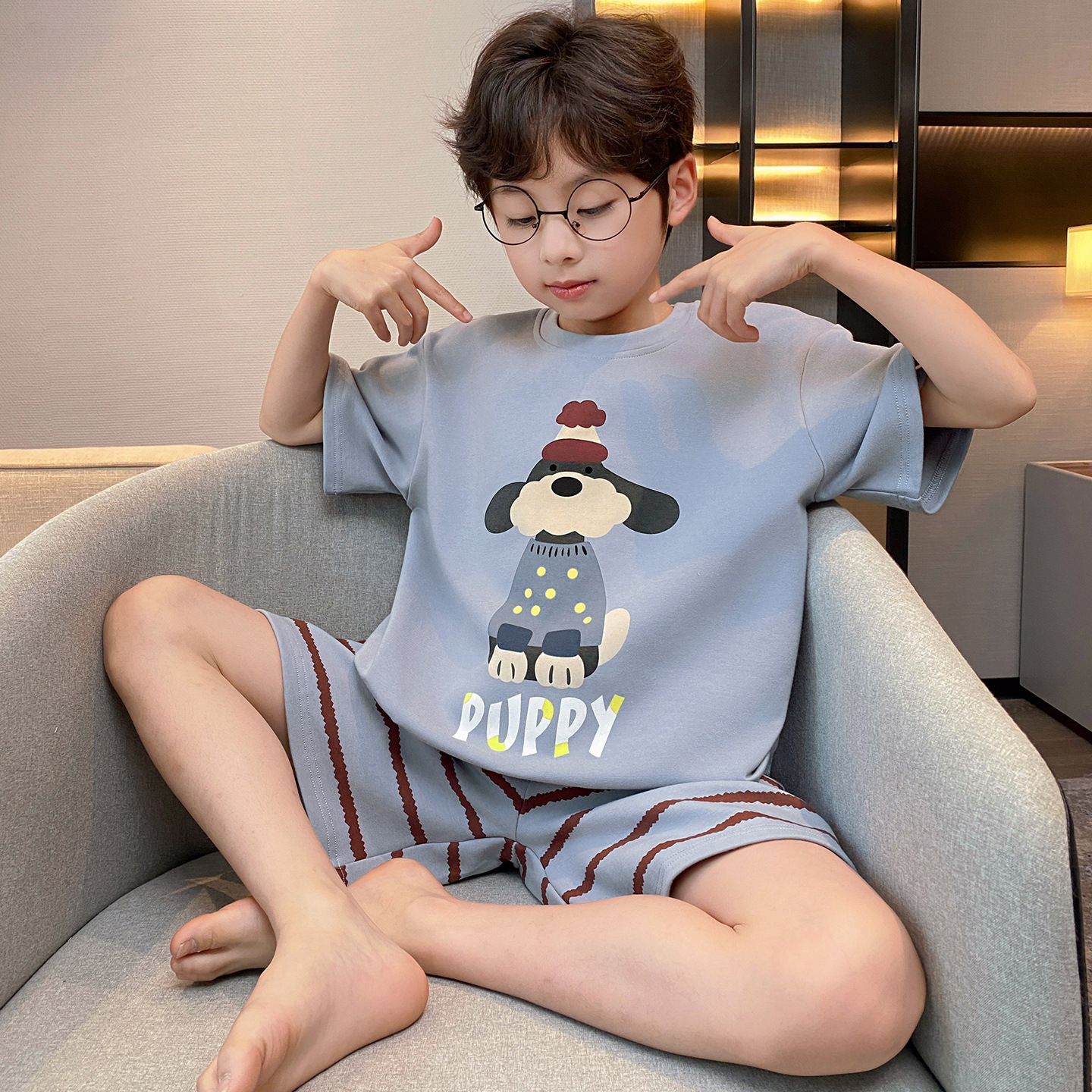 소년 잠옷 여름 반팔 얇은 순면 중대형 어린이 여름 소년 면화 어린이 부모-자식 가정복