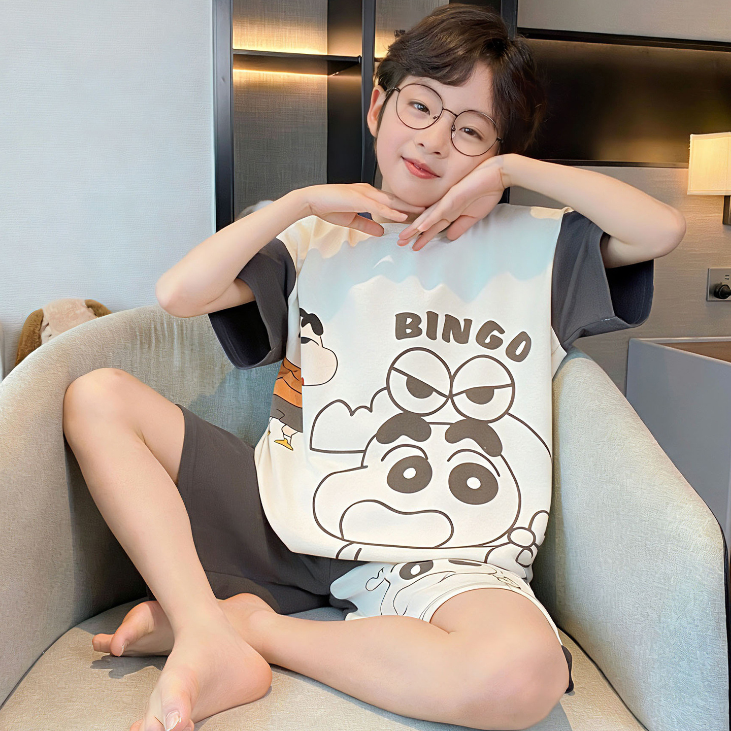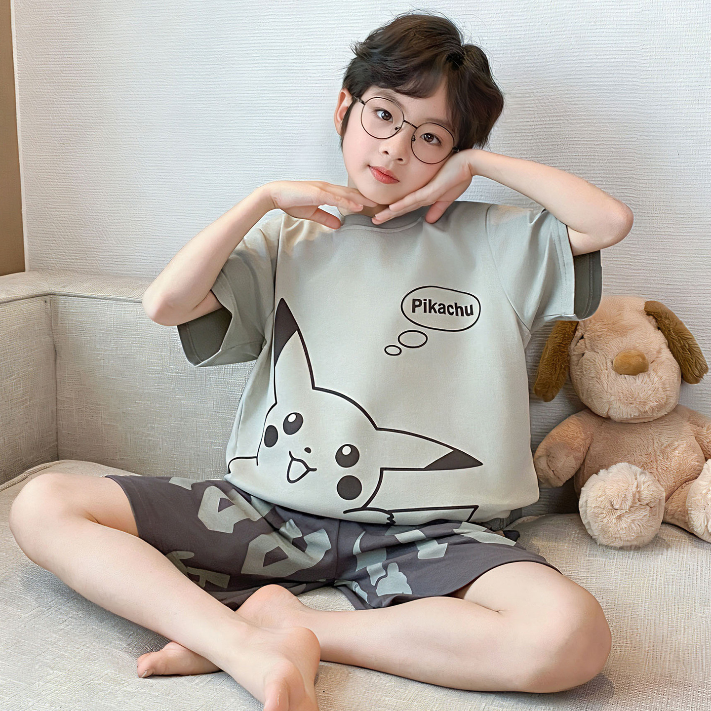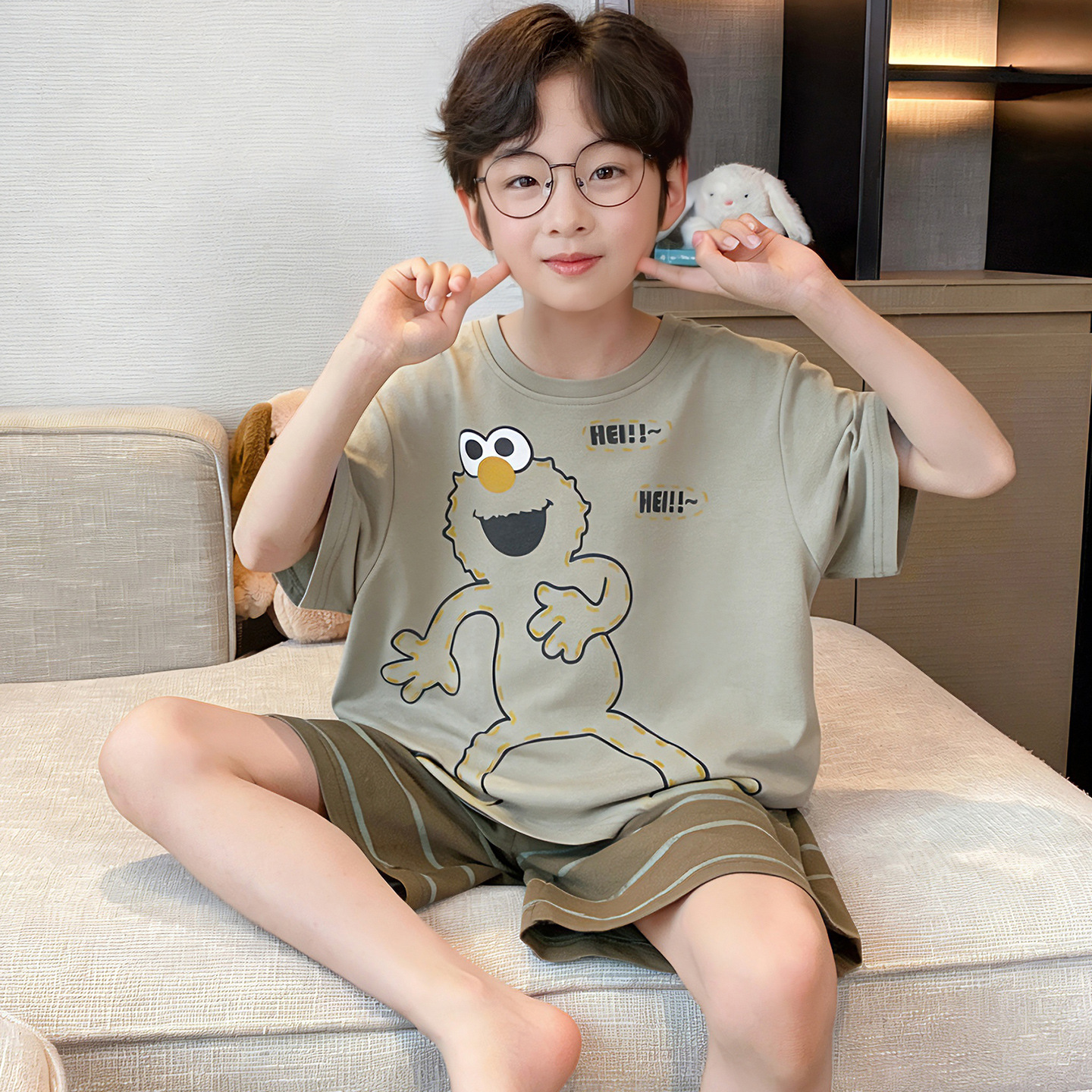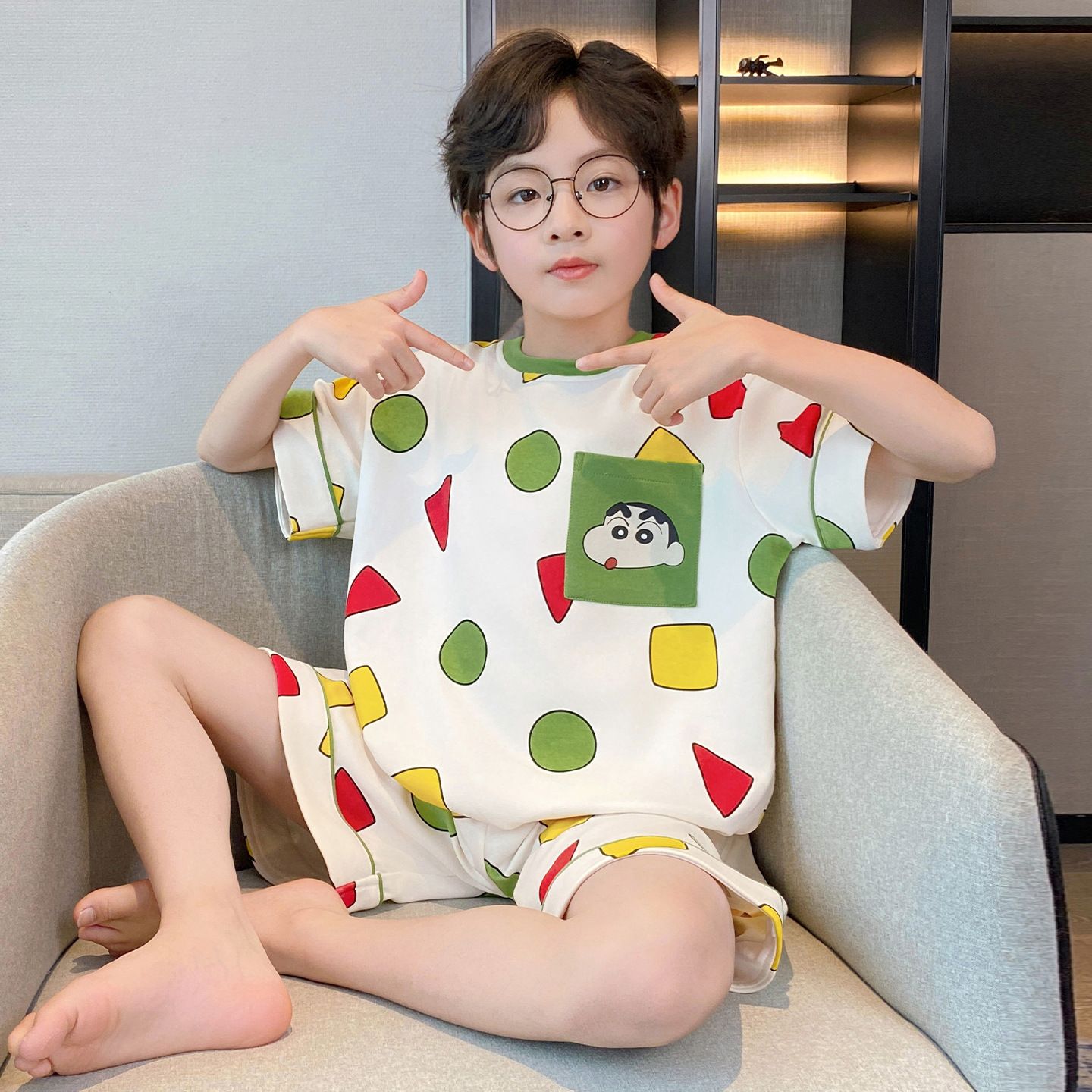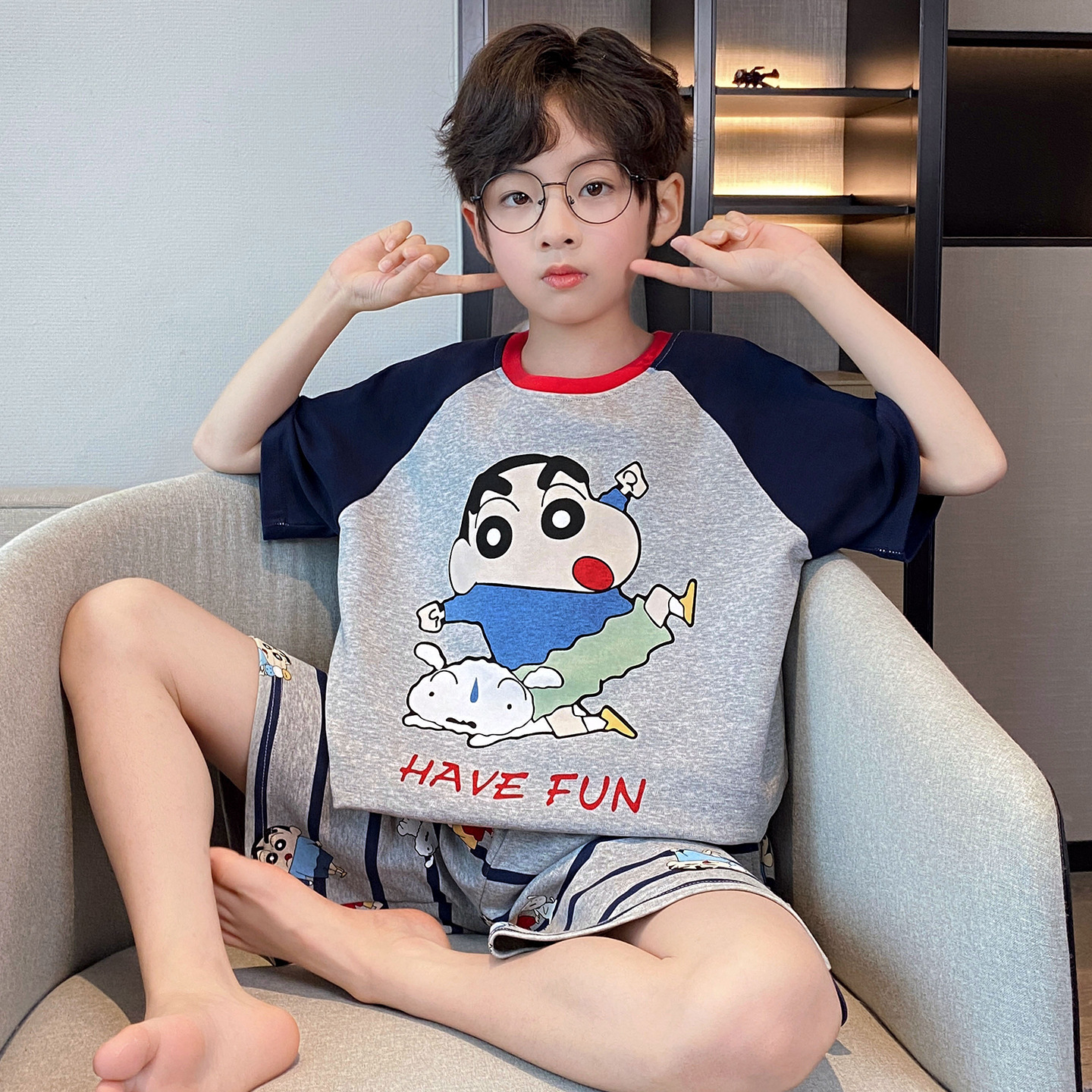 소년 잠옷 여름 반팔 얇은 순면 중대형 어린이 여름 소년 면화 어린이 부모-자식 가정복