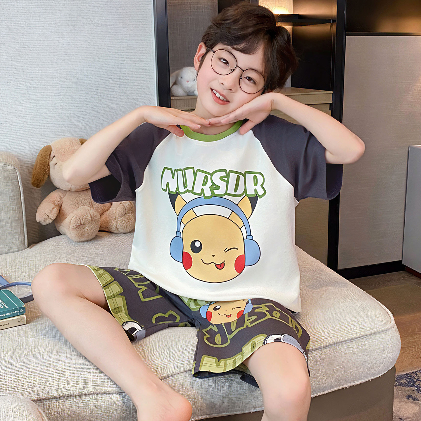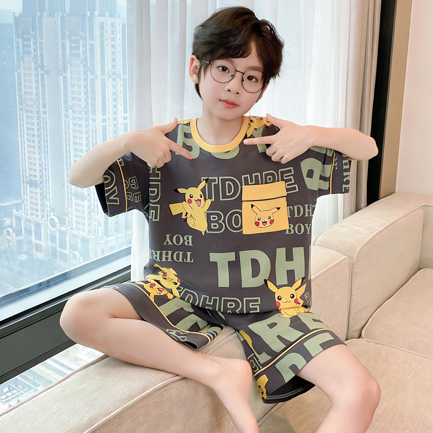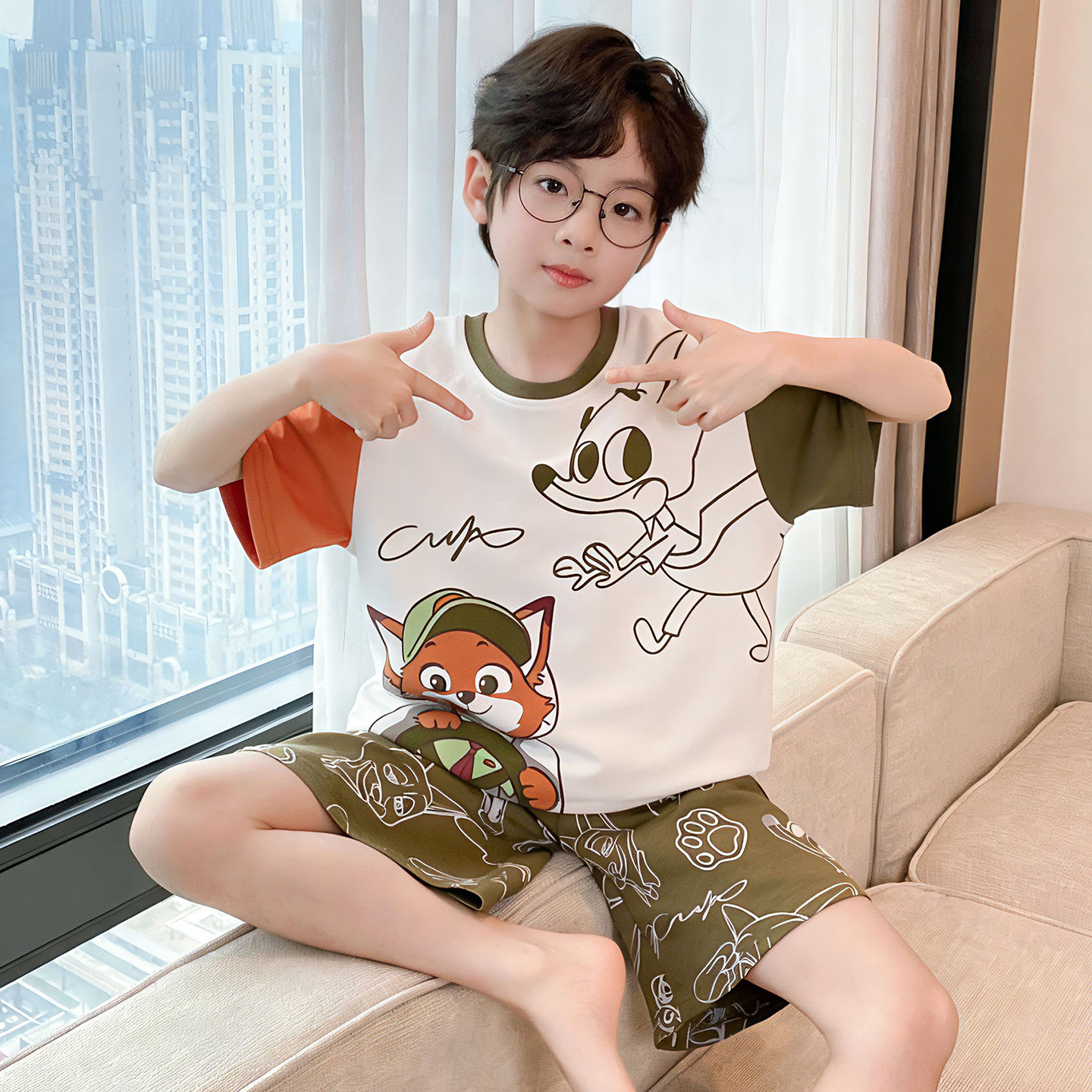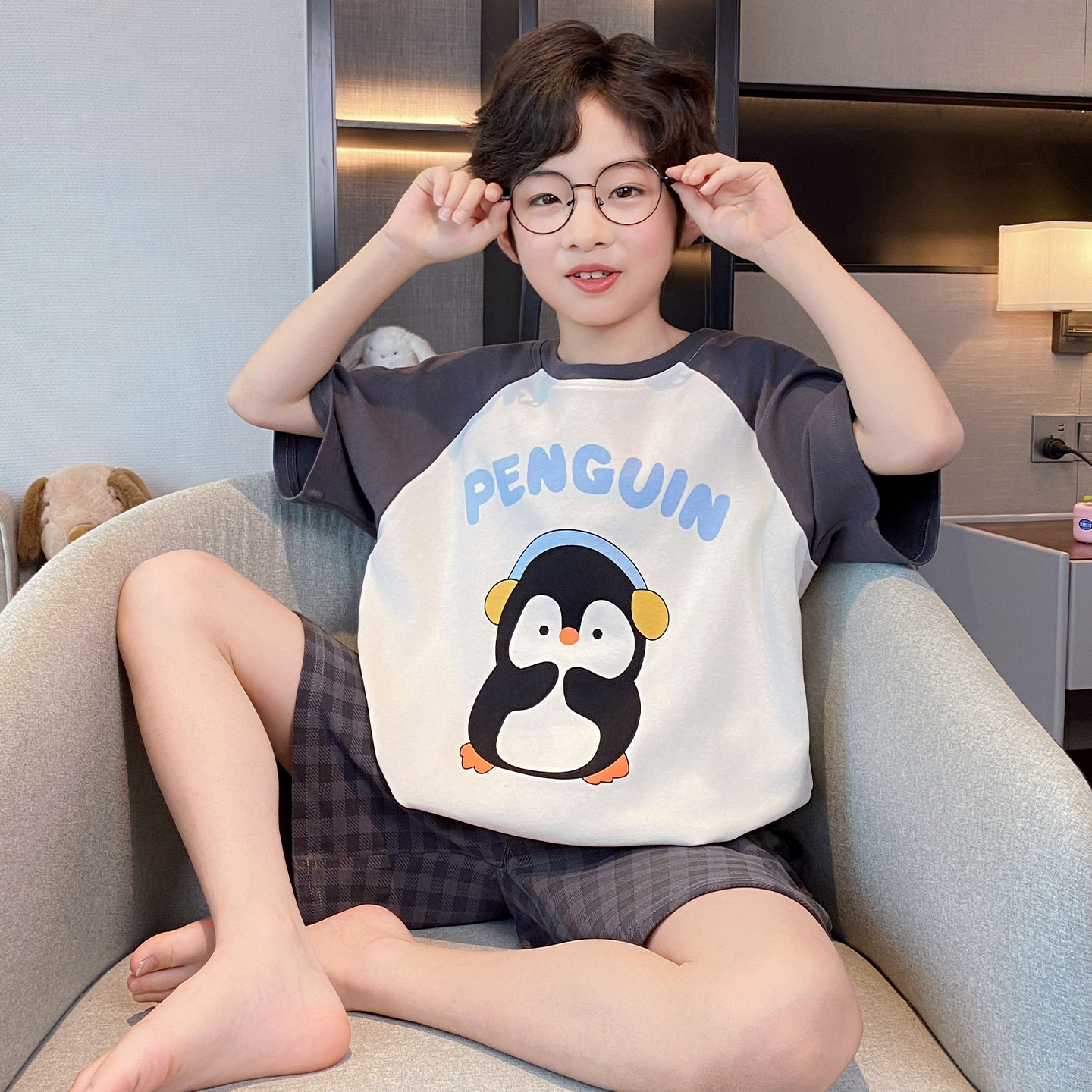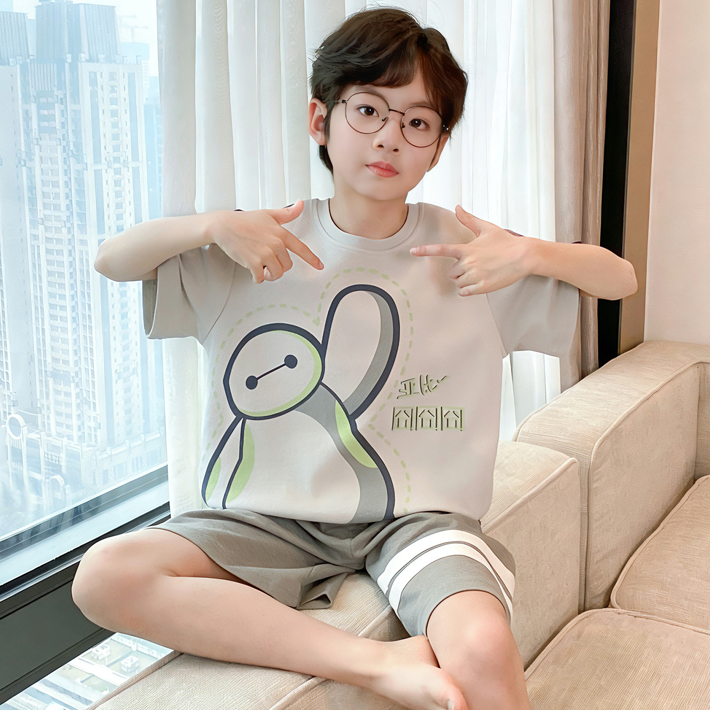 소년 잠옷 여름 반팔 얇은 순면 중대형 어린이 여름 소년 면화 어린이 부모-자식 가정복스토어 가기