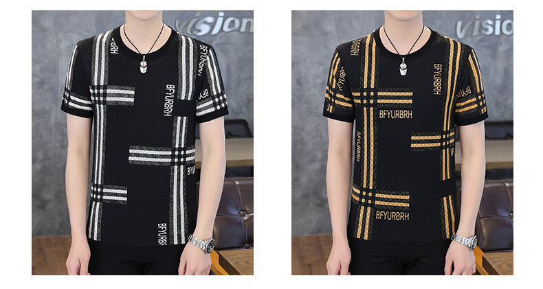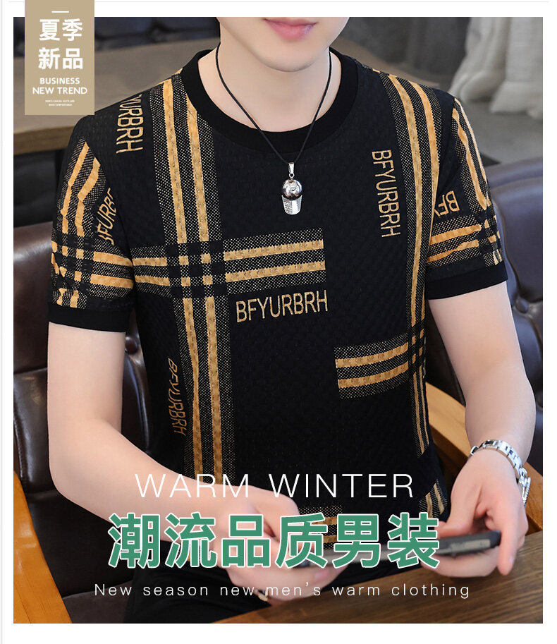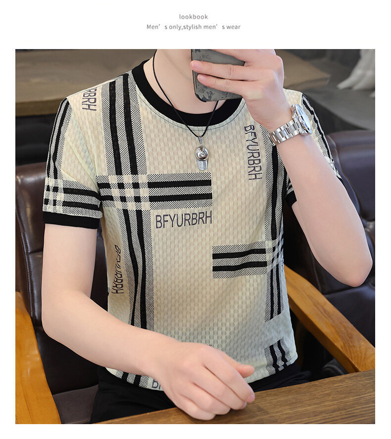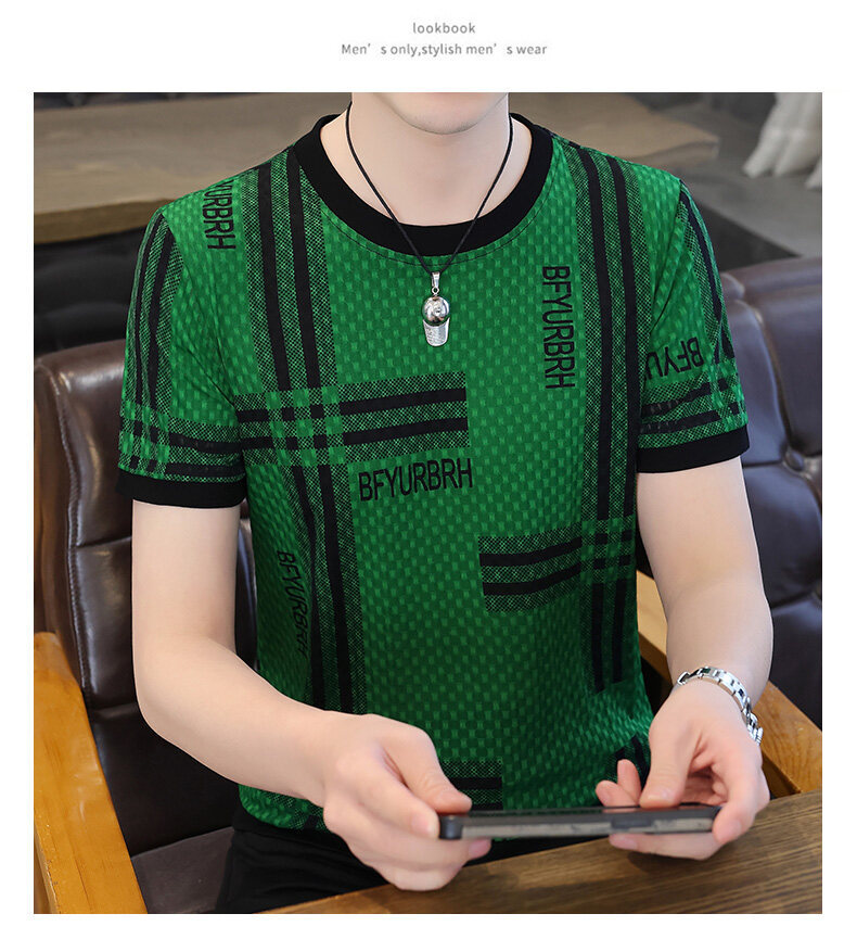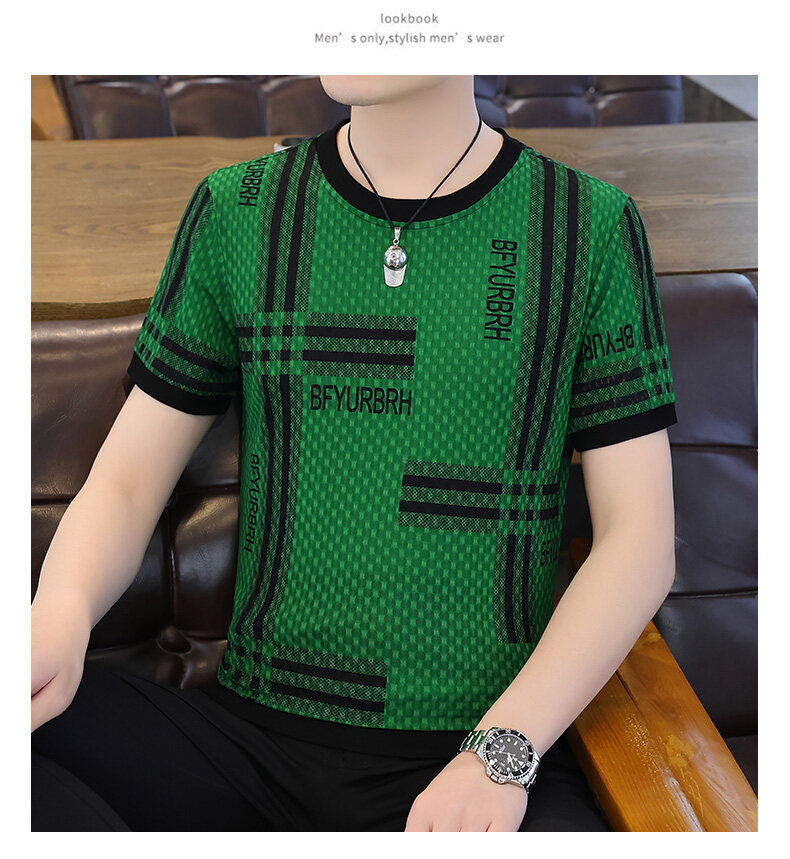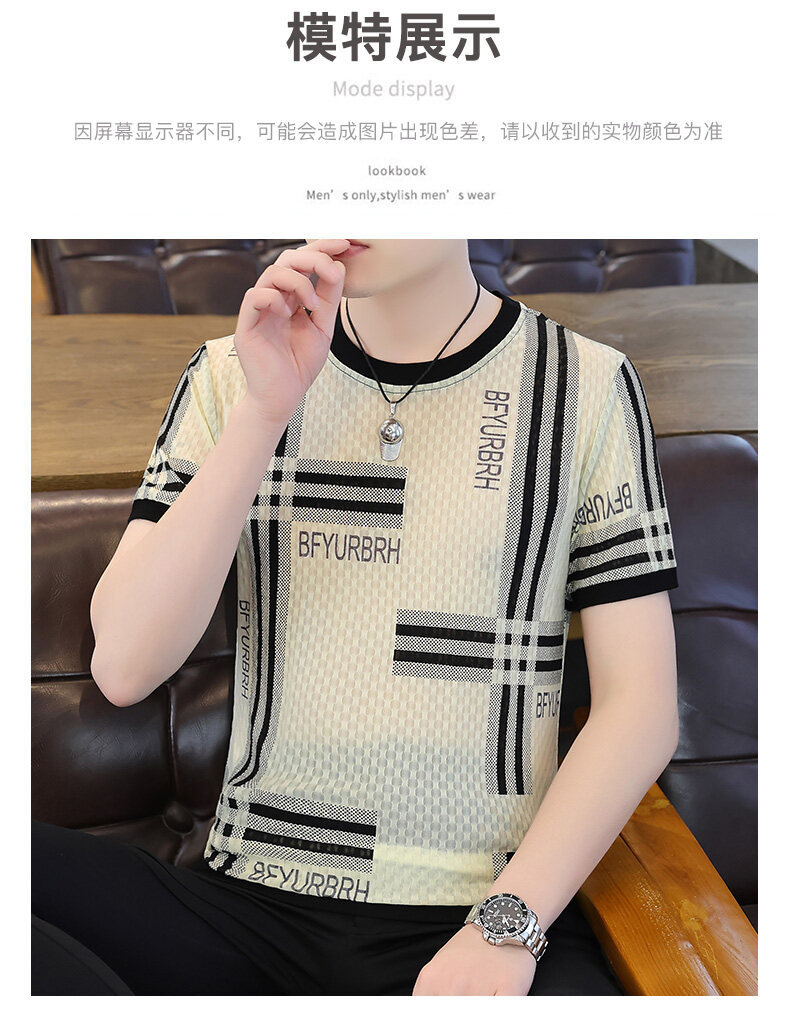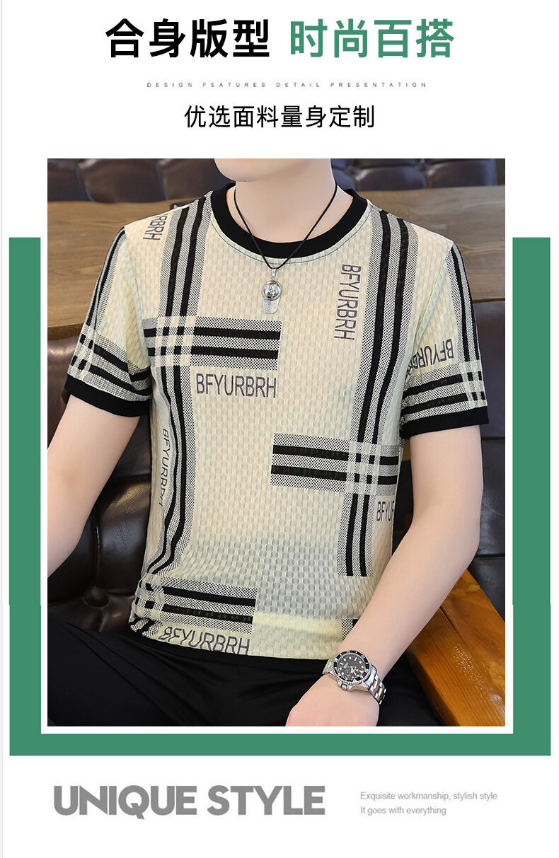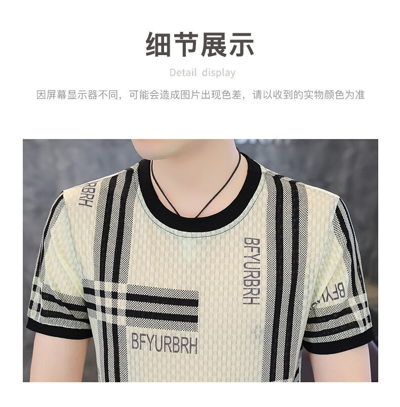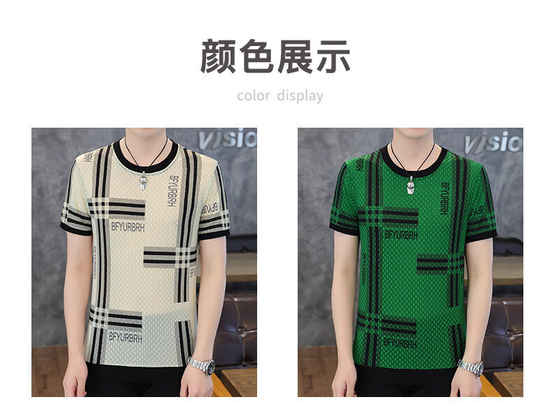 아이스 실크 반팔 티셔츠 남성 트렌드 2024 여름 남성 패션 캐주얼 반팔 탑 통기성 라운드 넥 티셔츠 트렌드