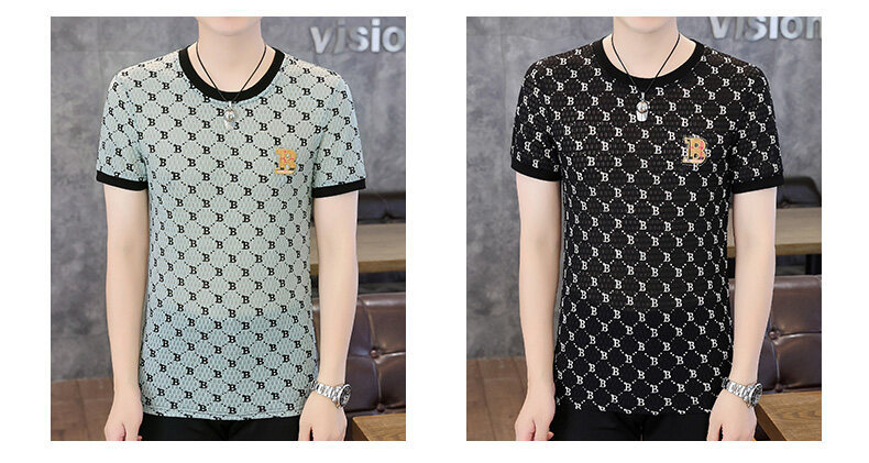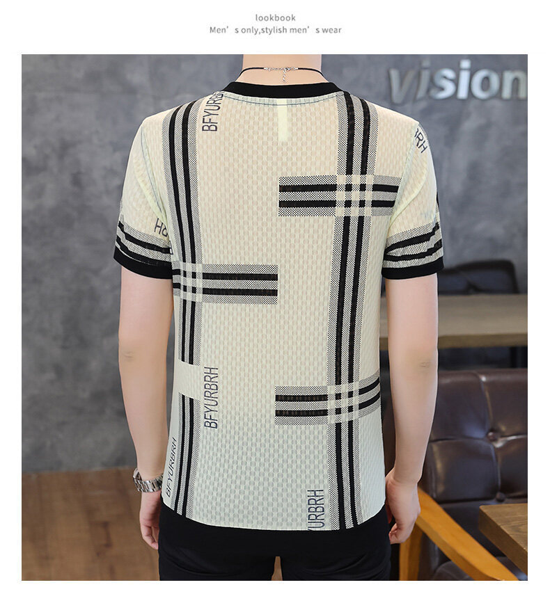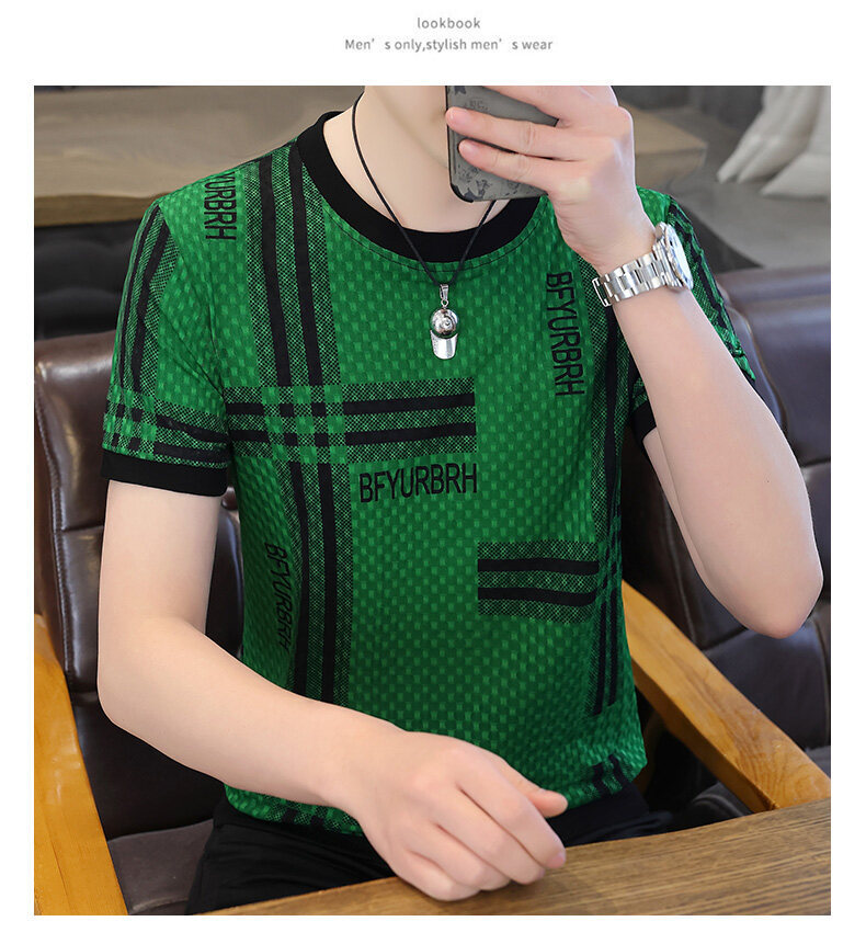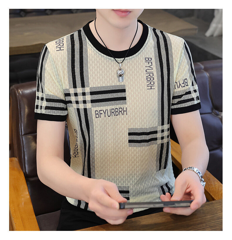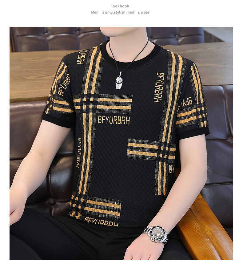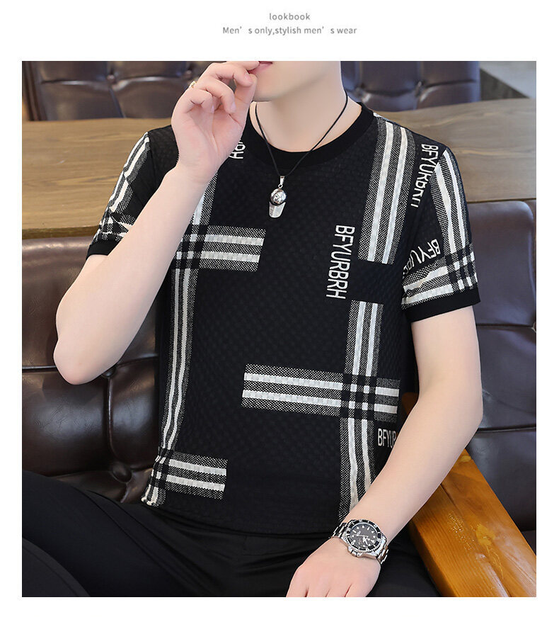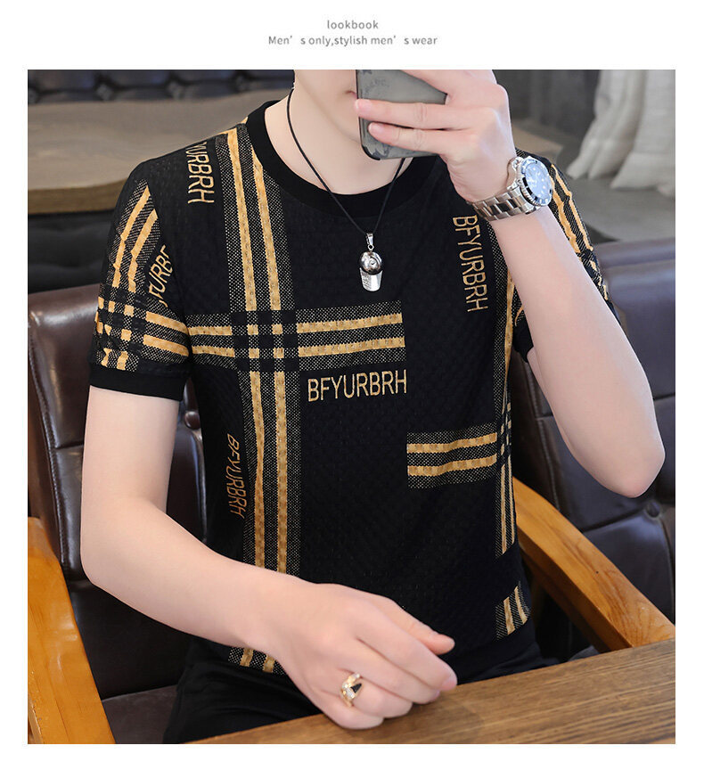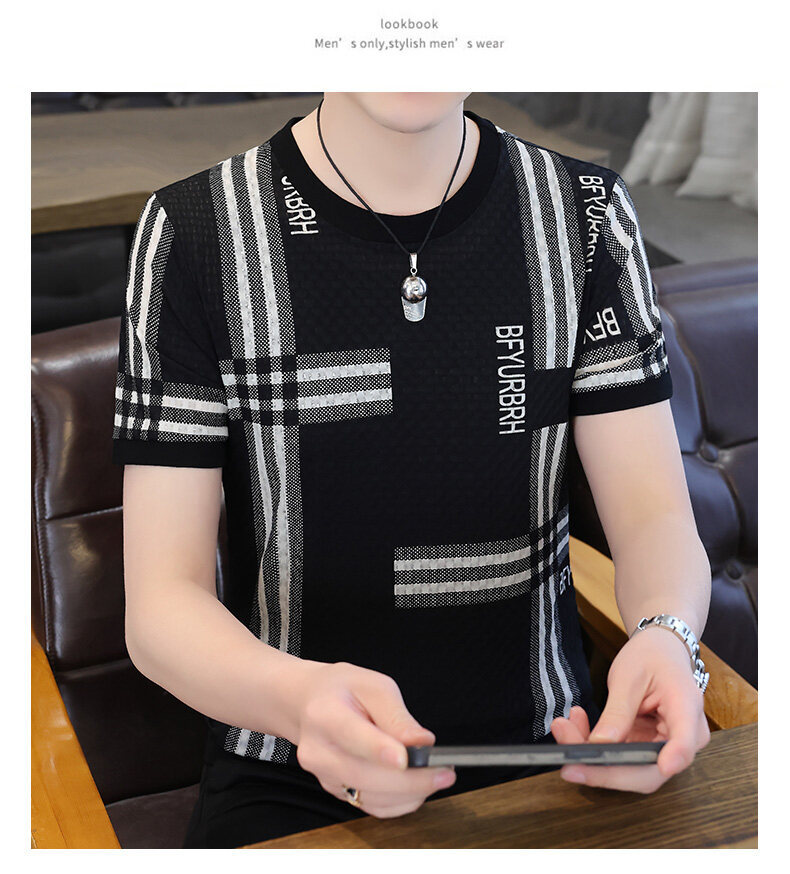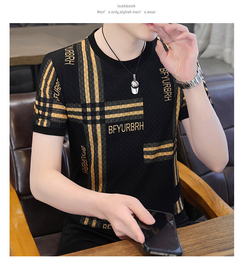 아이스 실크 반팔 티셔츠 남성 트렌드 2024 여름 남성 패션 캐주얼 반팔 탑 통기성 라운드 넥 티셔츠 트렌드