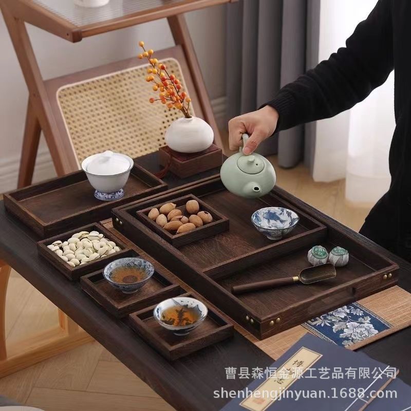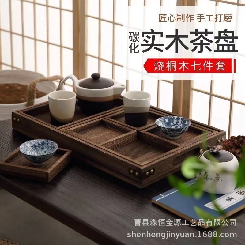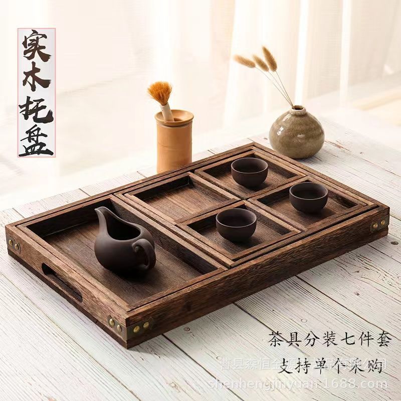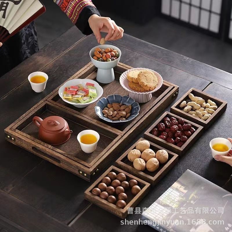 중국식 다중 그리드 차 트레이, 단단한 나무로 된 차와 스낵을 끓이는 난로, 7피스 트레이 세트, 새로운 단단한 나무 창작 숯불 트레이스토어 가기