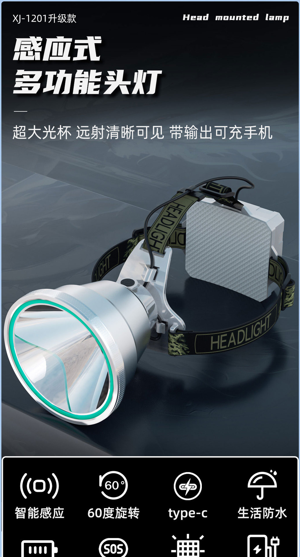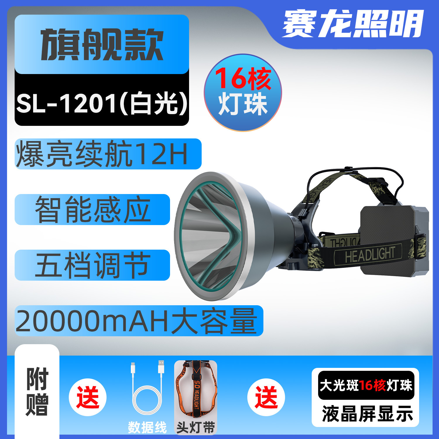 헤드 램프 긴 내구성 강한 빛 높은 루멘 리튬 배터리 야외 낚시 긴 샷 방수 야간 낚시 머리 장착 유도 작업 램프