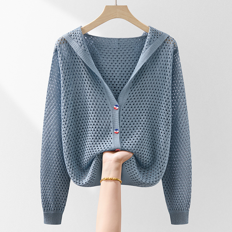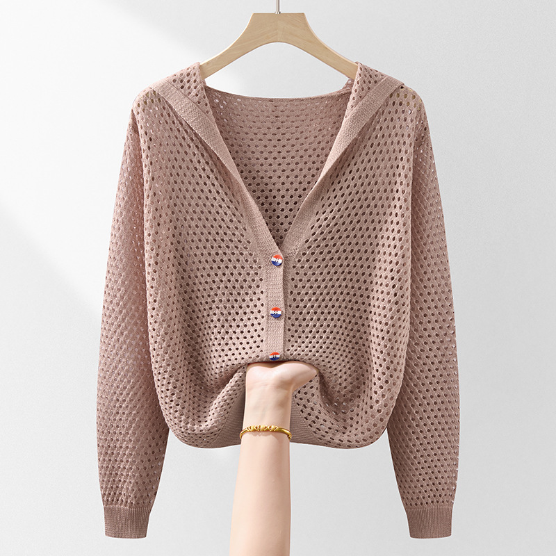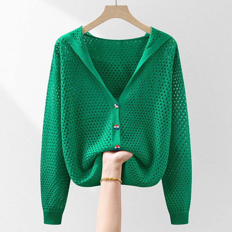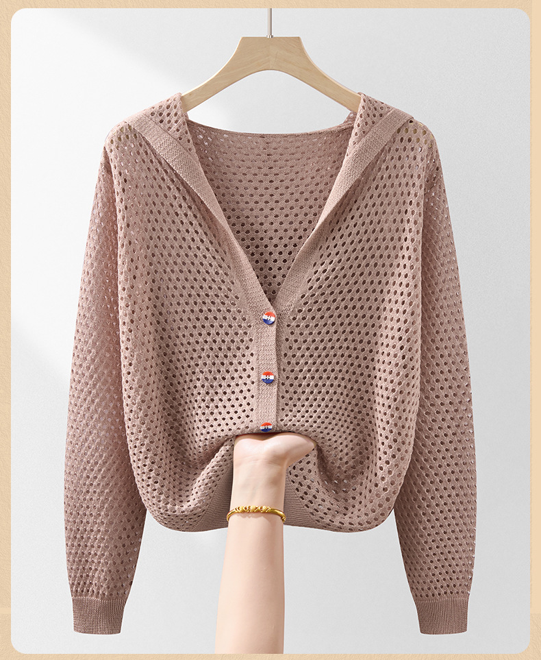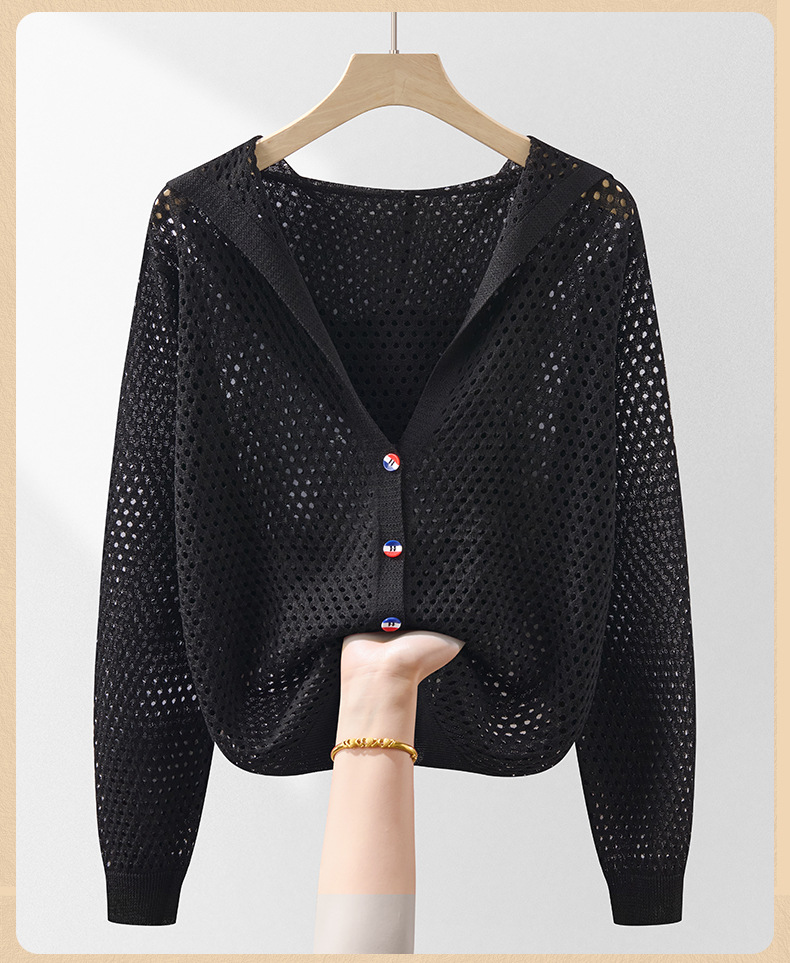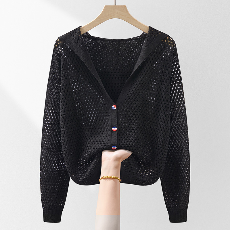 봄 여름 얇은 짧은 중공 얼음 실크 스웨터 탑 여성 긴팔 아우터 카디건 한국 스타일 루즈 후드 자켓