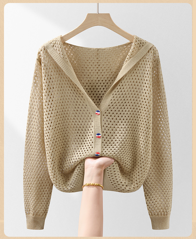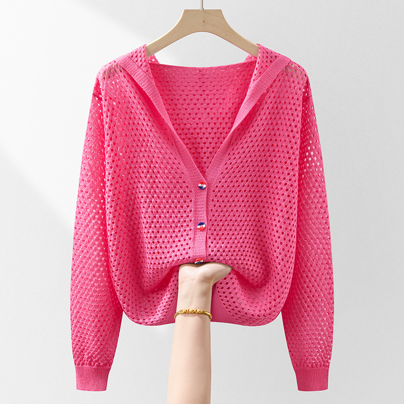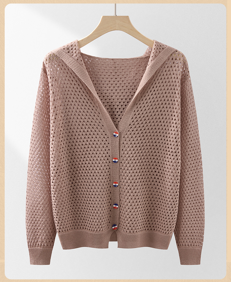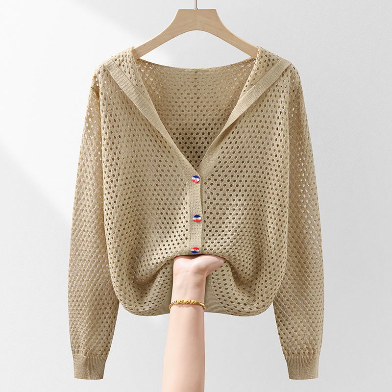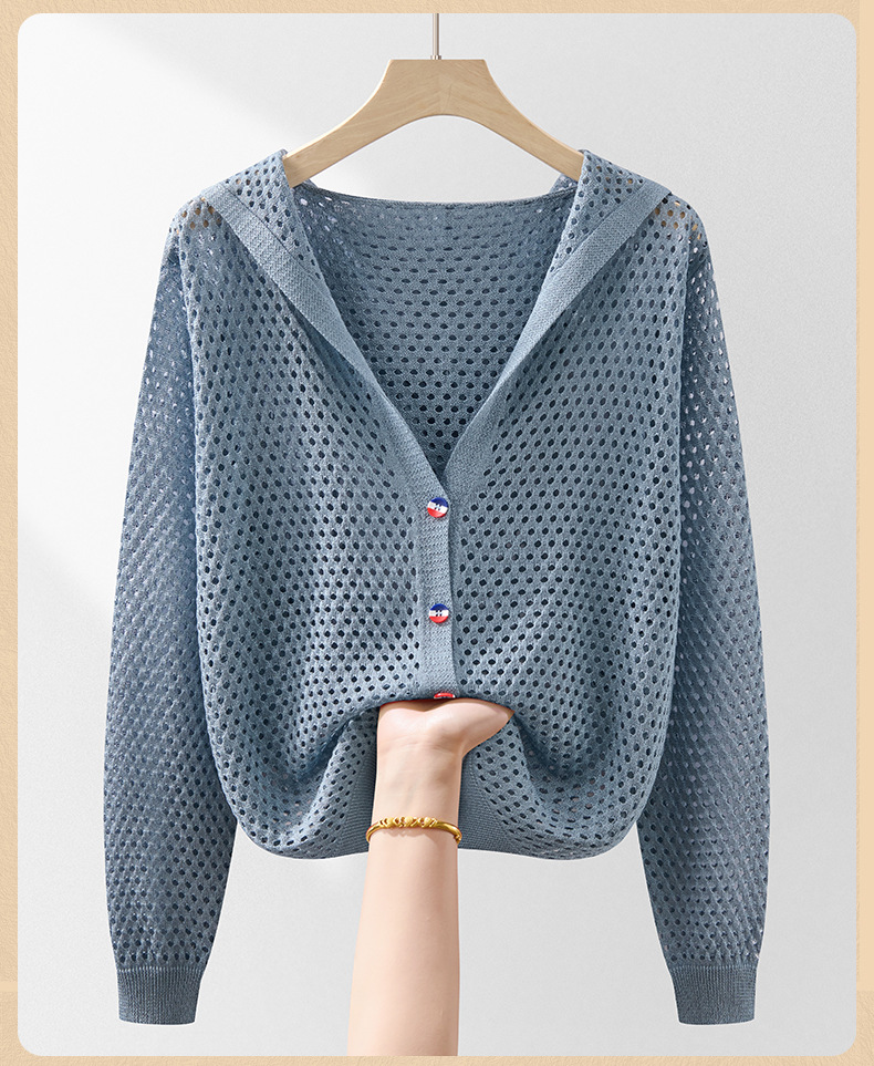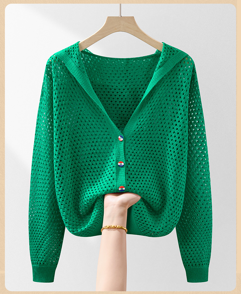 봄 여름 얇은 짧은 중공 얼음 실크 스웨터 탑 여성 긴팔 아우터 카디건 한국 스타일 루즈 후드 자켓