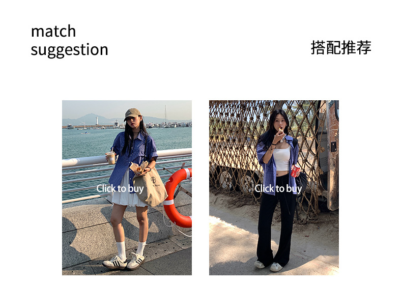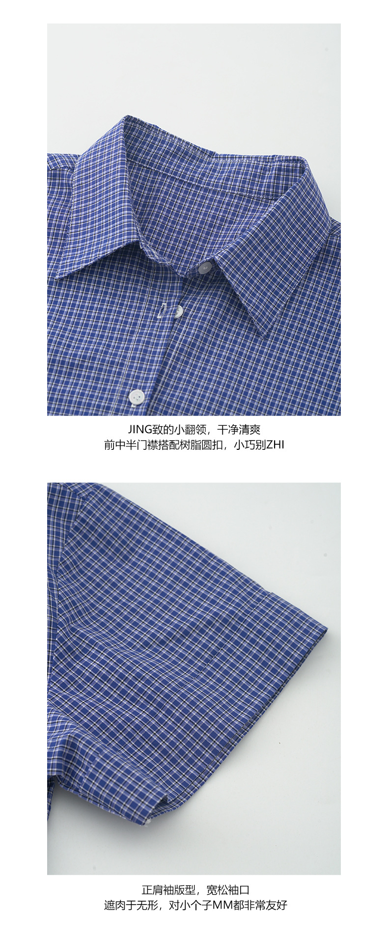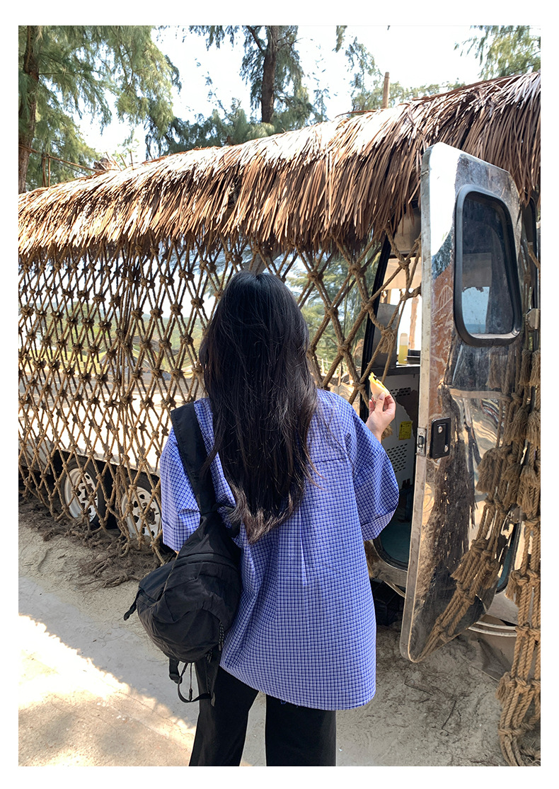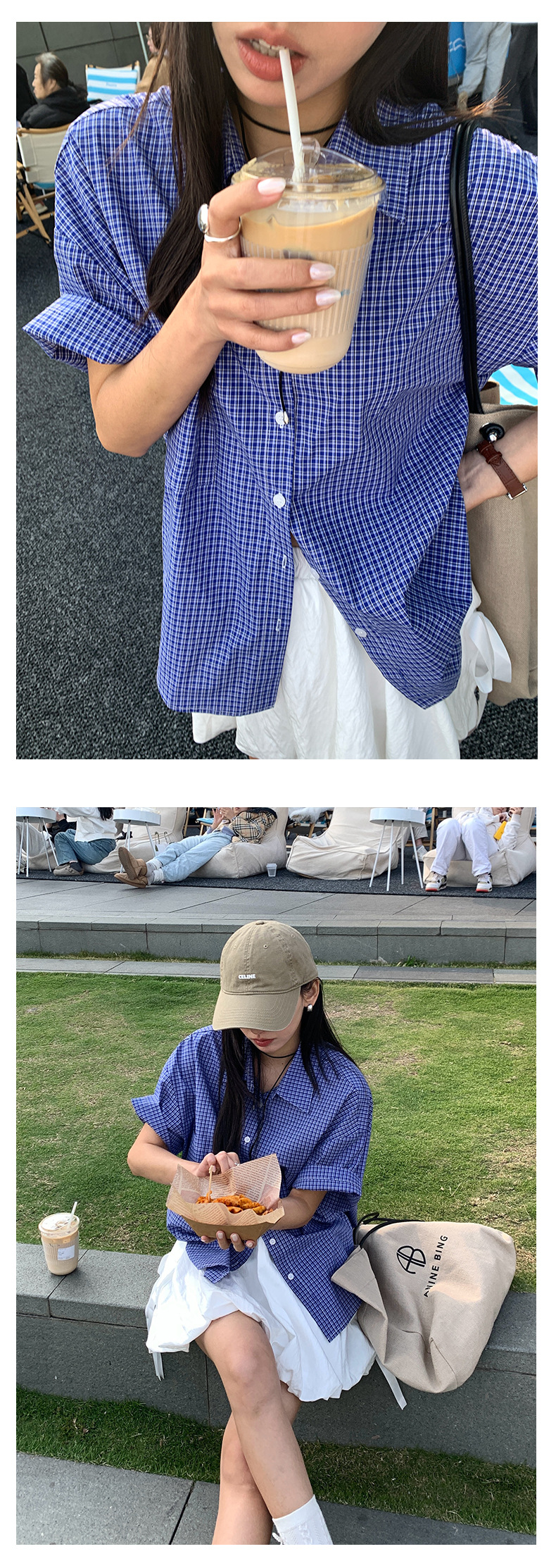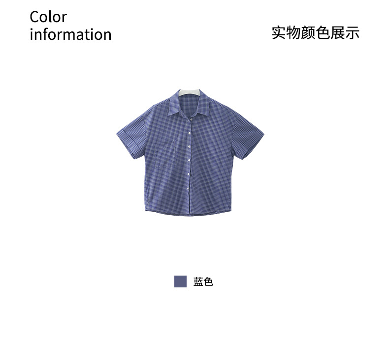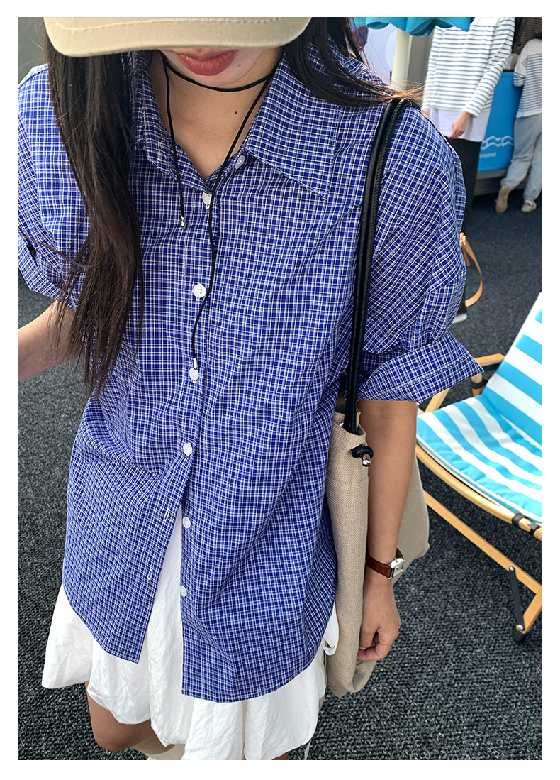 노란색 정 블루와 화이트 파인 패턴 라셀 싱글 브레스트 반팔 셔츠 여성의 2025 여름 복고풍 패션 톱 520287스토어 가기