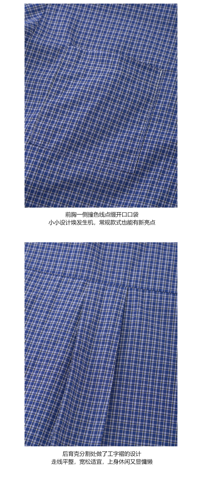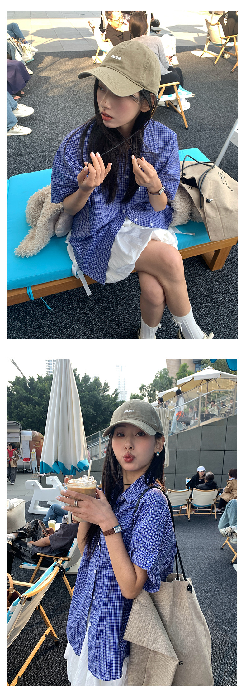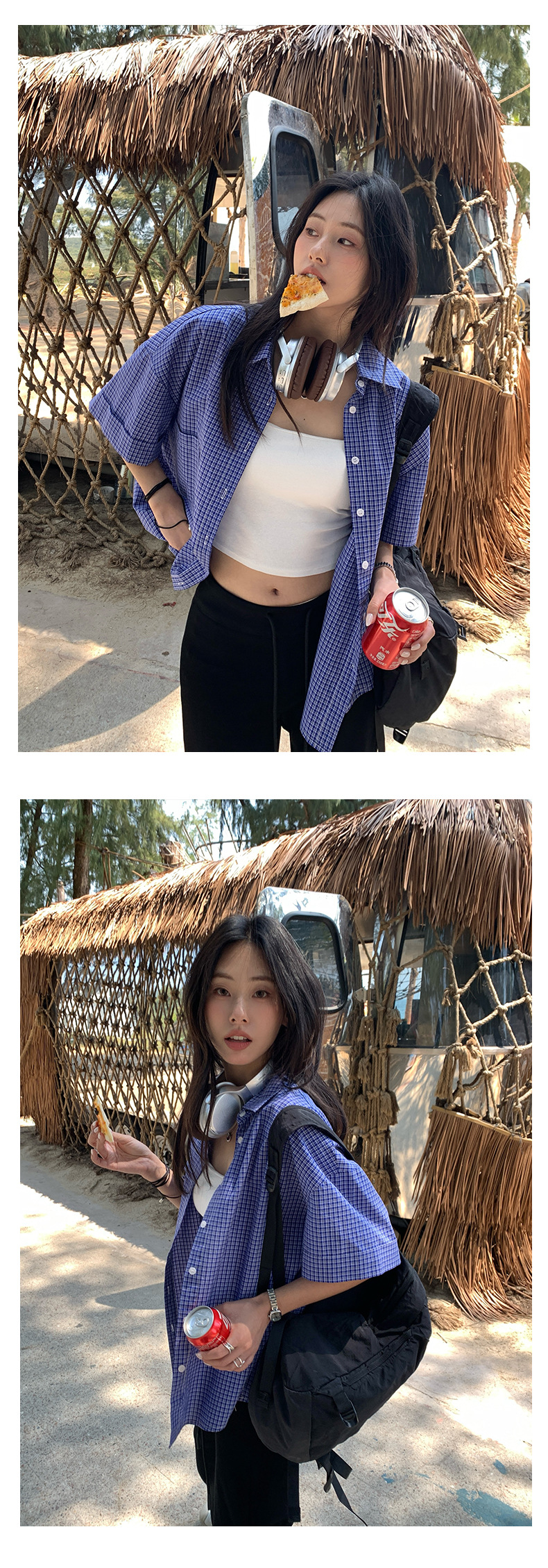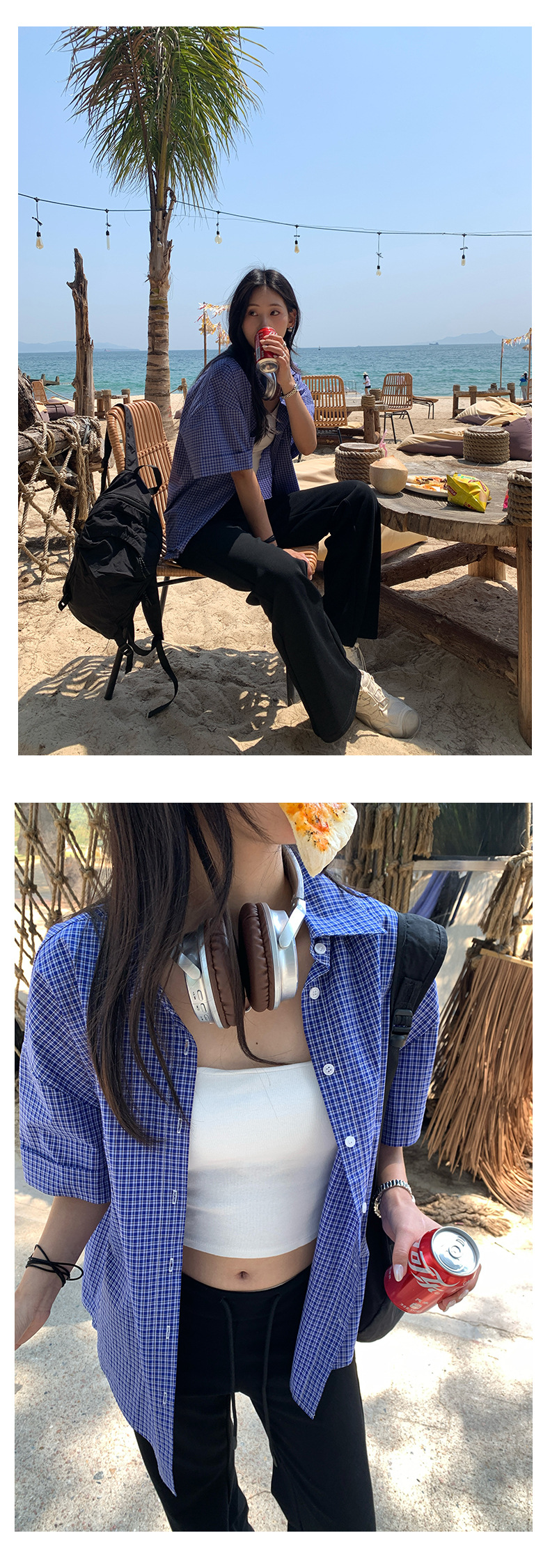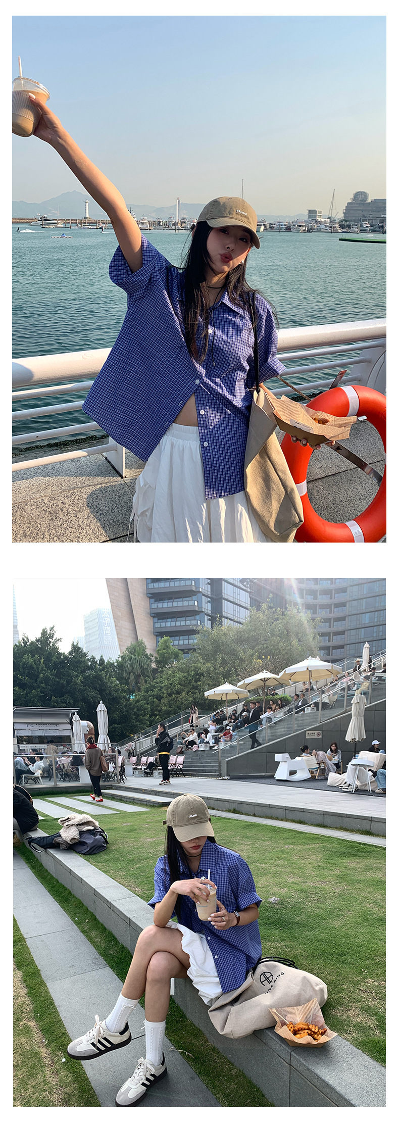 노란색 정 블루와 화이트 파인 패턴 라셀 싱글 브레스트 반팔 셔츠 여성의 2025 여름 복고풍 패션 톱 520287스토어 가기
