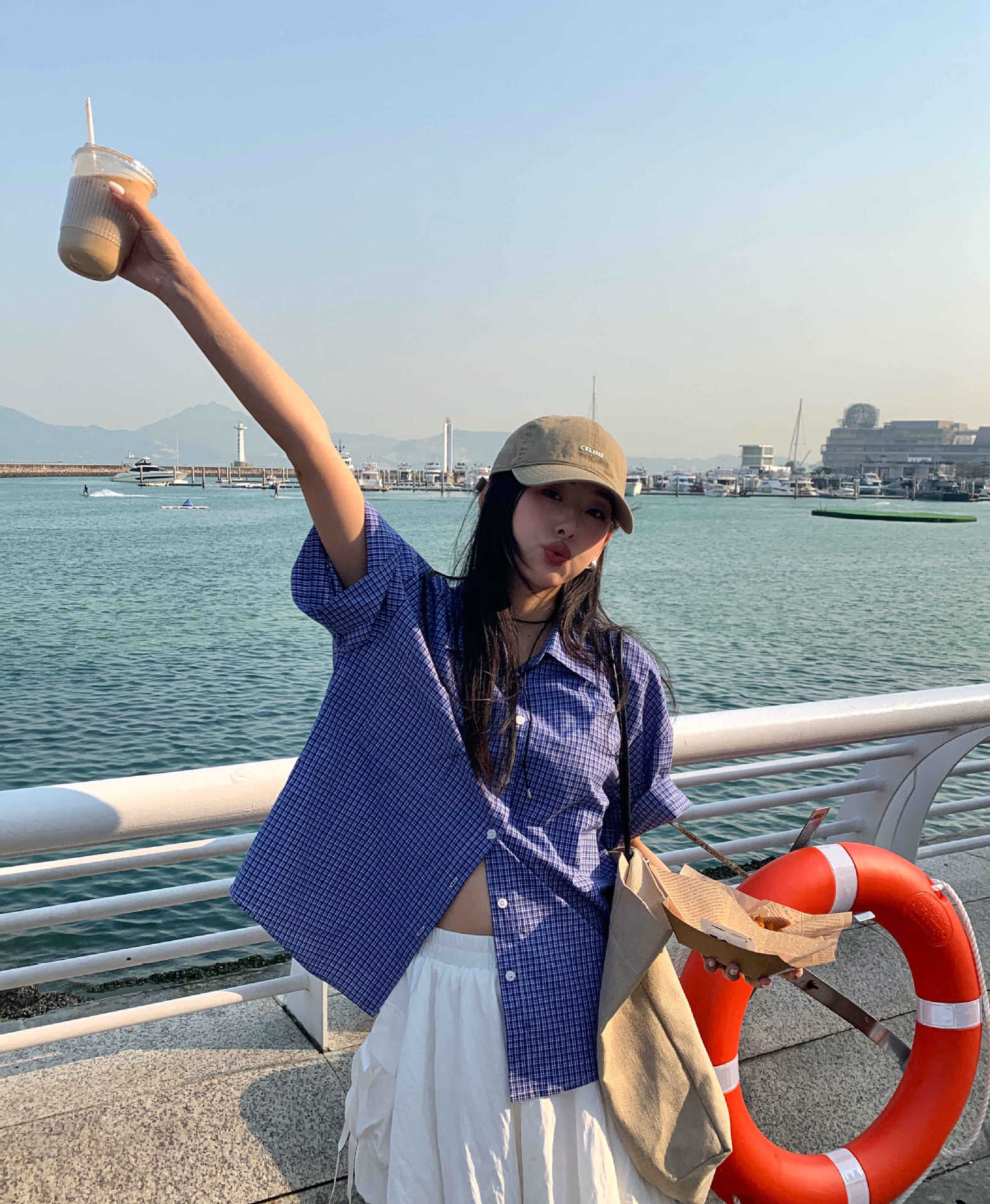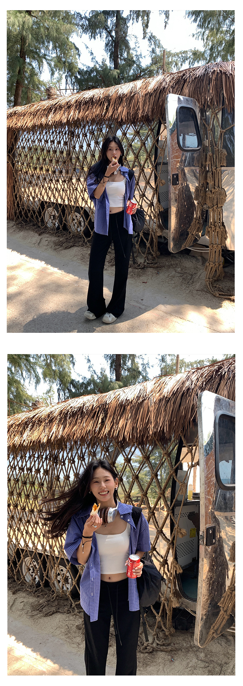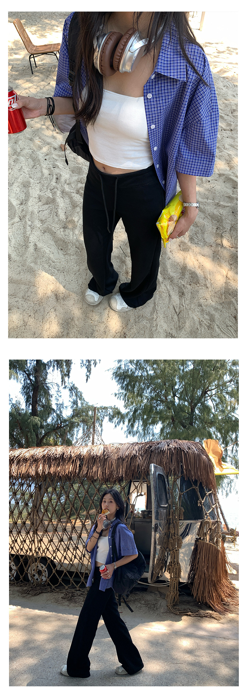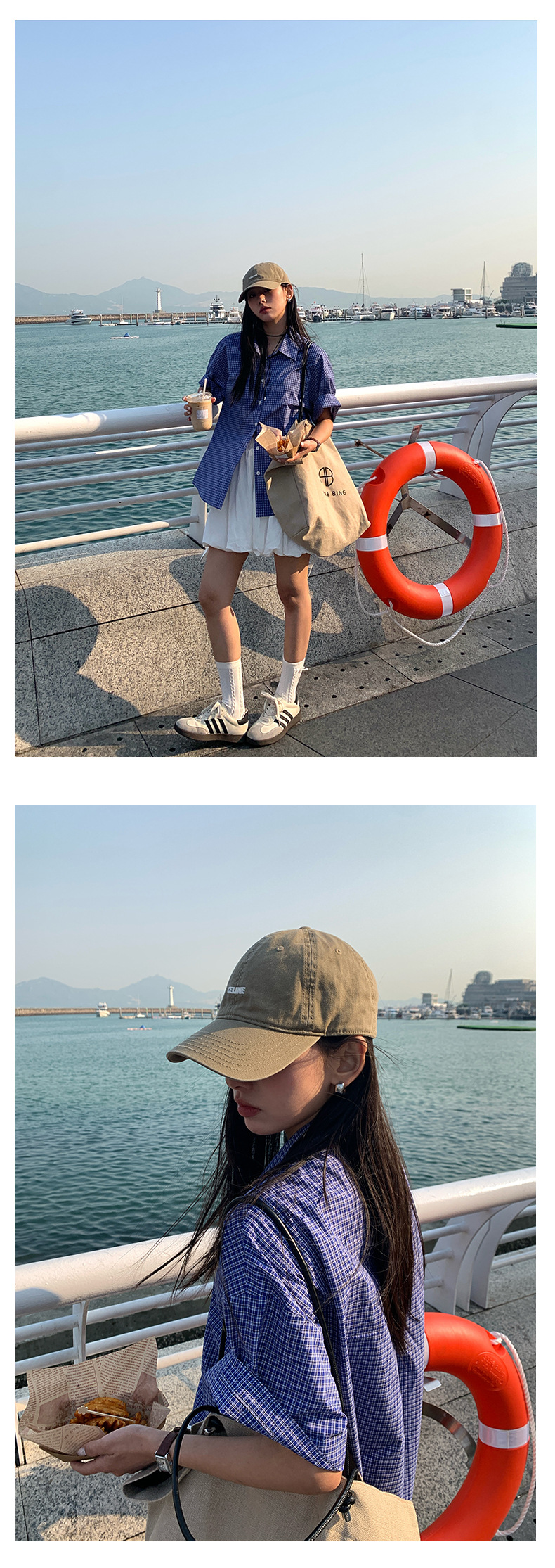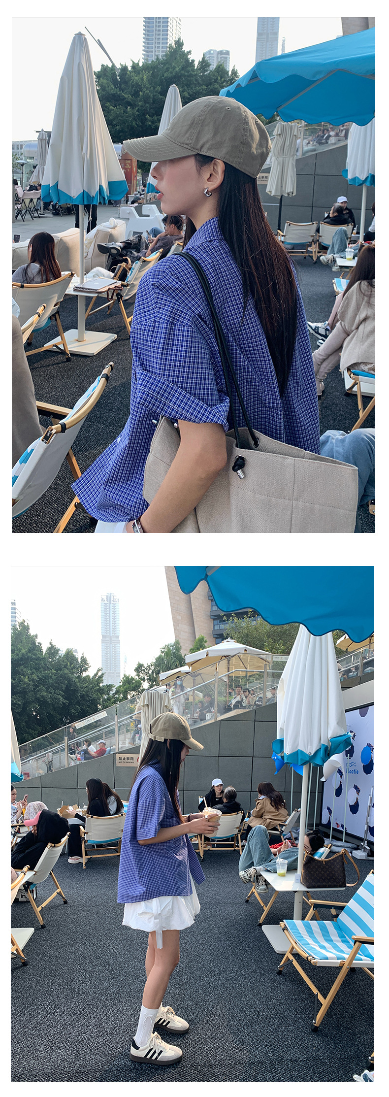 노란색 정 블루와 화이트 파인 패턴 라셀 싱글 브레스트 반팔 셔츠 여성의 2025 여름 복고풍 패션 톱 520287스토어 가기
