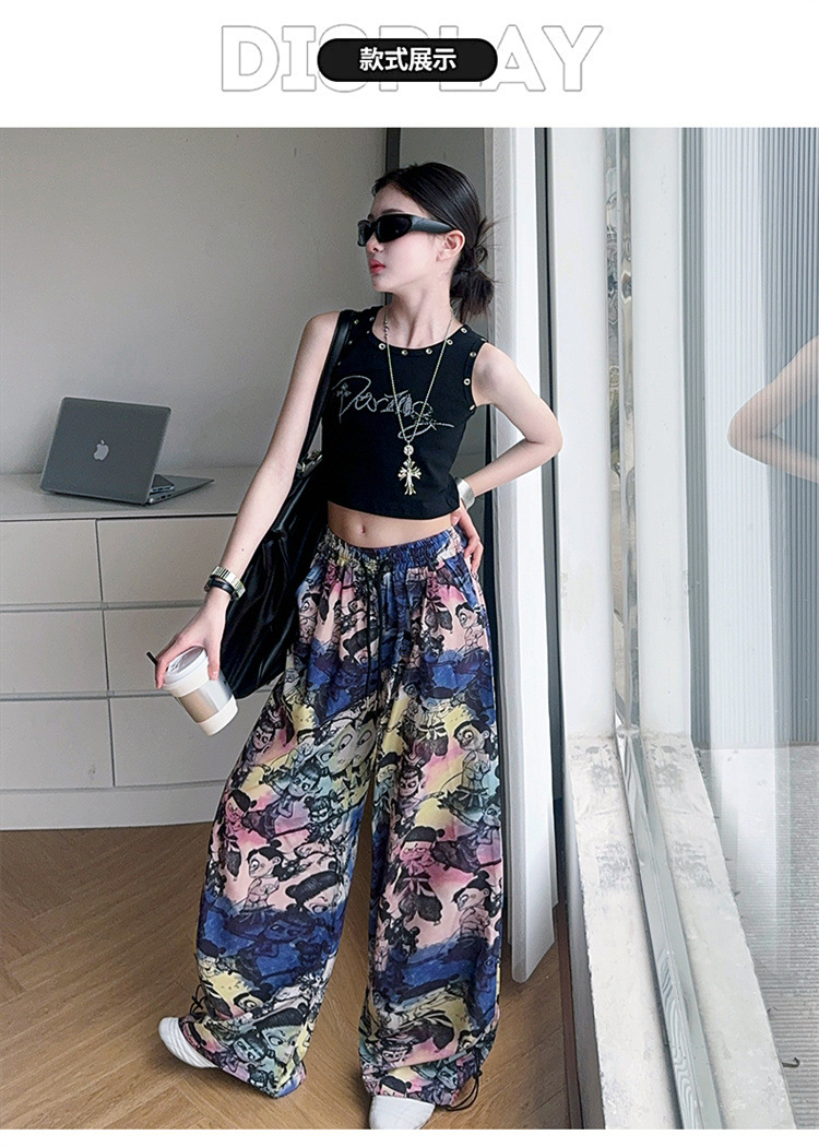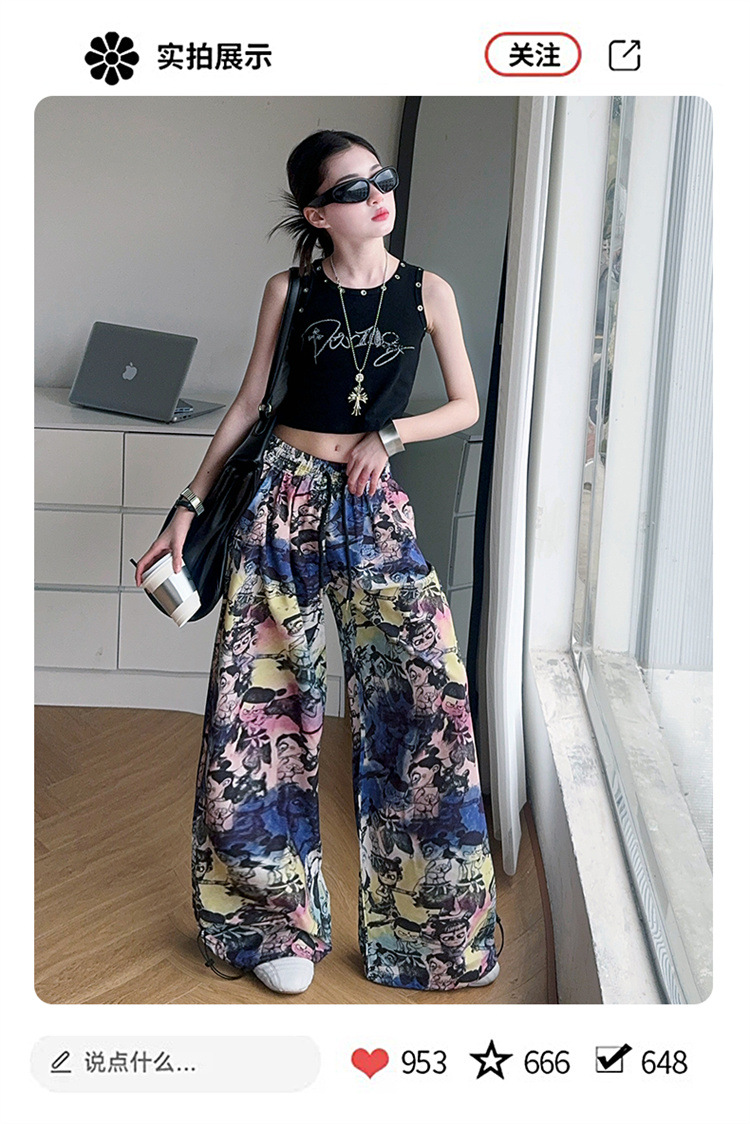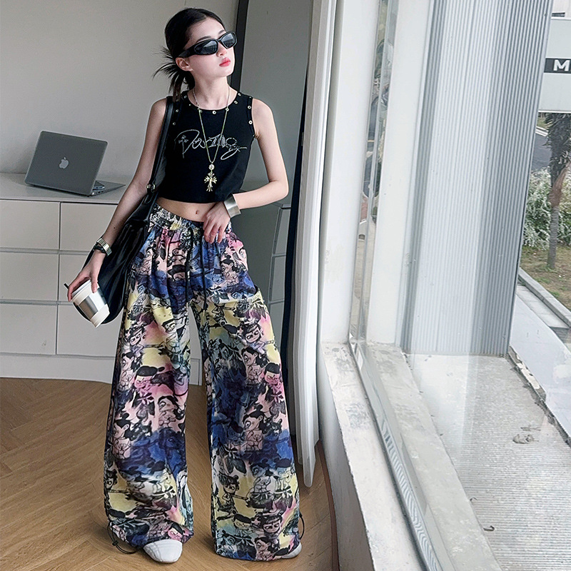 소녀 조끼 케이크 바지 세트 2025 여름 새로운 어린이 거리 댄스 투피스 세트 대형 어린이 시폰 와이드 레그 바지스토어 가기