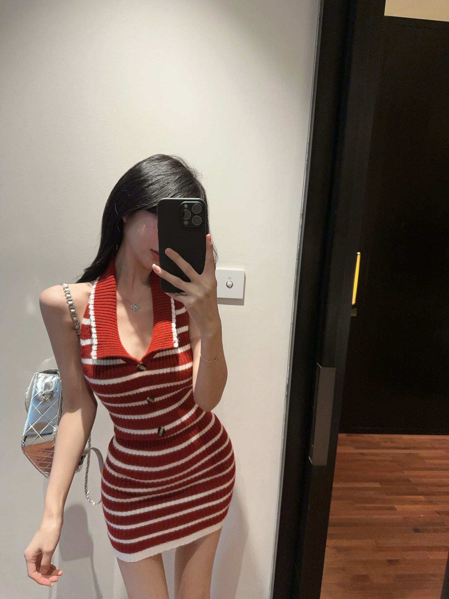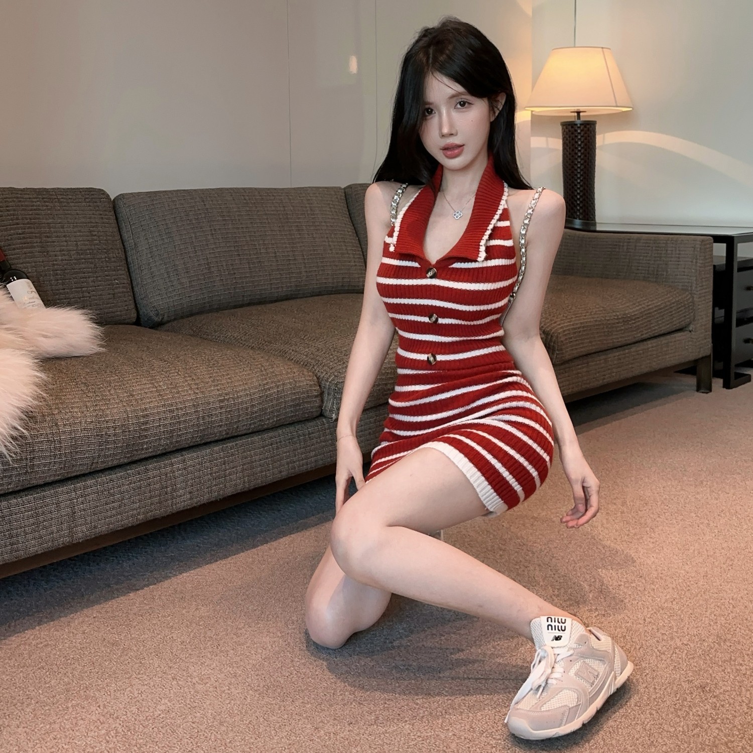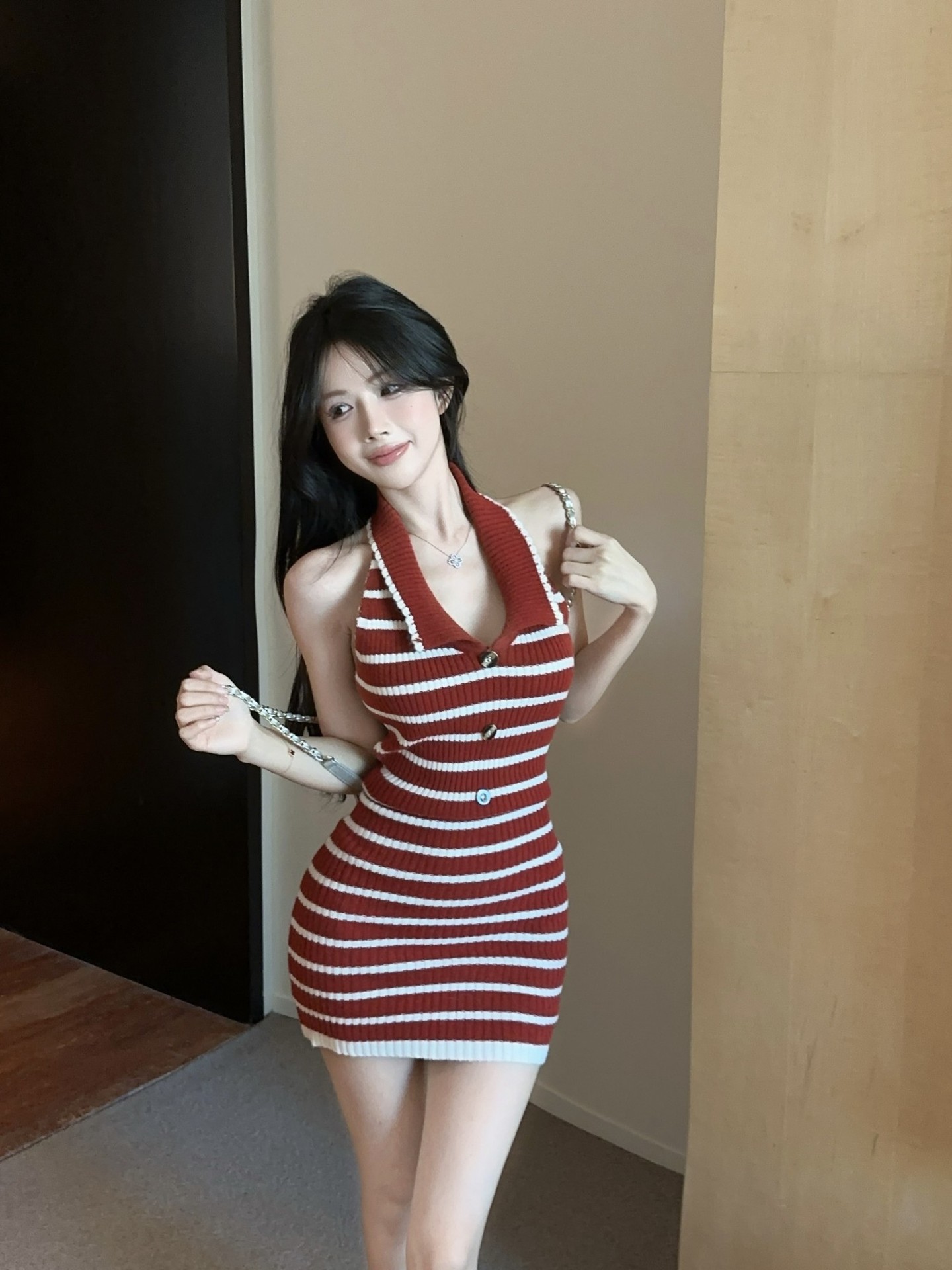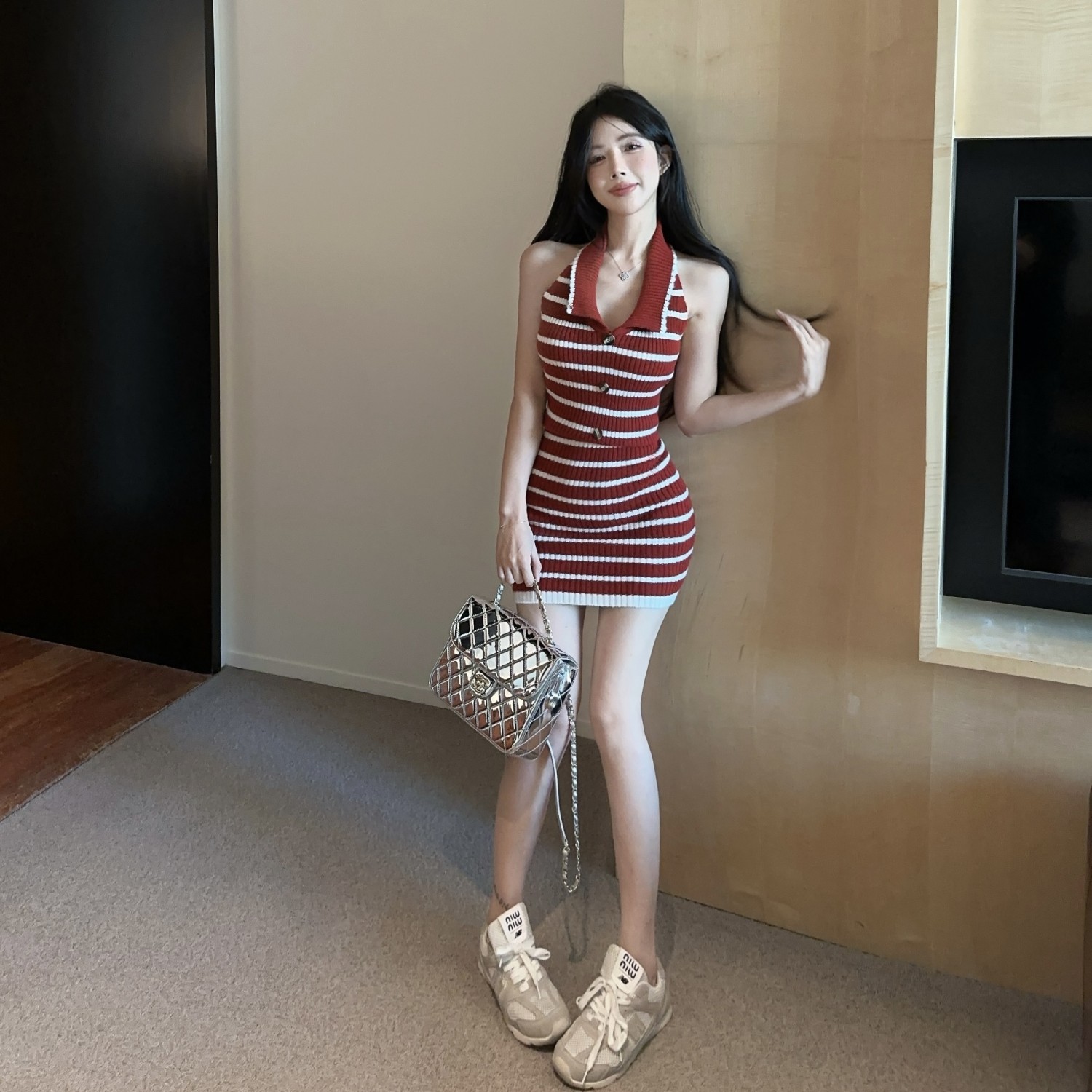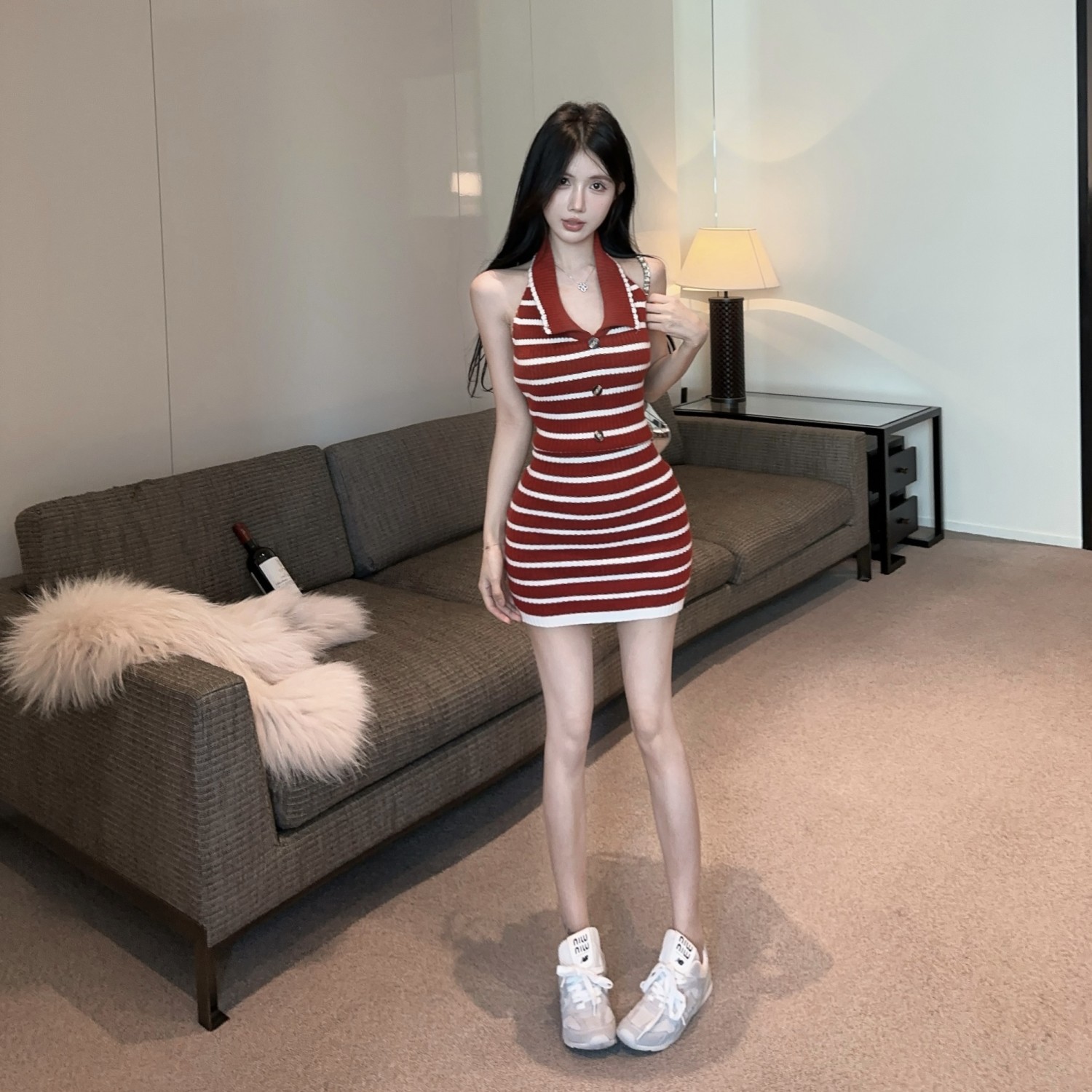 스트라이프 백리스 니트 교수형 목 원피스 여성 여름 슬림 핏 웨스턴 스타일 짧은 치마 뜨거운 소녀의 허리 엉덩이 스커트 새로운 도착