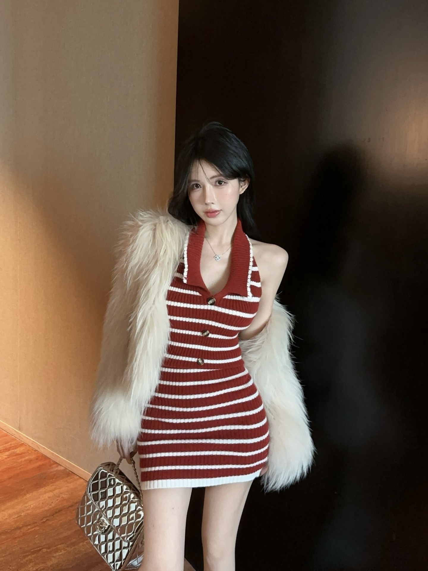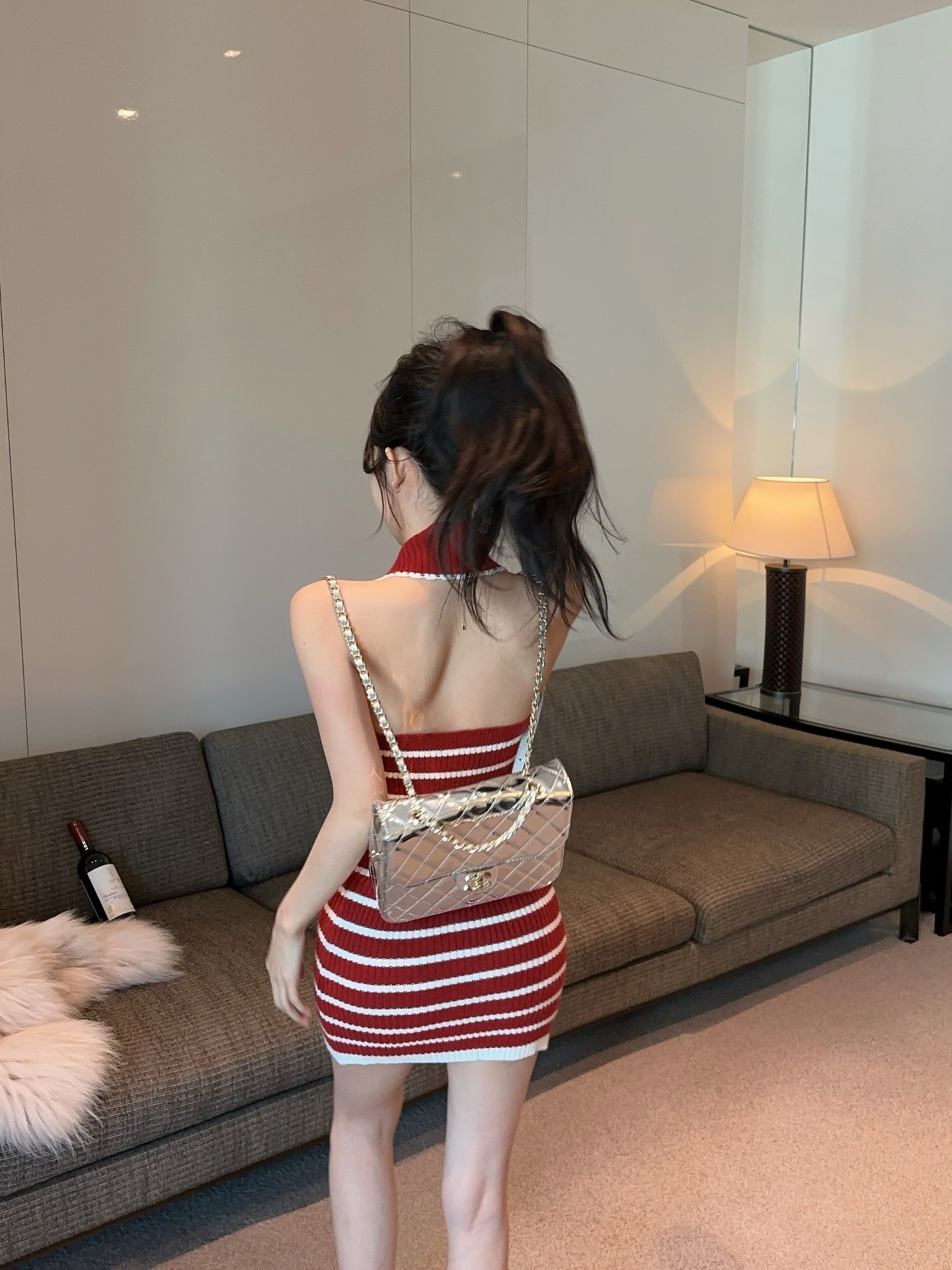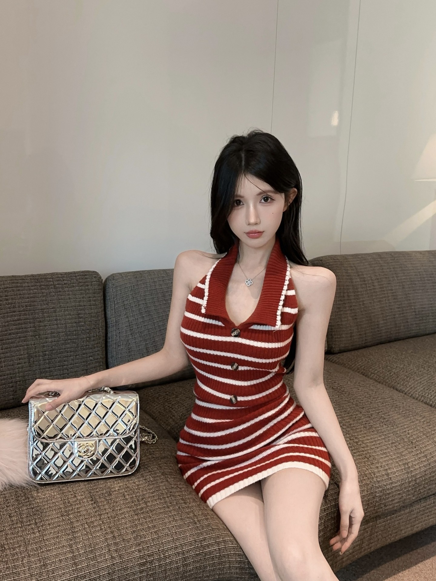 스트라이프 백리스 니트 교수형 목 원피스 여성 여름 슬림 핏 웨스턴 스타일 짧은 치마 뜨거운 소녀의 허리 엉덩이 스커트 새로운 도착스토어 가기