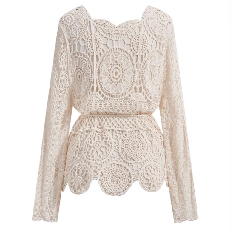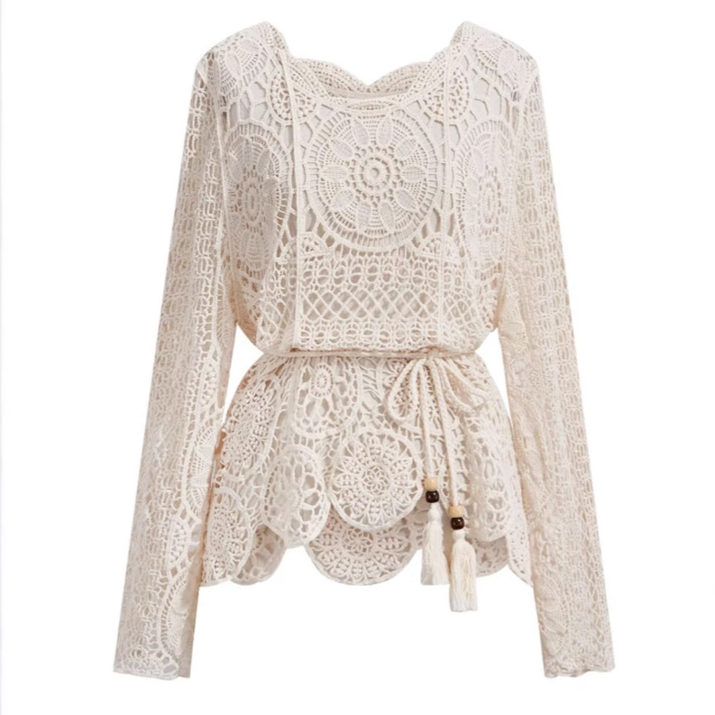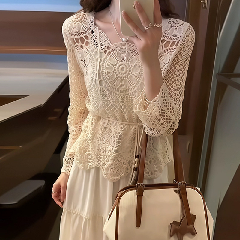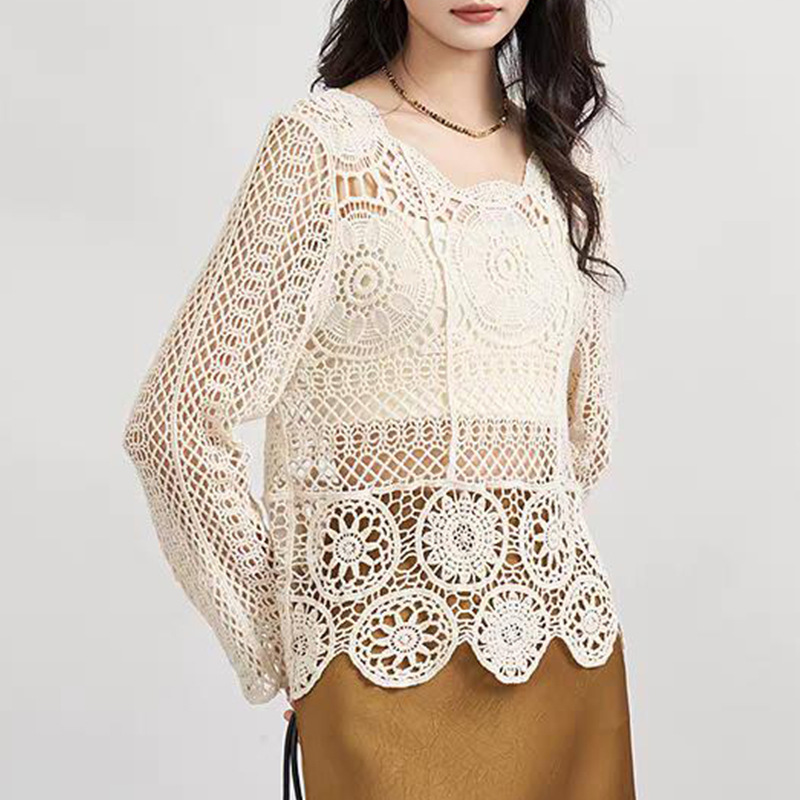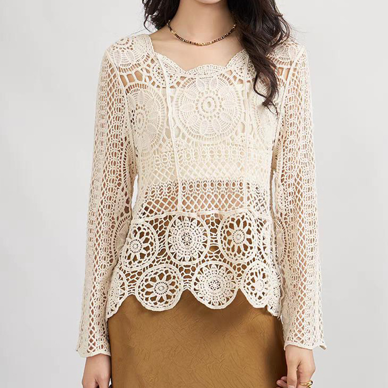 폴 레벨 할로우 크로 셰 뜨개질 스웨터 여자 여름 2025 새로운 긴팔 탑 할로우 아웃 블라우스 올 매치 393