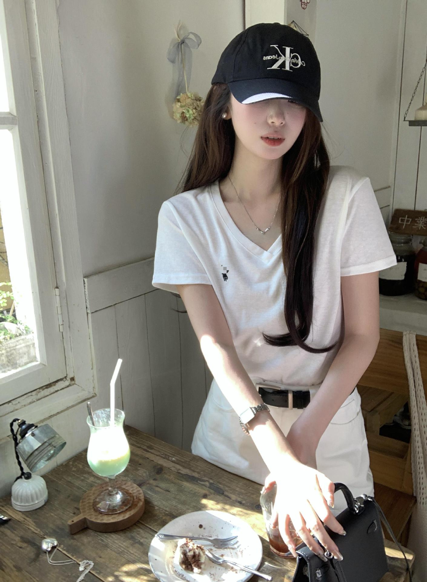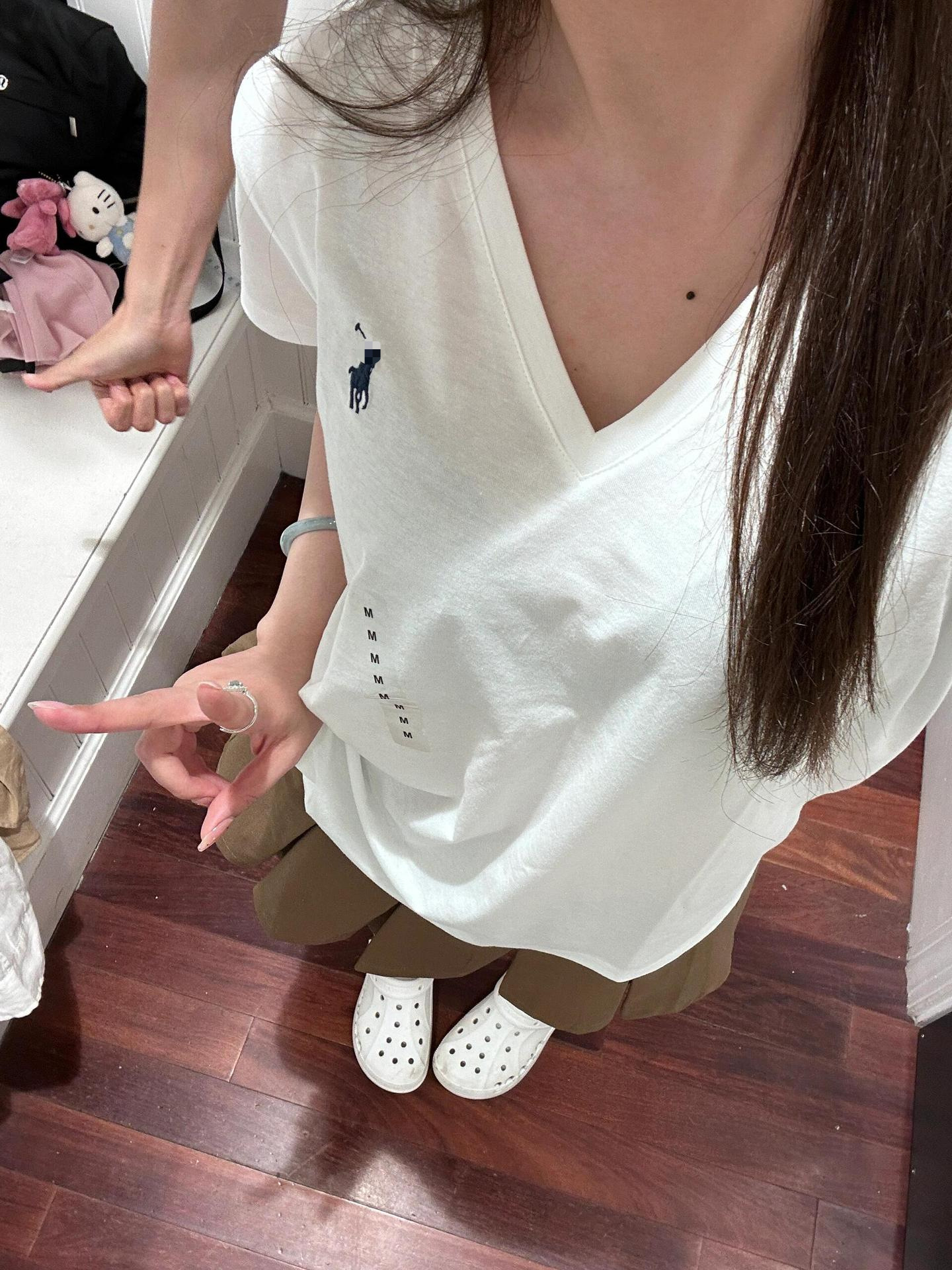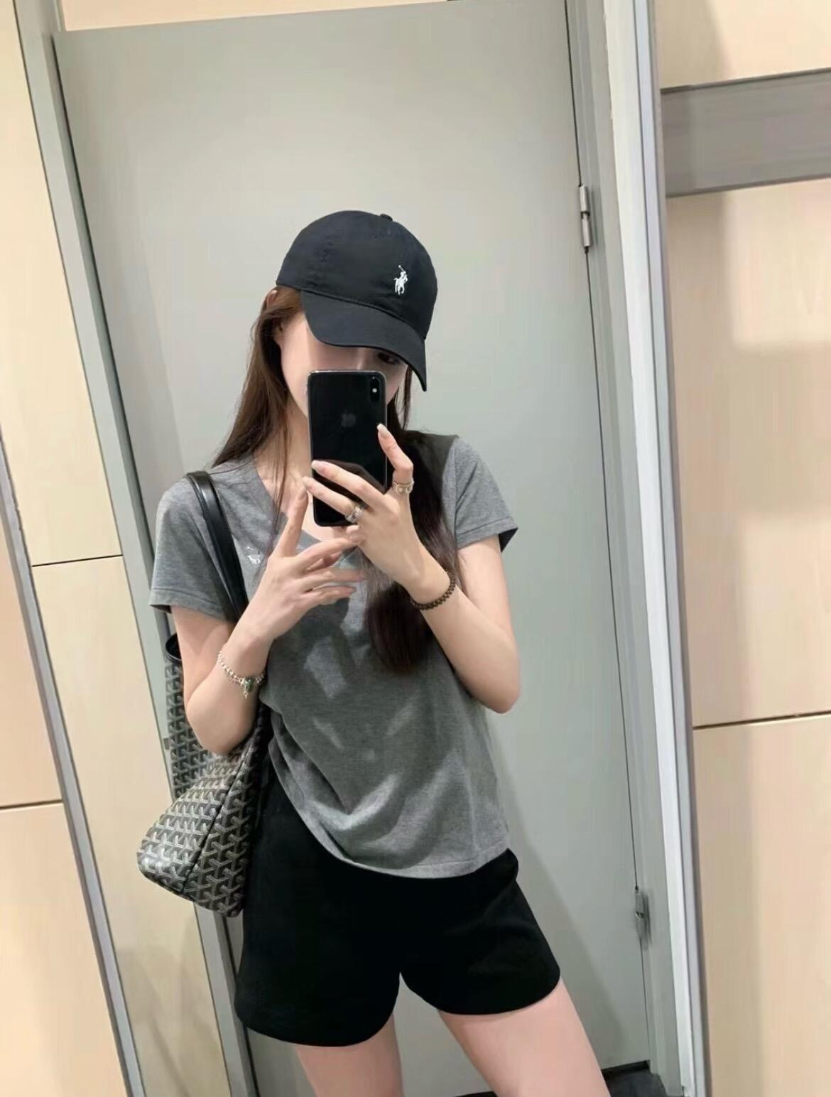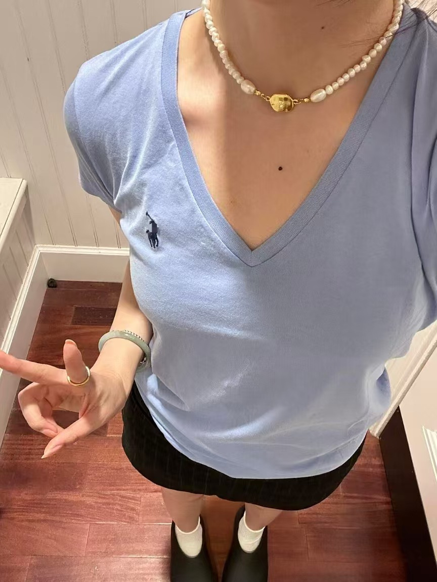 RL 러프 포니 자수 슬림 핏 탑베이스 셔츠 여름 퓨어 코튼 V-넥 솔리드 컬러 반팔 티셔츠 여성용 아메리칸 스타일