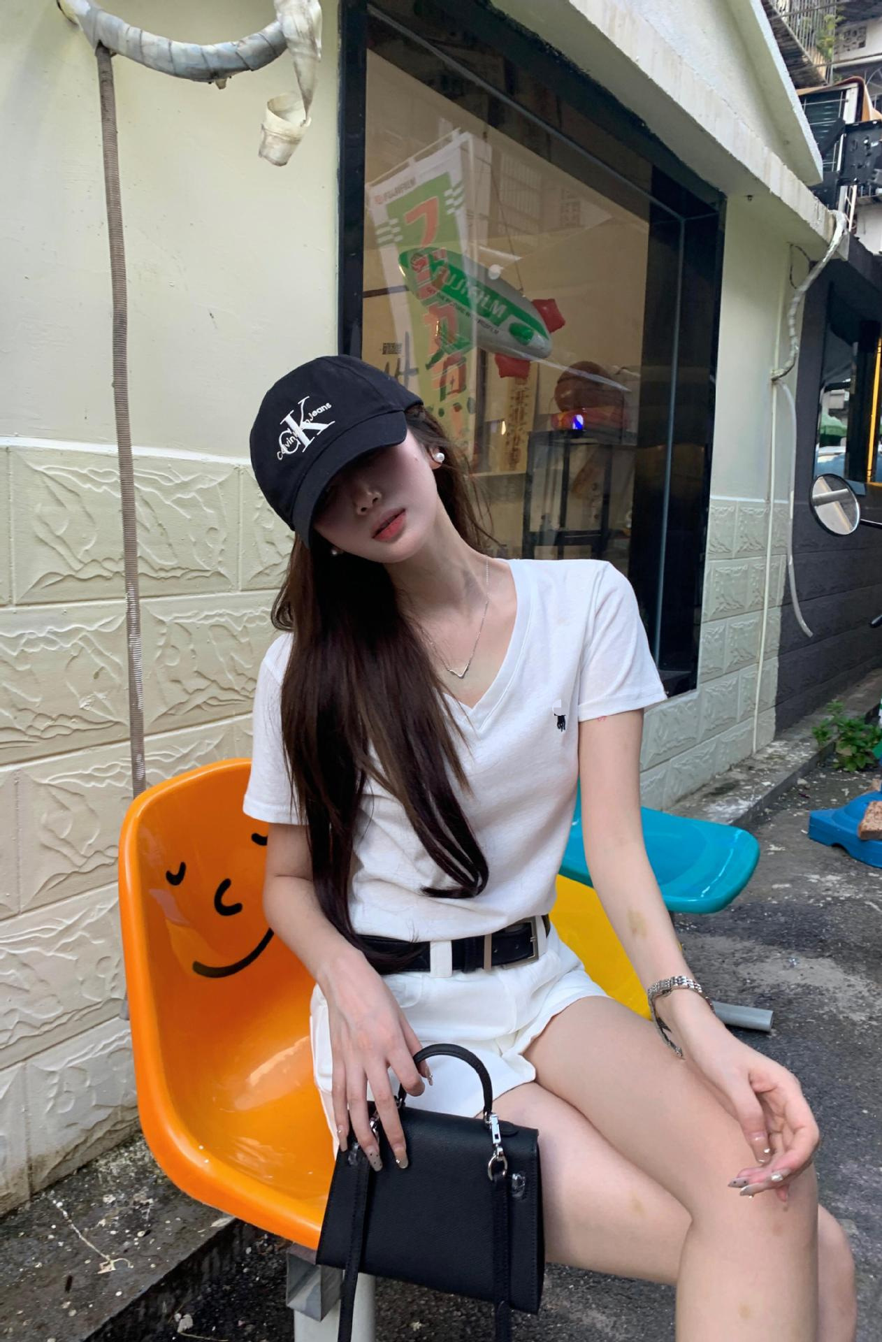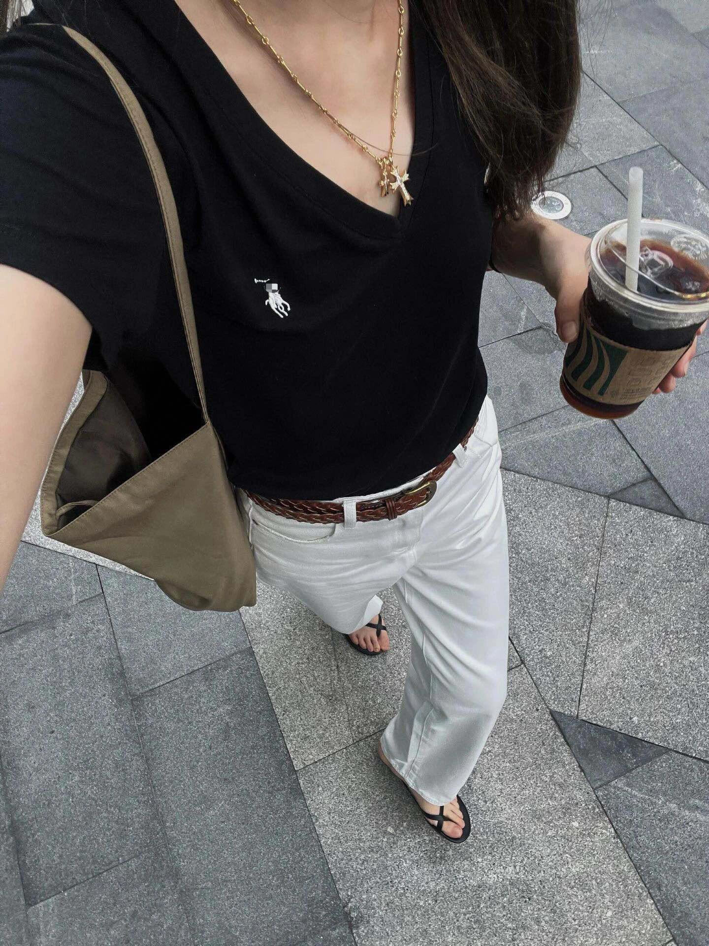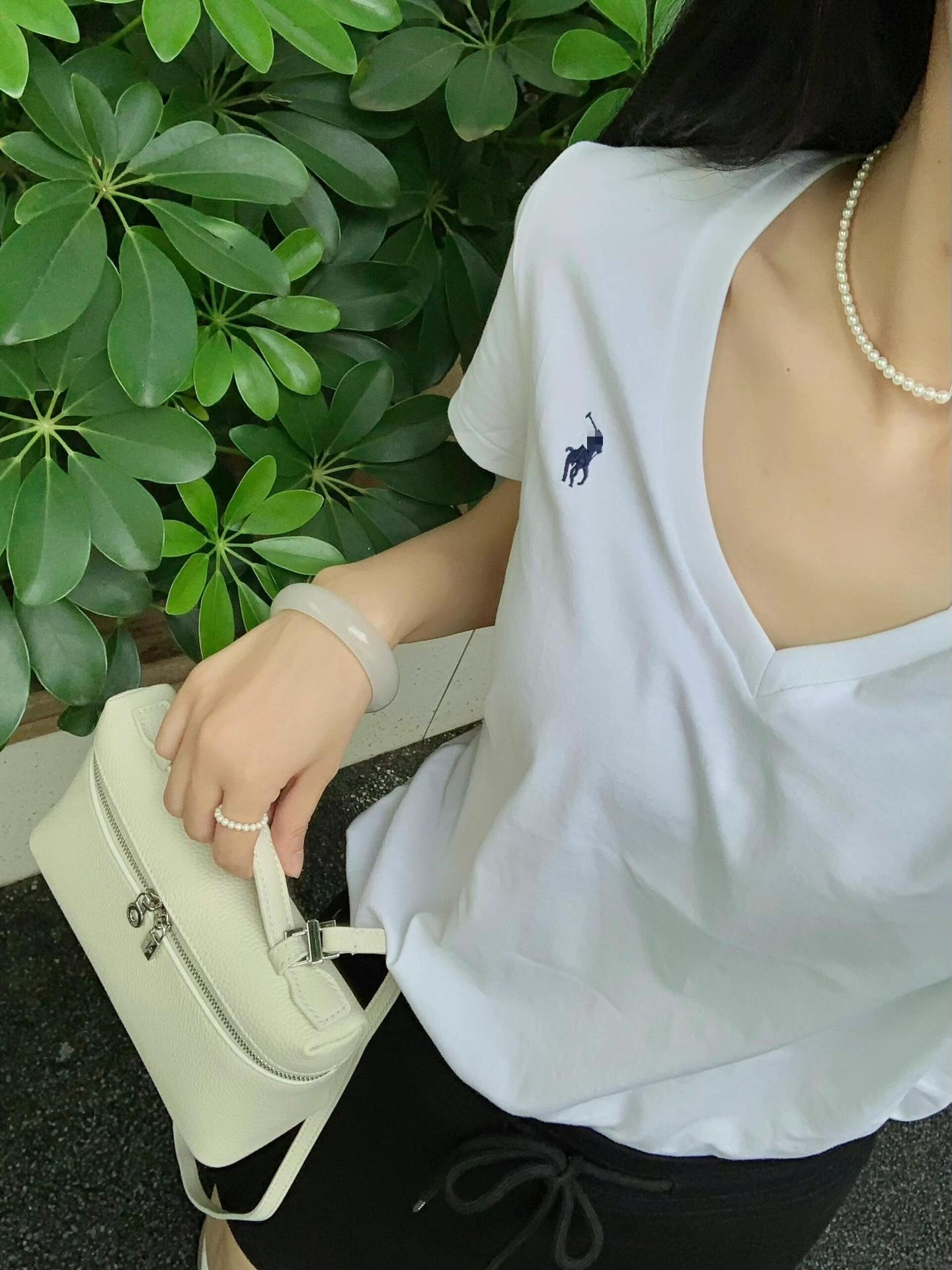 RL 러프 포니 자수 슬림 핏 탑베이스 셔츠 여름 퓨어 코튼 V-넥 솔리드 컬러 반팔 티셔츠 여성용 아메리칸 스타일