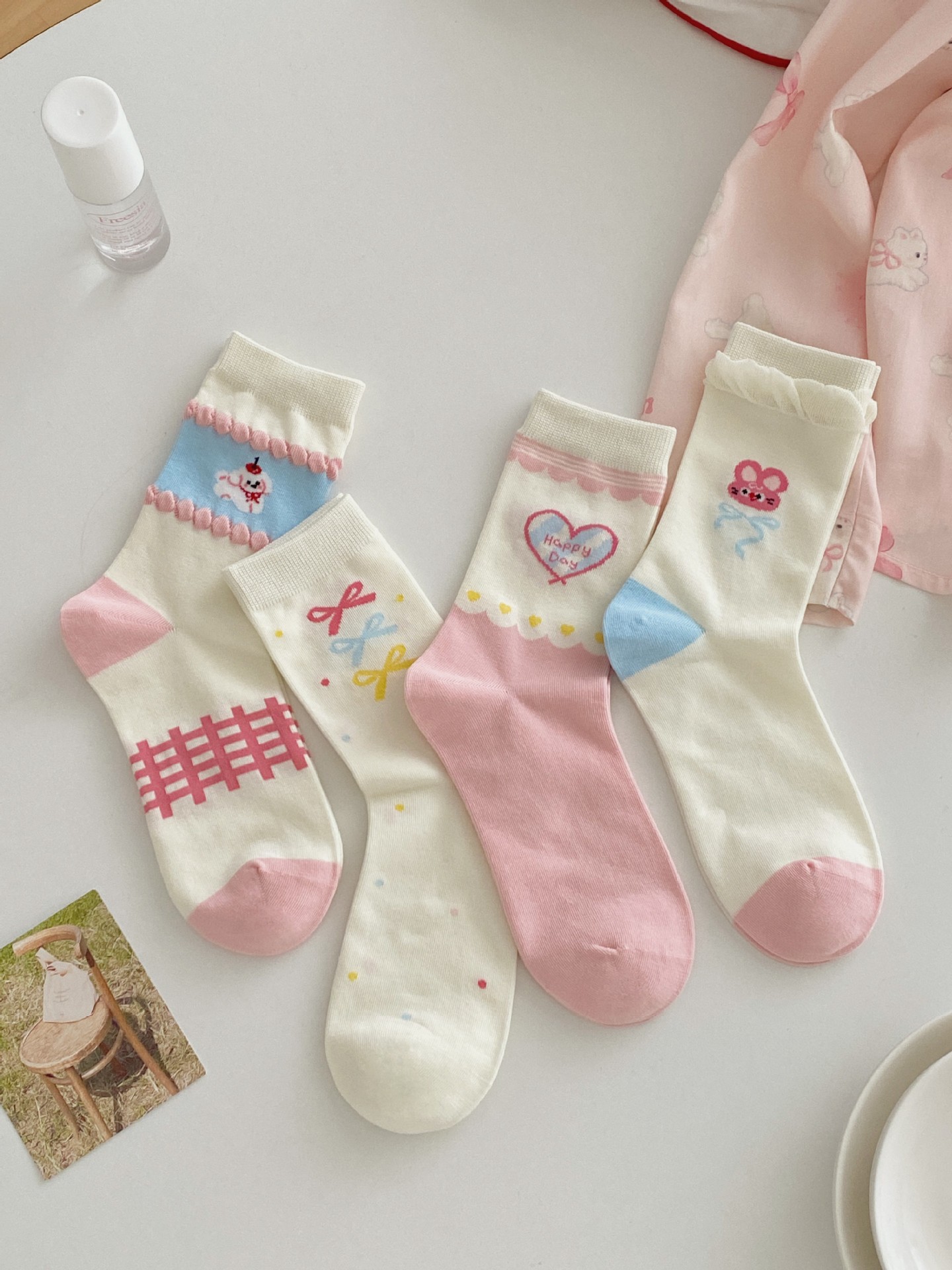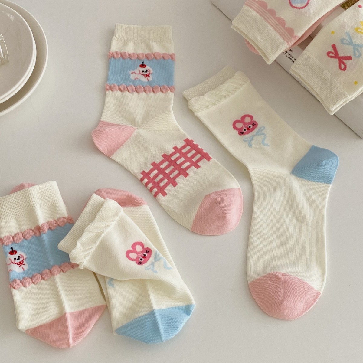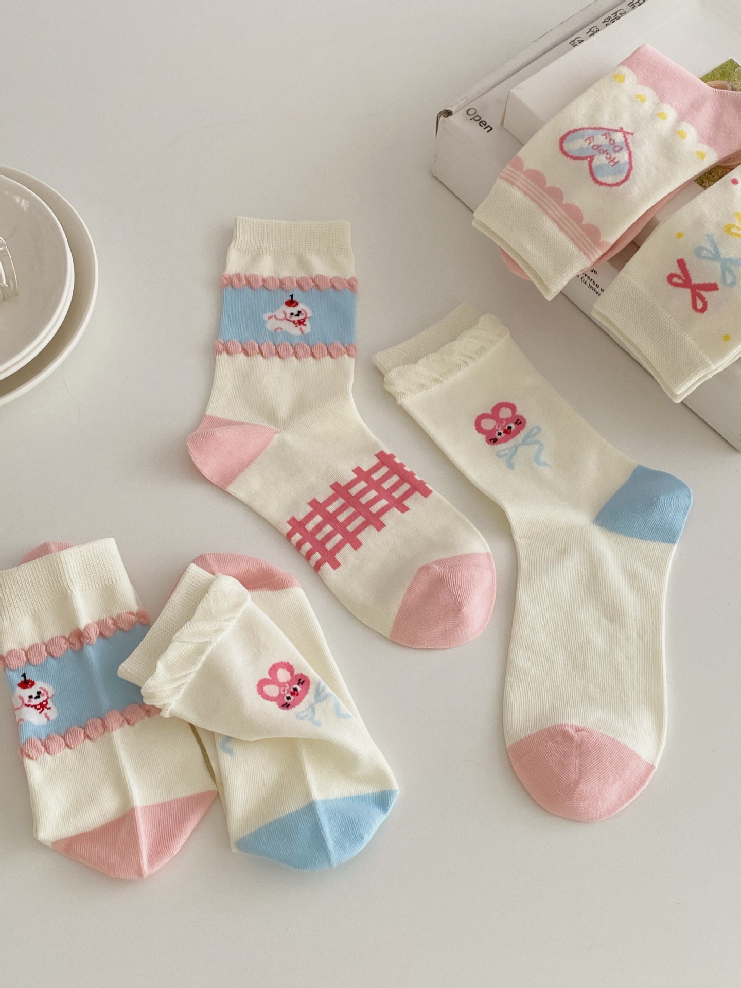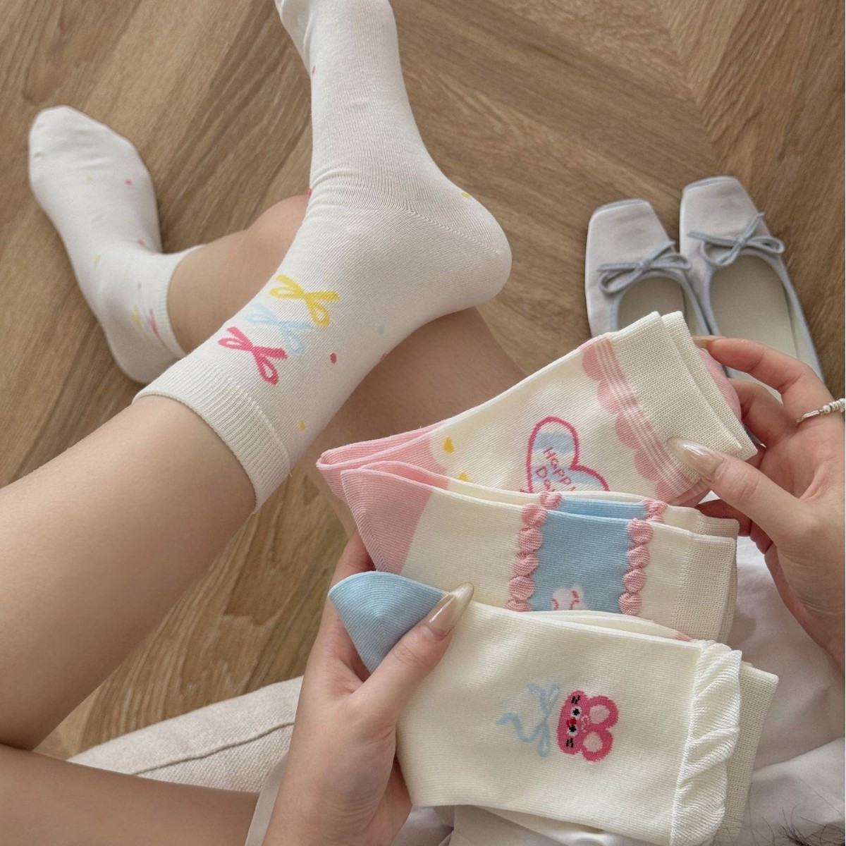 핑크 Bowknot 양말 여성용 뼈없는 미드 튜브 양말 Ins 유행 일본 스타일 귀여운 강아지 학생 사랑 소녀 양말