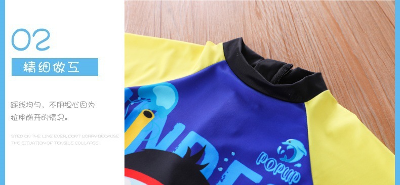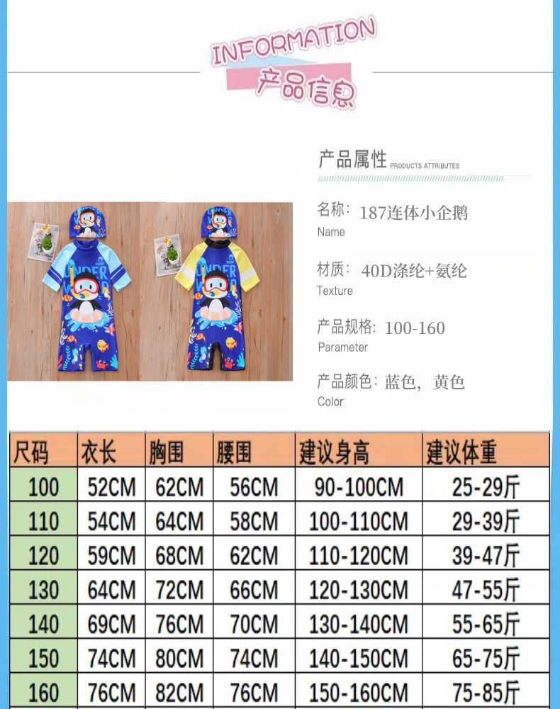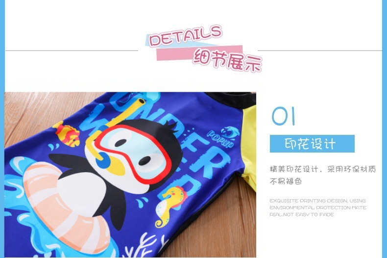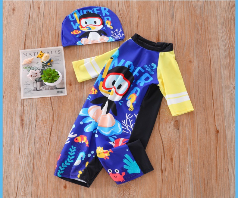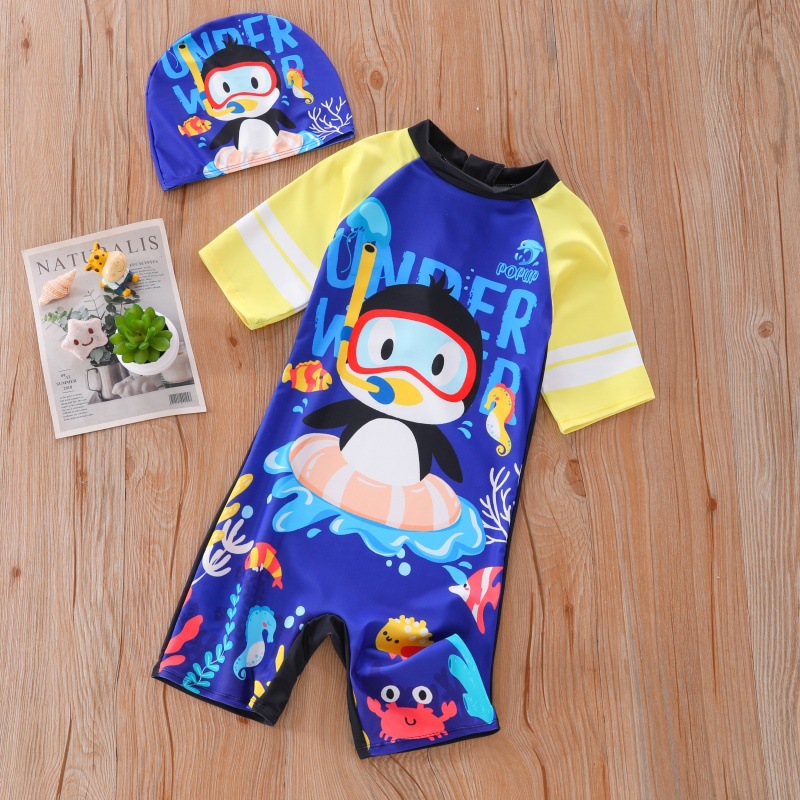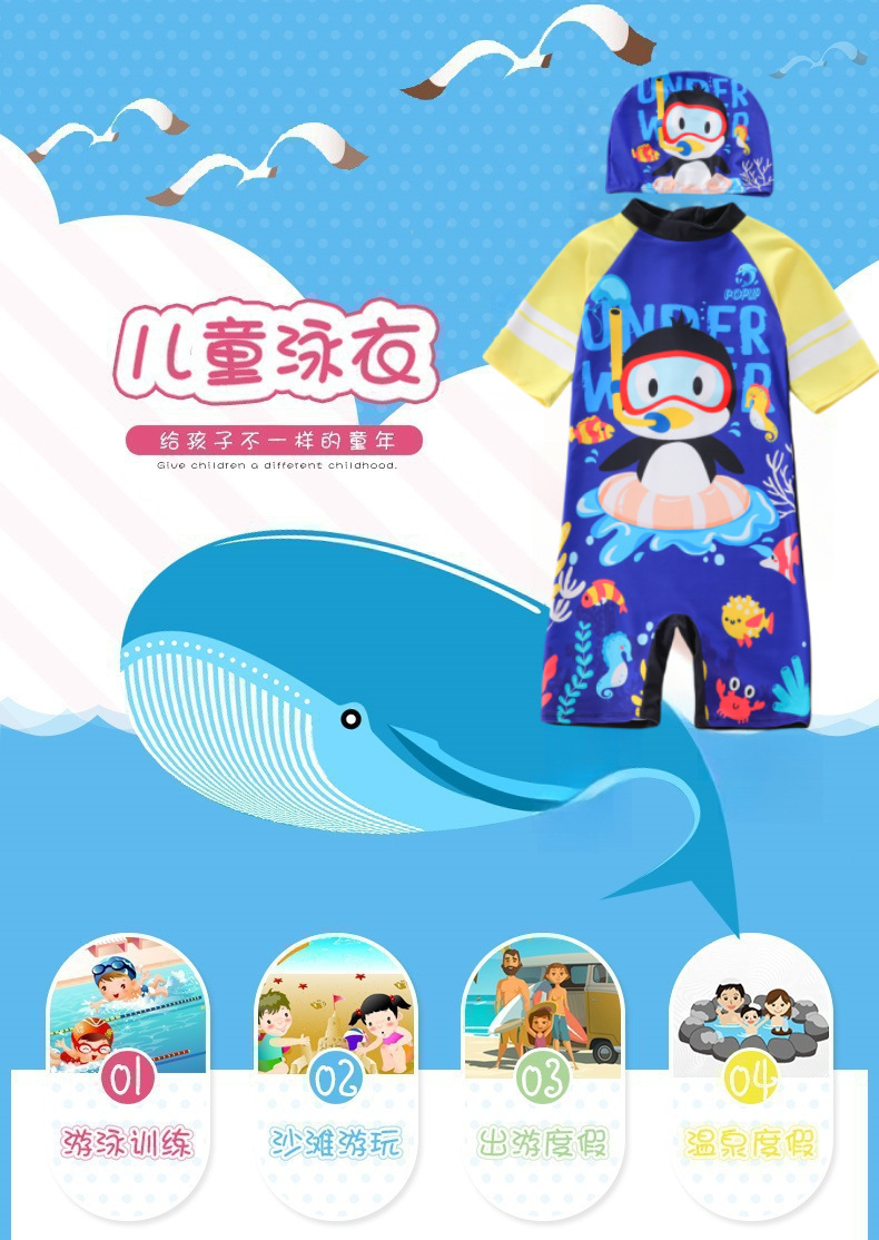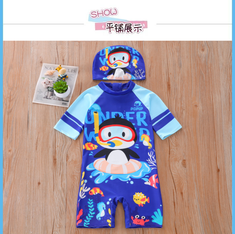 새로운 어린이 수영복 소년 원피스 중형 및 대형 어린이 수영복 소년 만화 작은 펭귄 수영복 자외선 차단 UPF50 +
