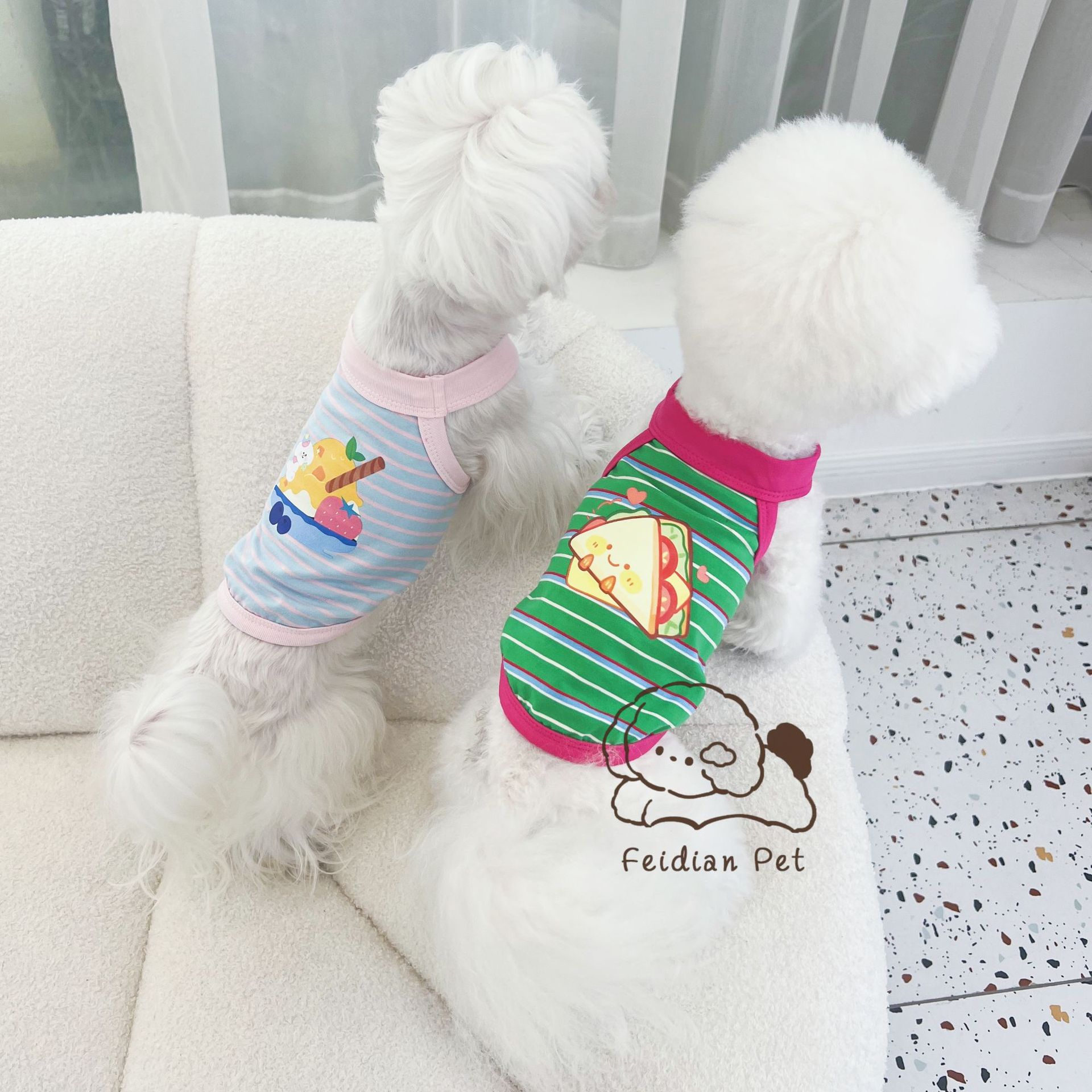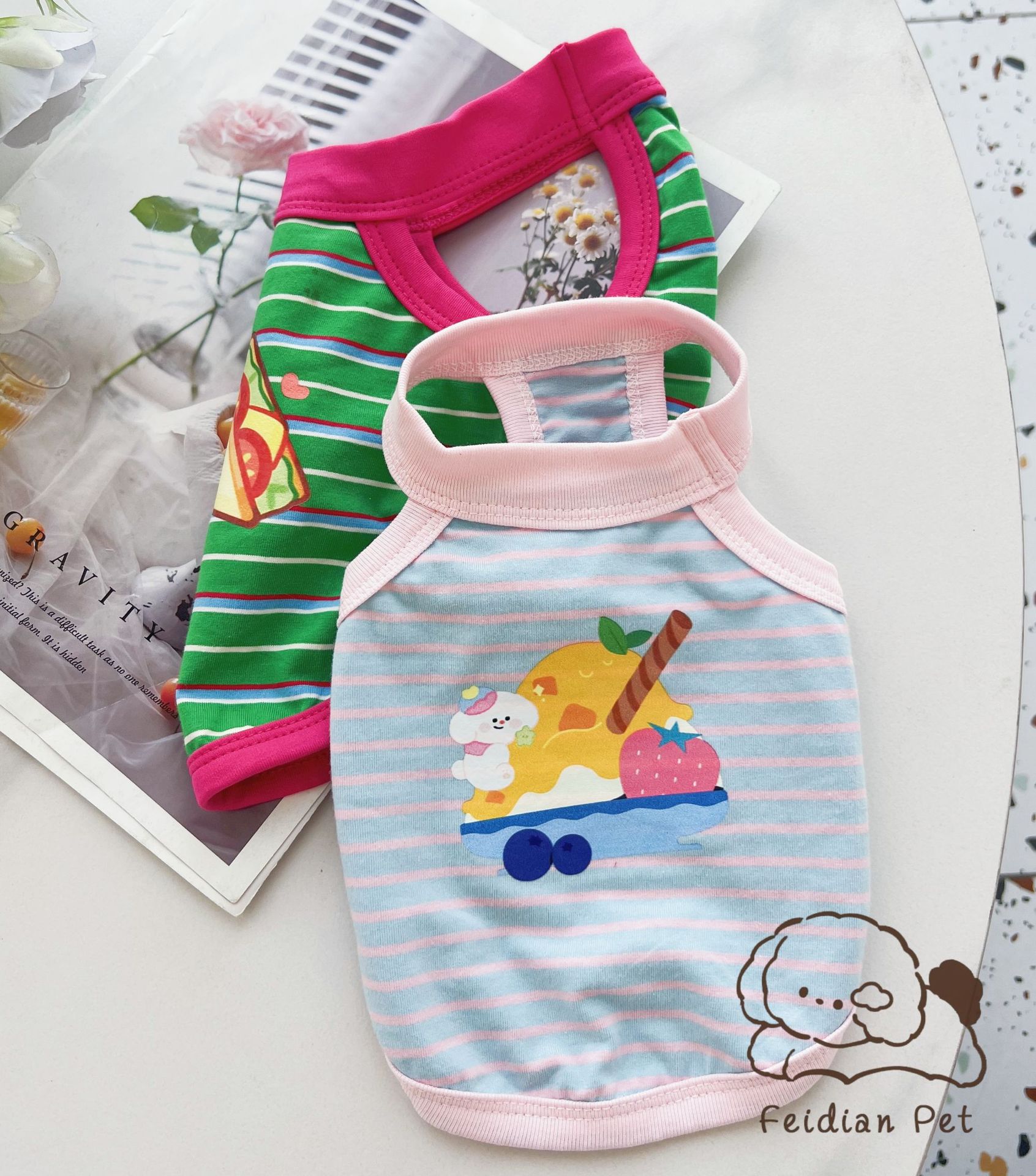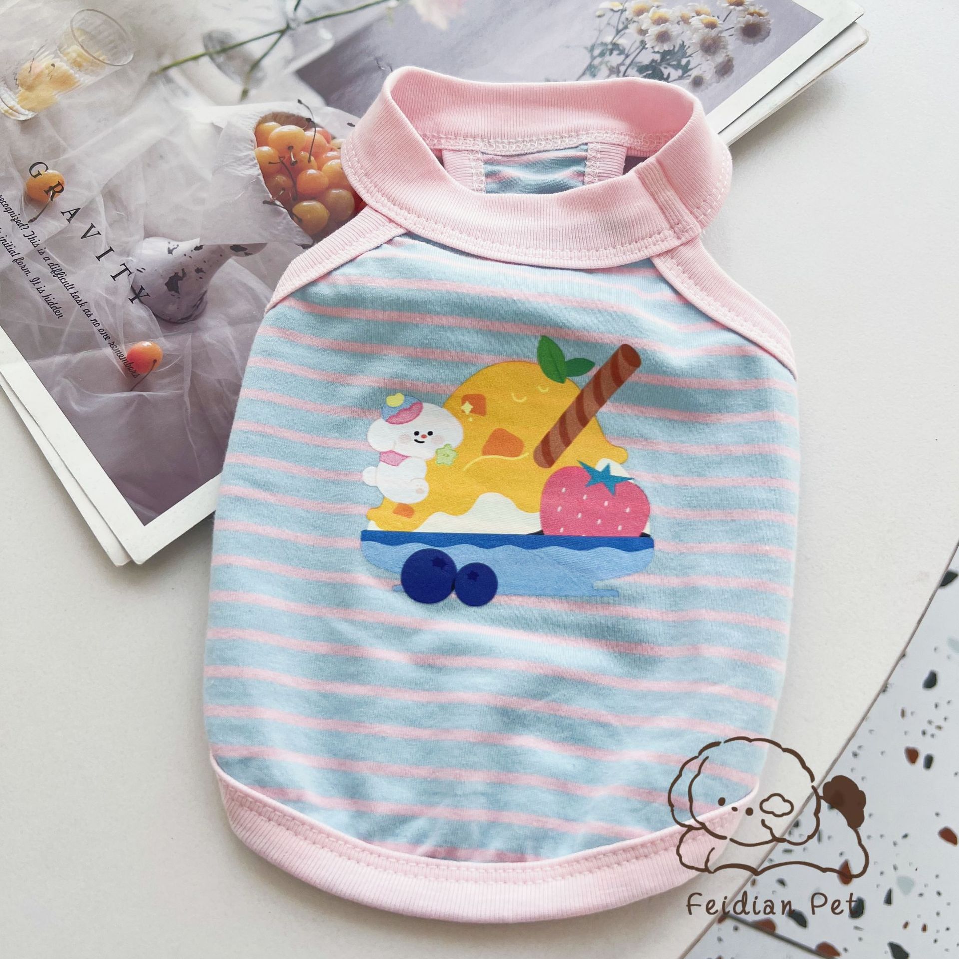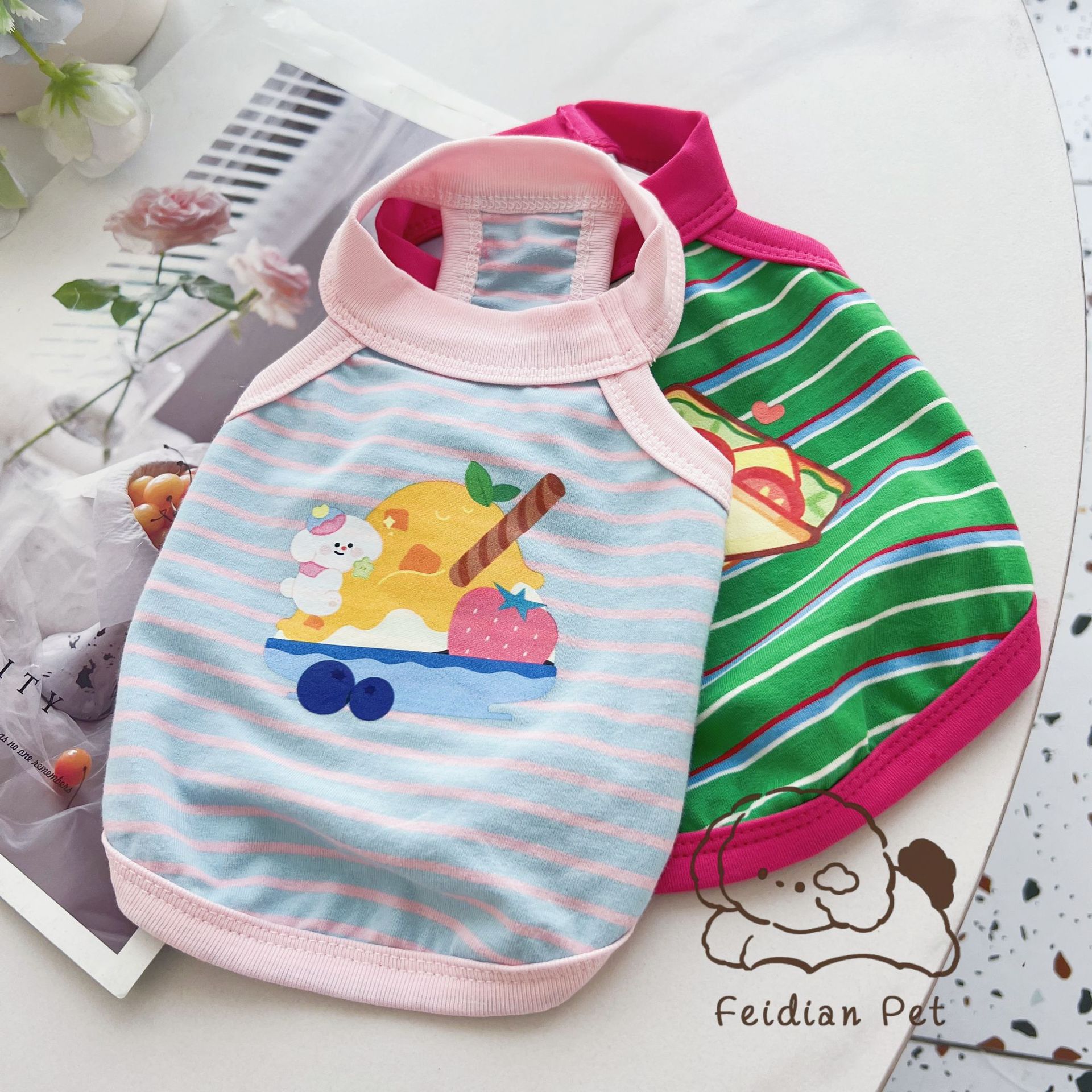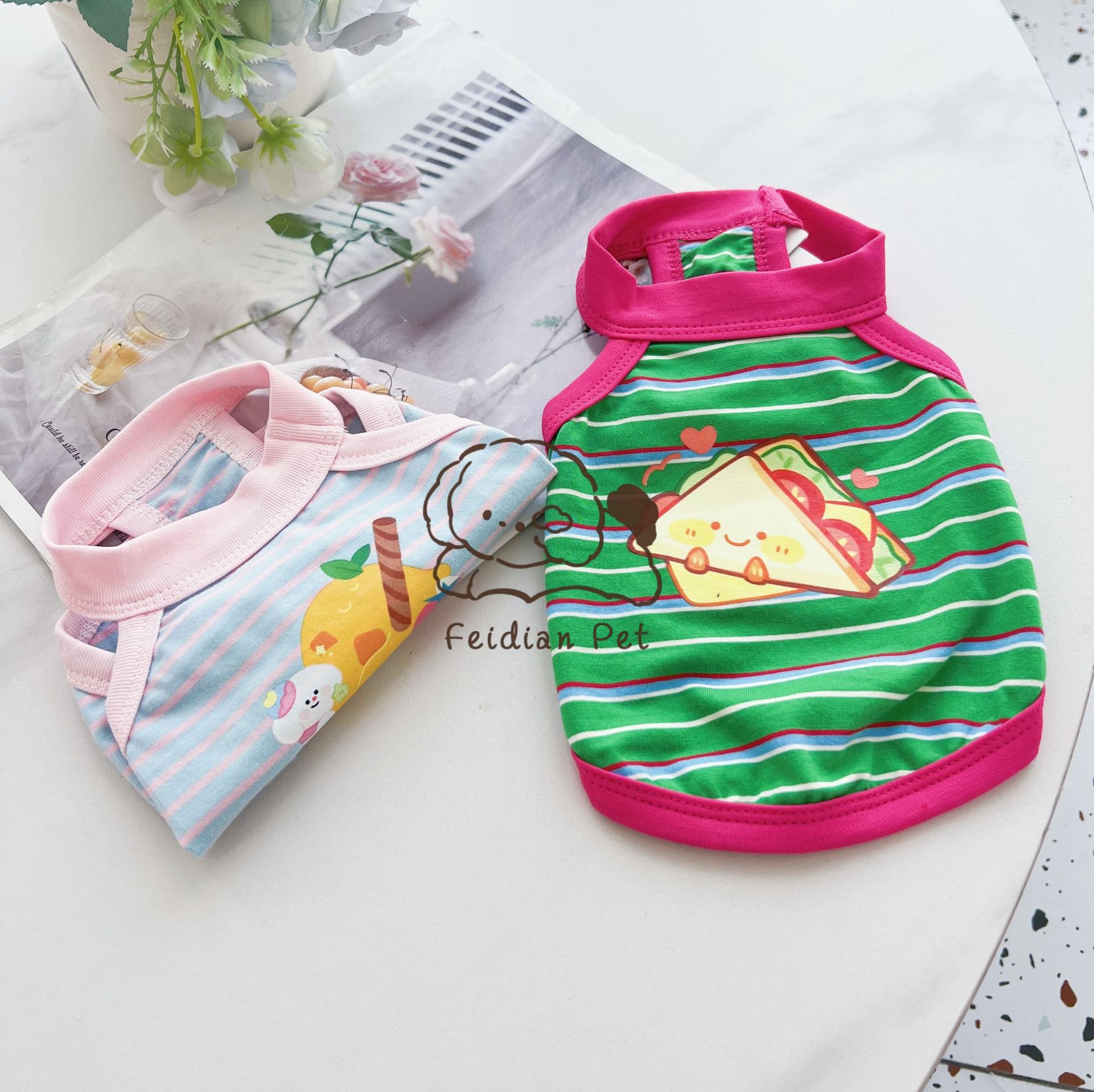 애완 동물 봄과 여름 새로운 명암 색 줄무늬 만화 인쇄 조끼 작은 개와 고양이 통기성 옷 편안한 코튼 티셔츠스토어 가기