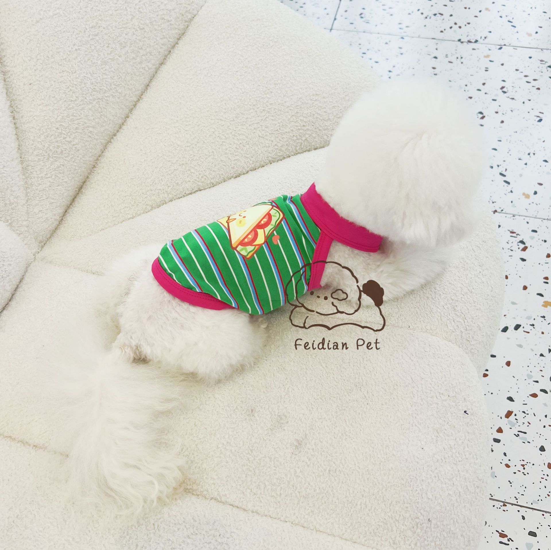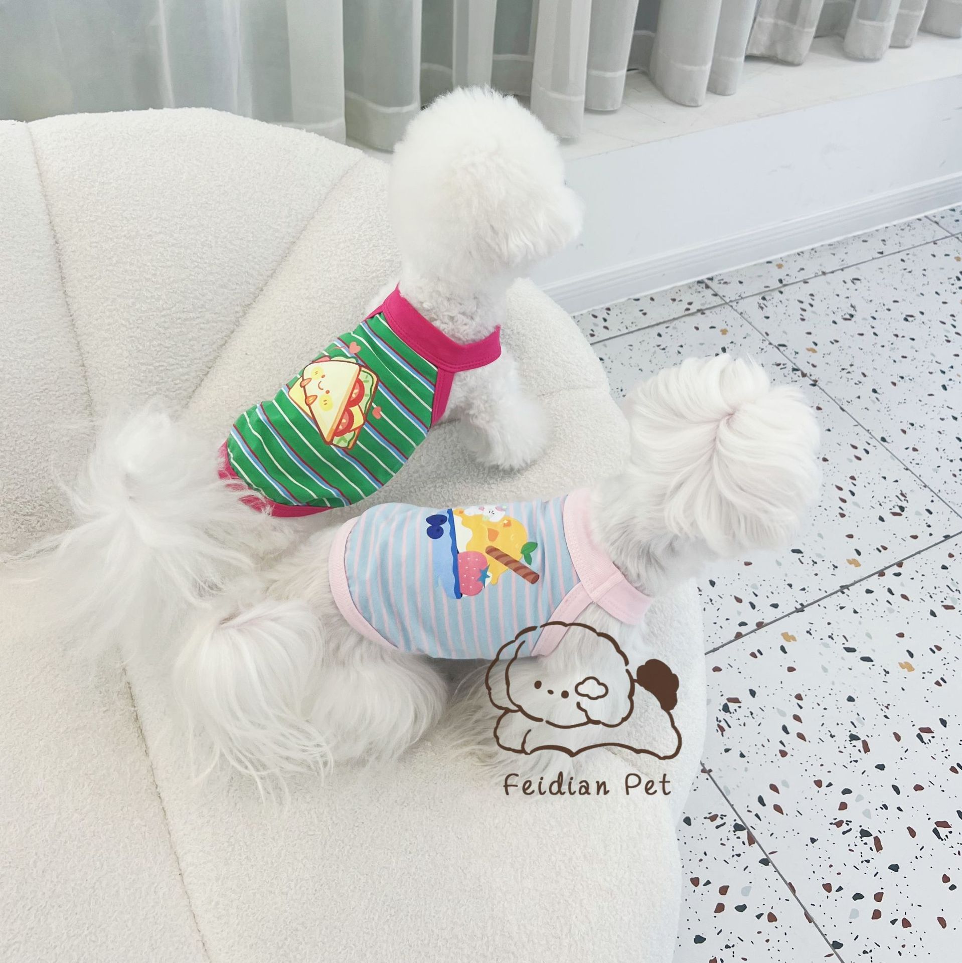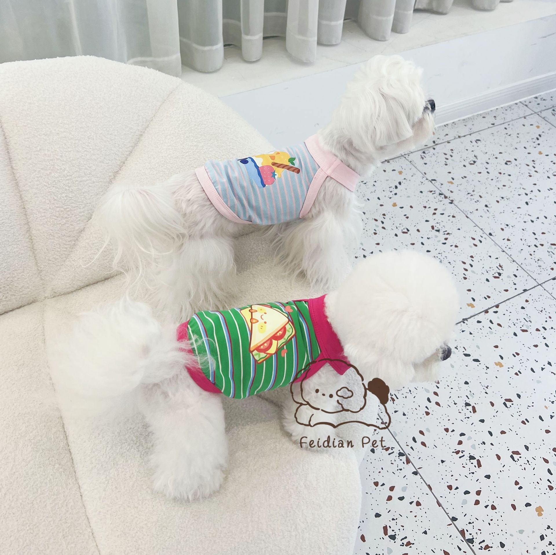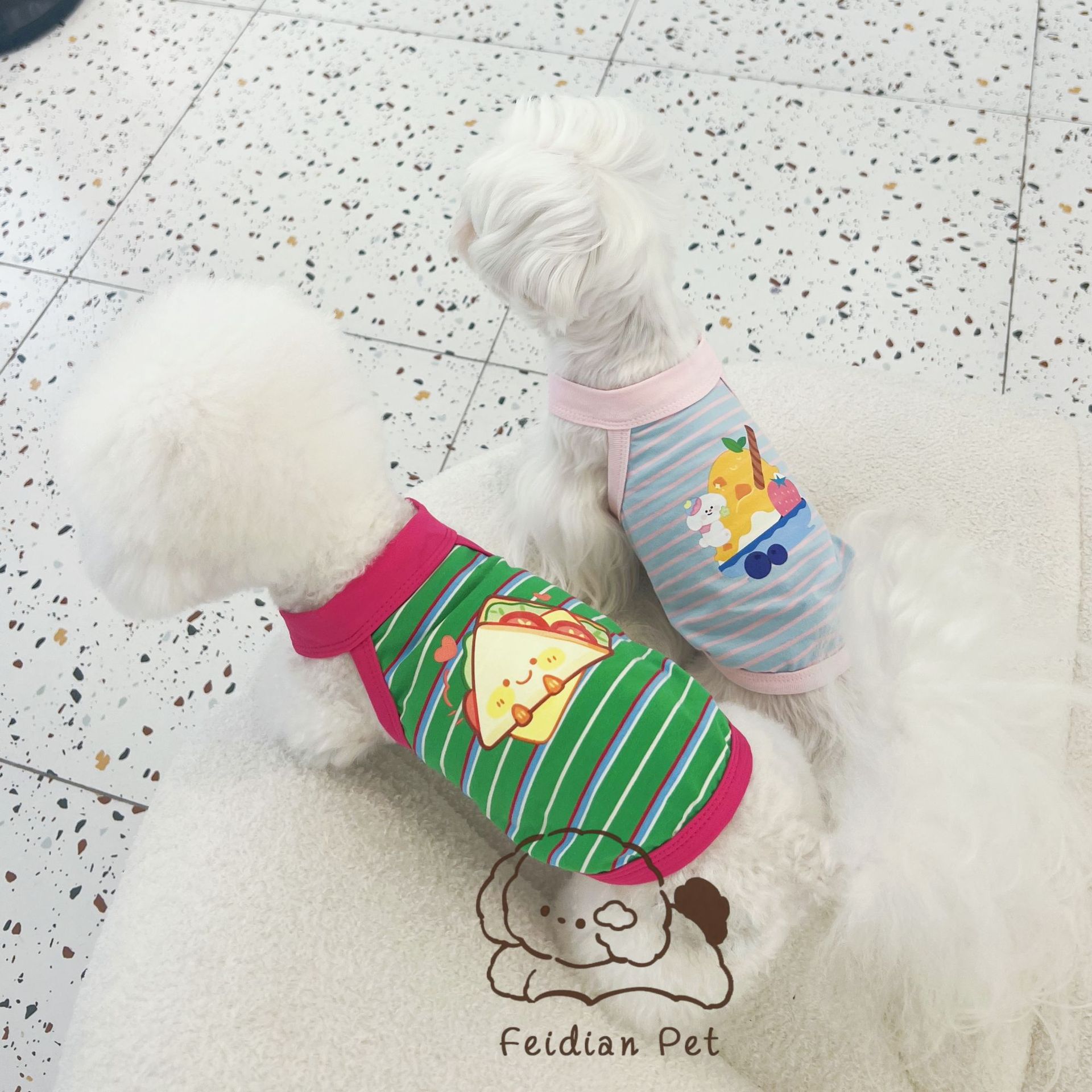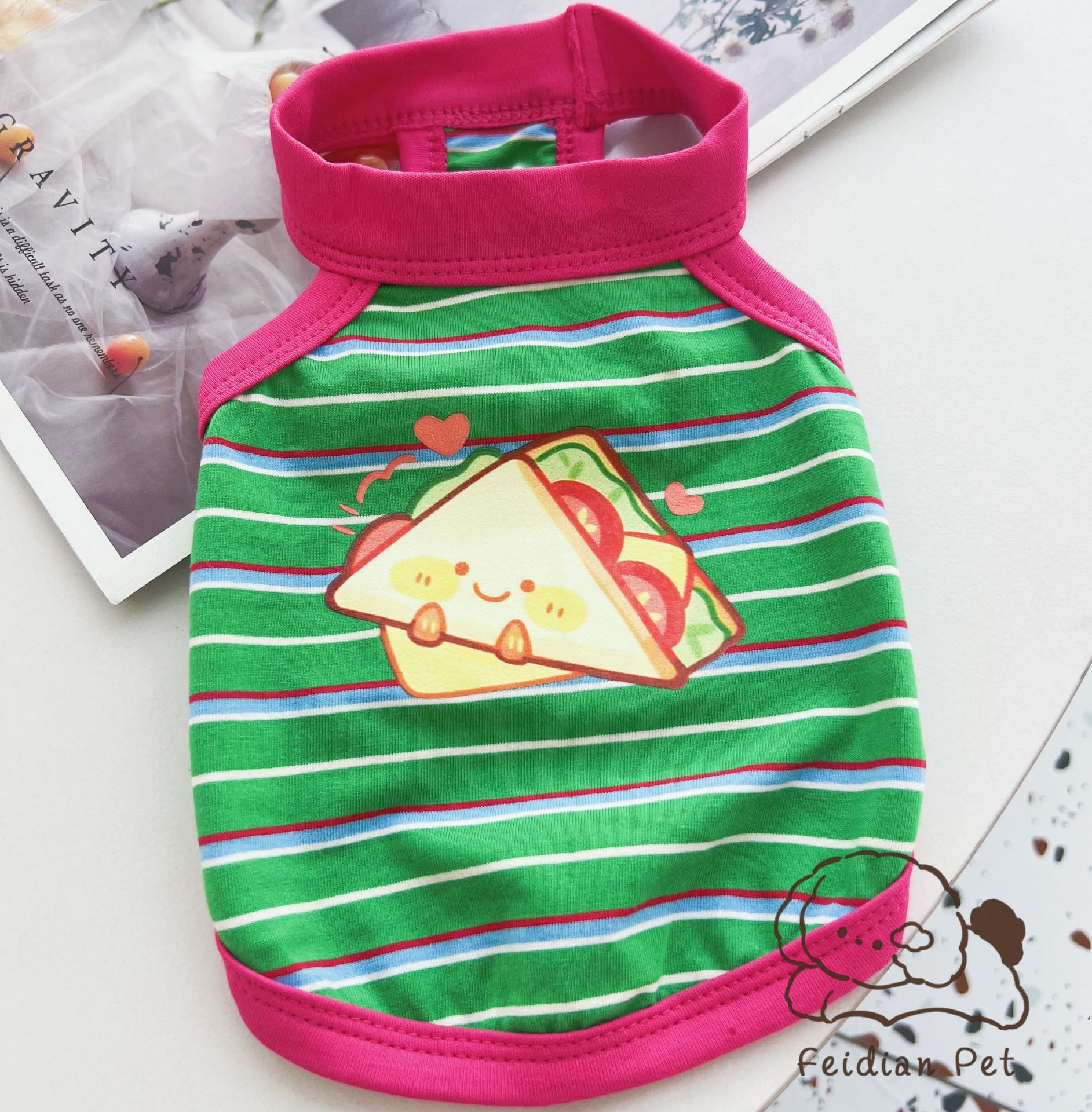 애완 동물 봄과 여름 새로운 명암 색 줄무늬 만화 인쇄 조끼 작은 개와 고양이 통기성 옷 편안한 코튼 티셔츠스토어 가기