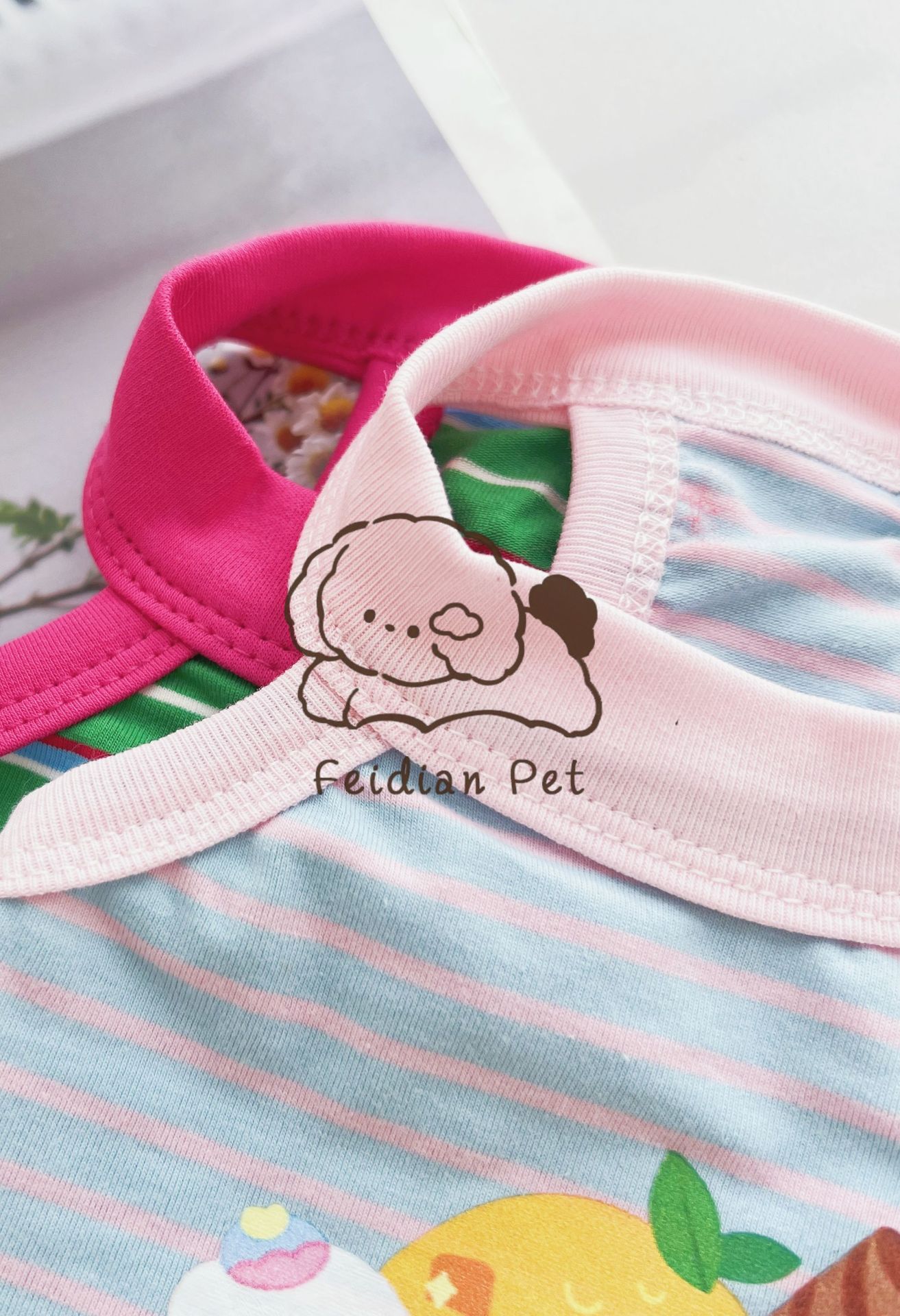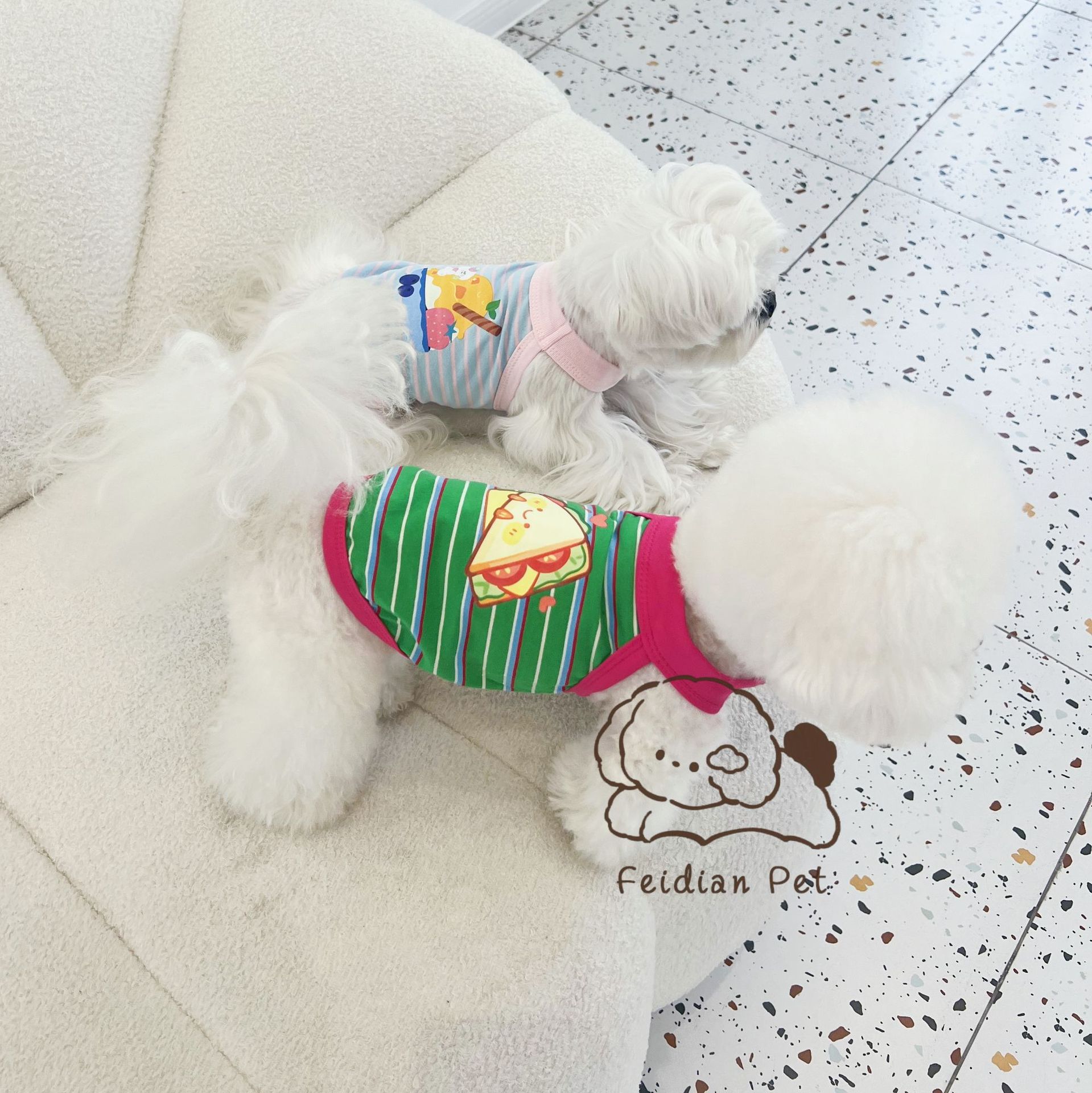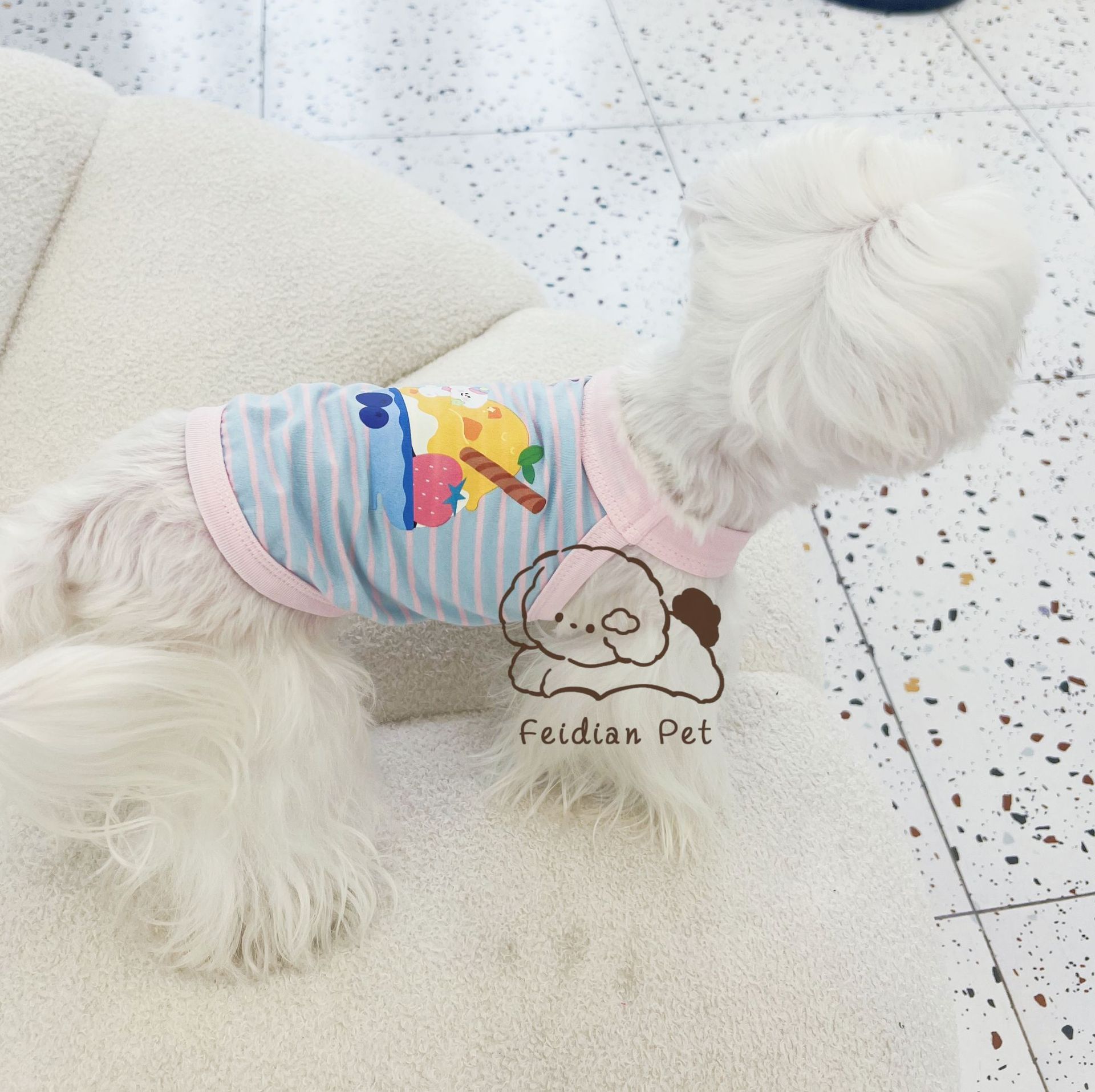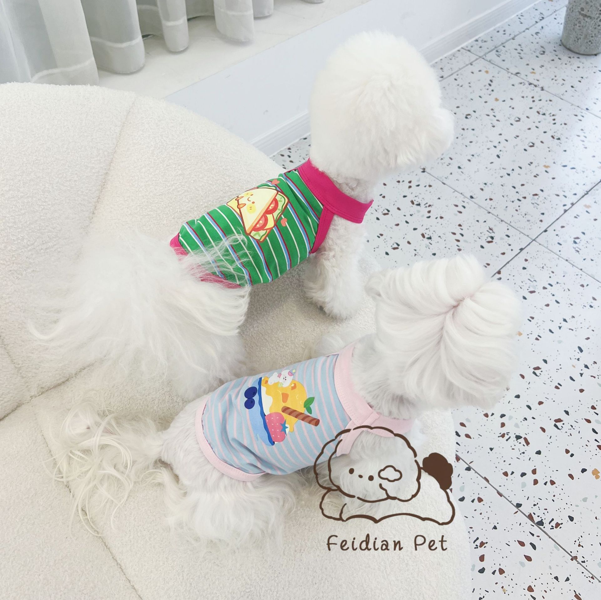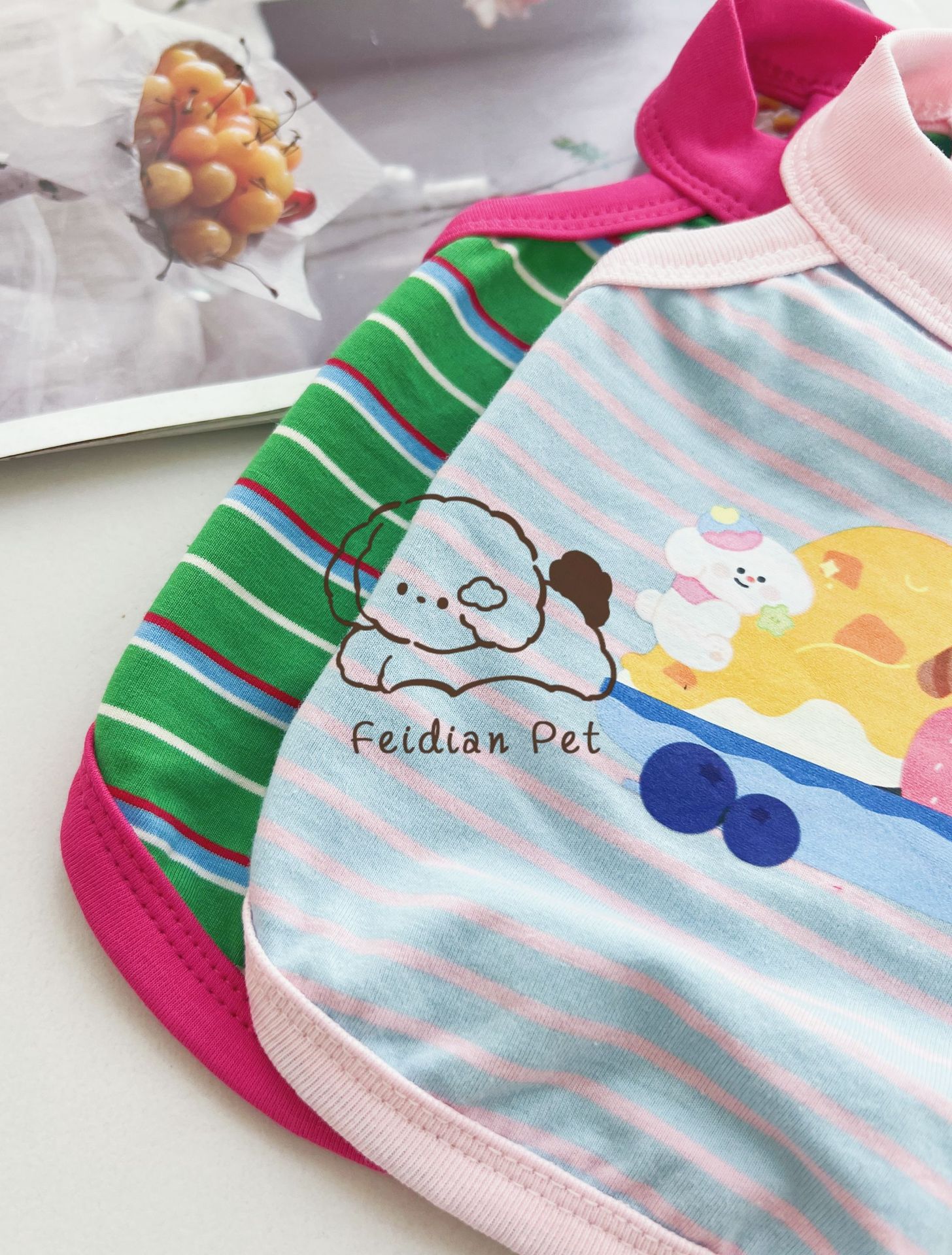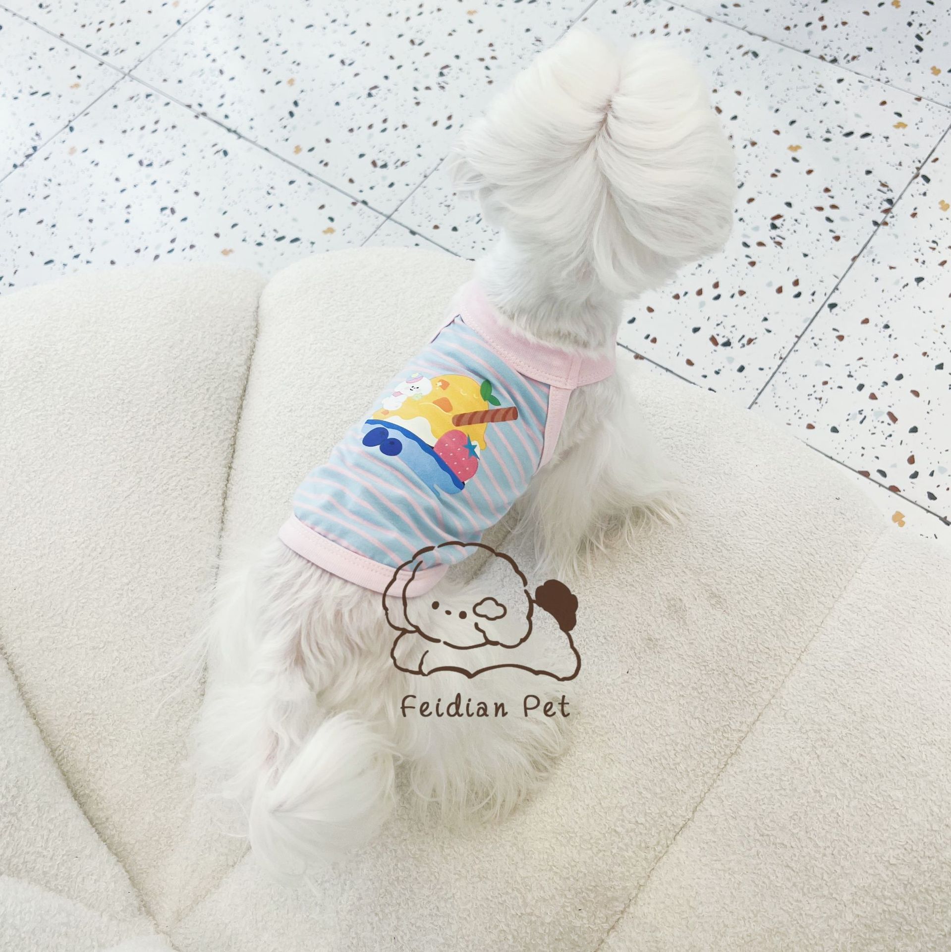 애완 동물 봄과 여름 새로운 명암 색 줄무늬 만화 인쇄 조끼 작은 개와 고양이 통기성 옷 편안한 코튼 티셔츠스토어 가기