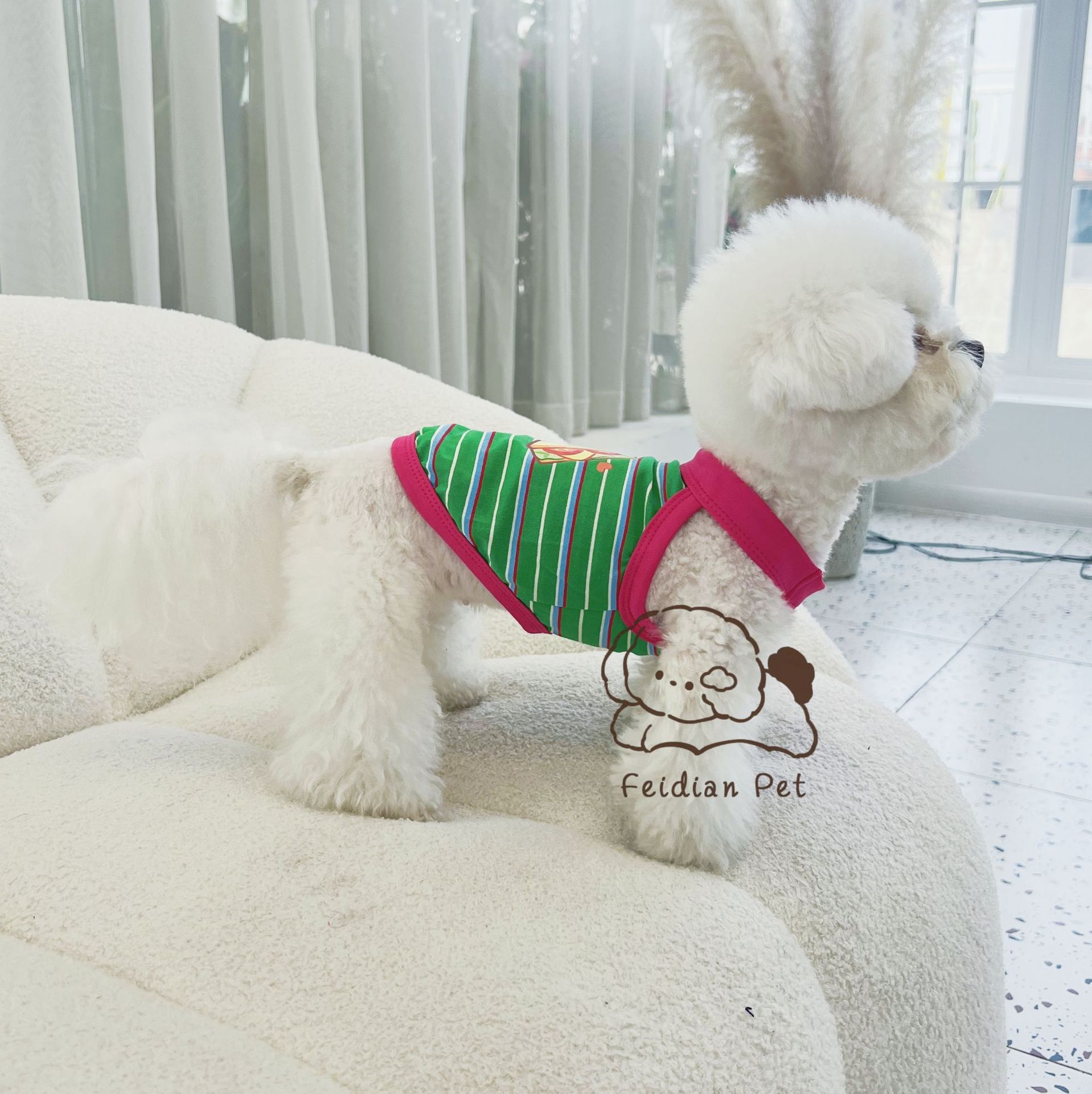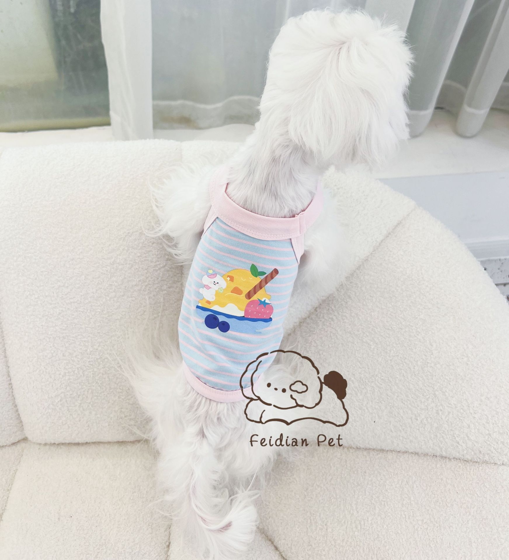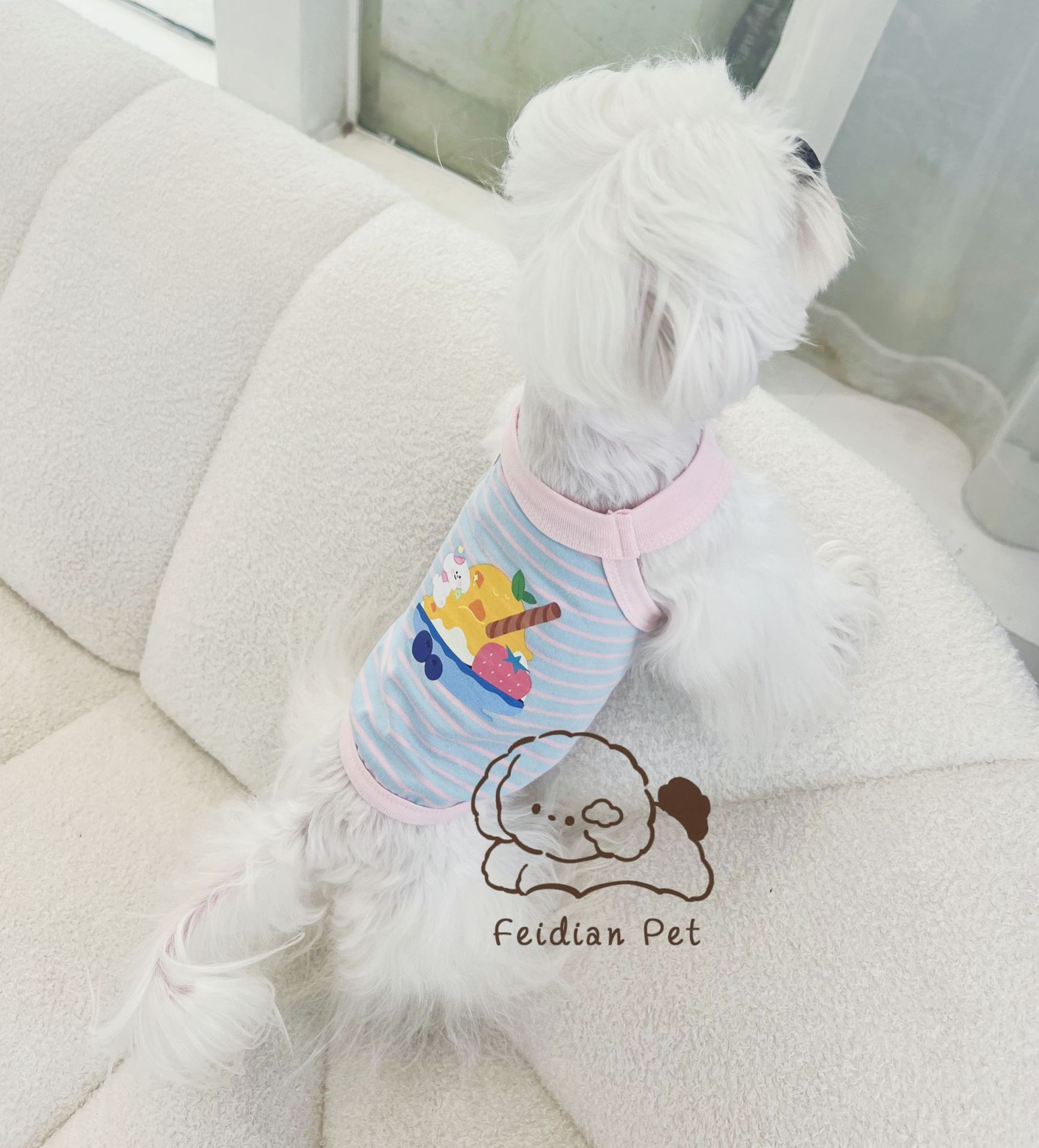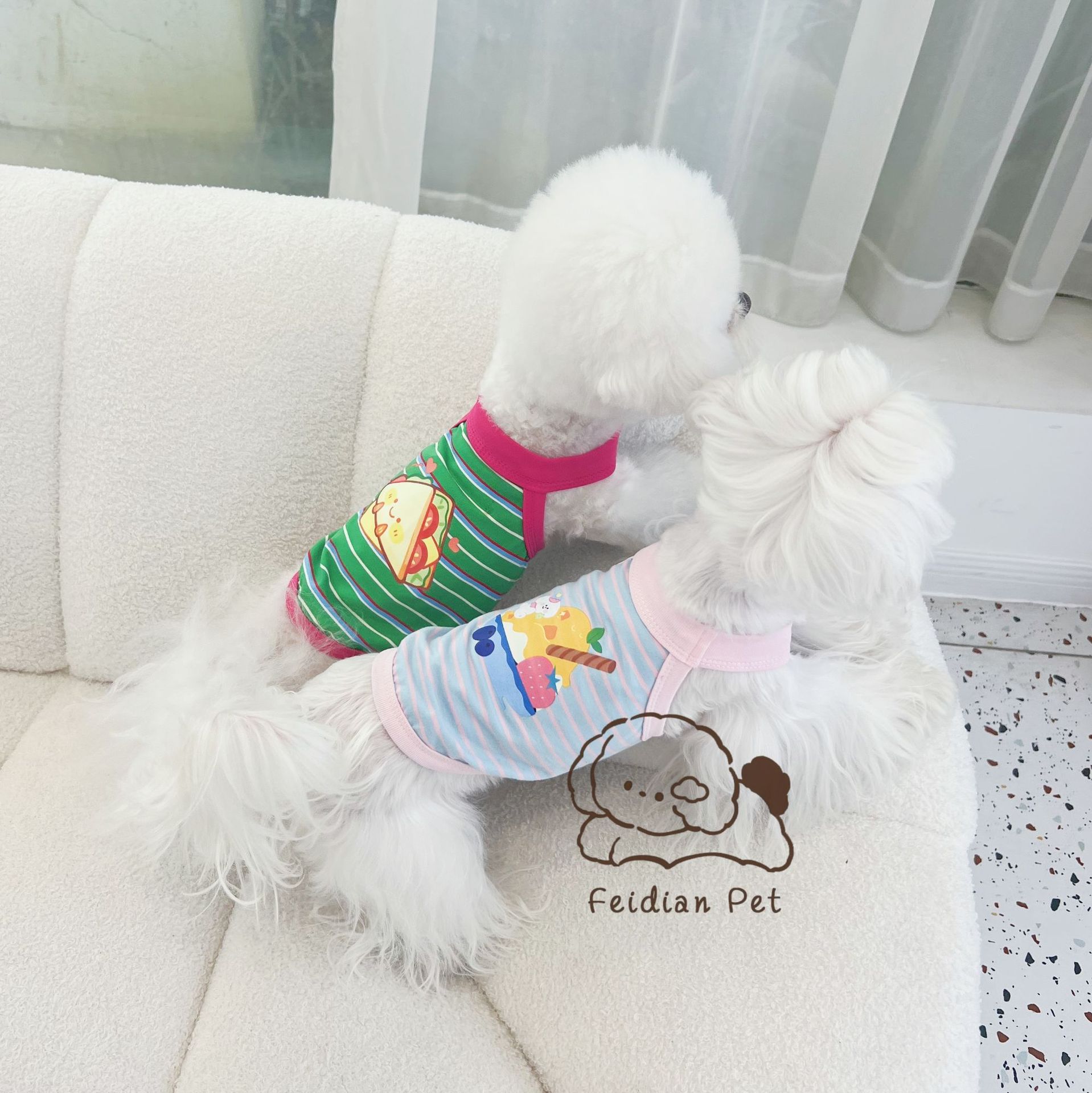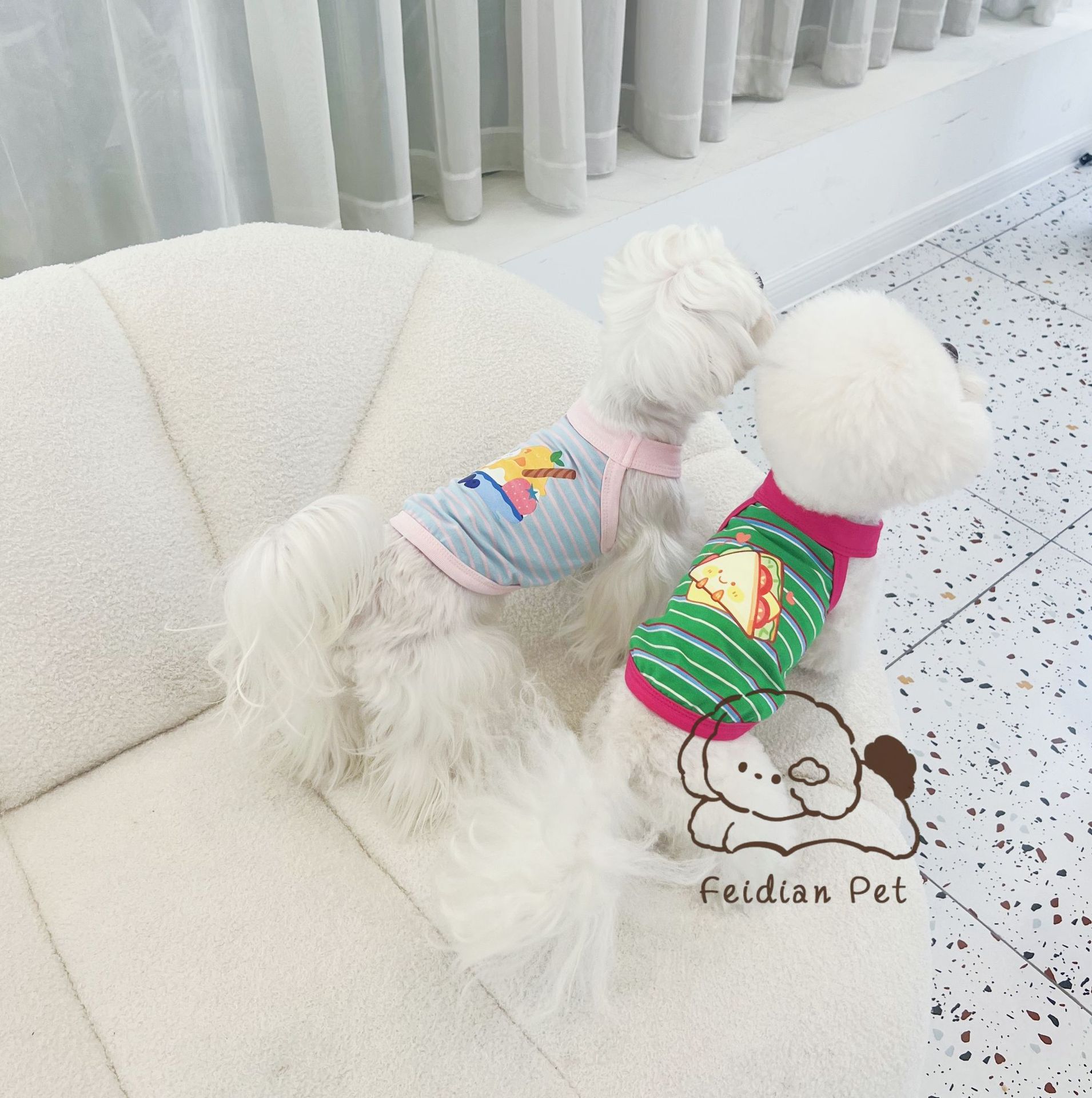 애완 동물 봄과 여름 새로운 명암 색 줄무늬 만화 인쇄 조끼 작은 개와 고양이 통기성 옷 편안한 코튼 티셔츠스토어 가기