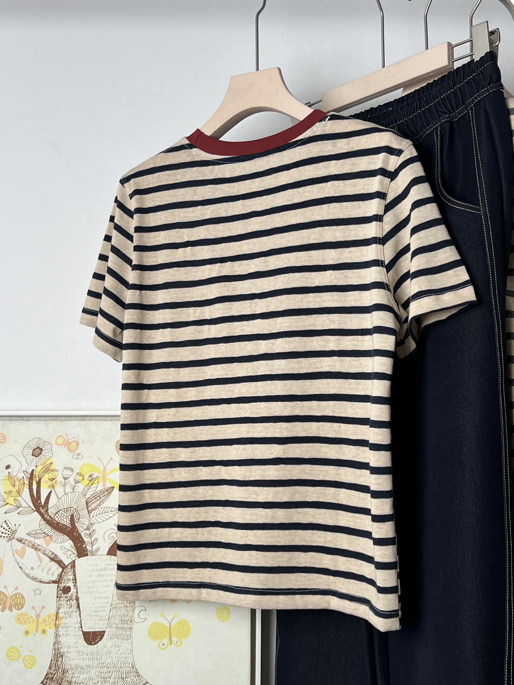 디자인 센스 틈새 기본은 2025 년에 따지지 않습니다 봄 여름 여성을위한 한국 라운드 넥 컬러 스트라이프 반팔 티셔츠