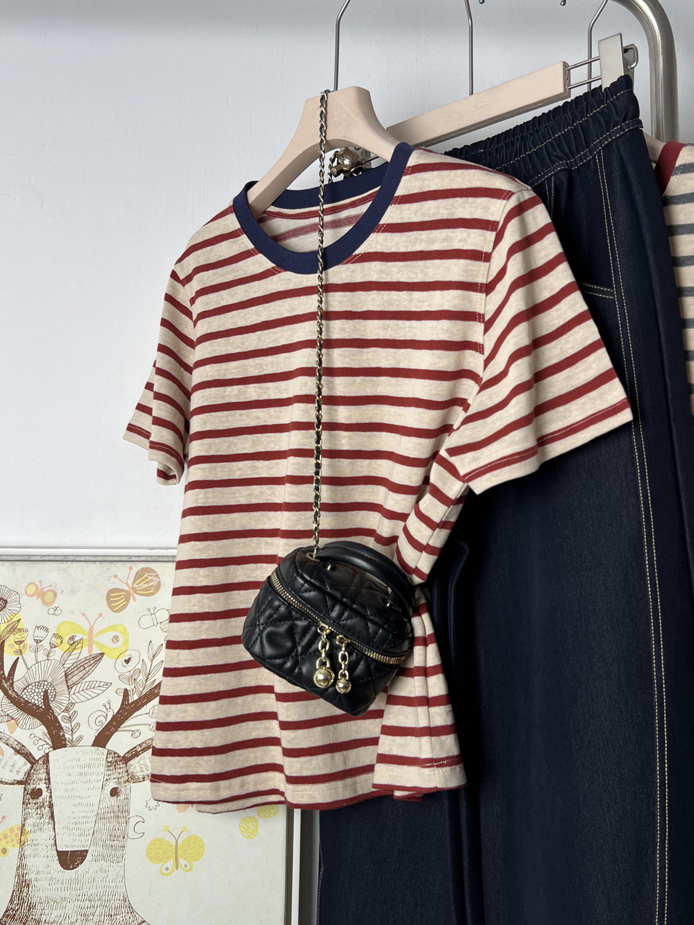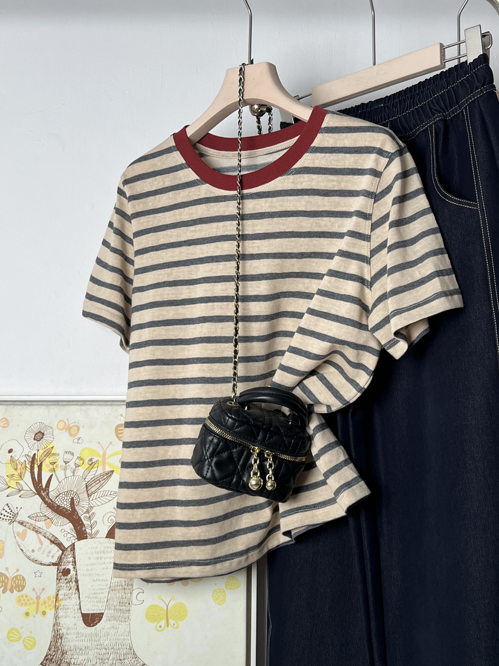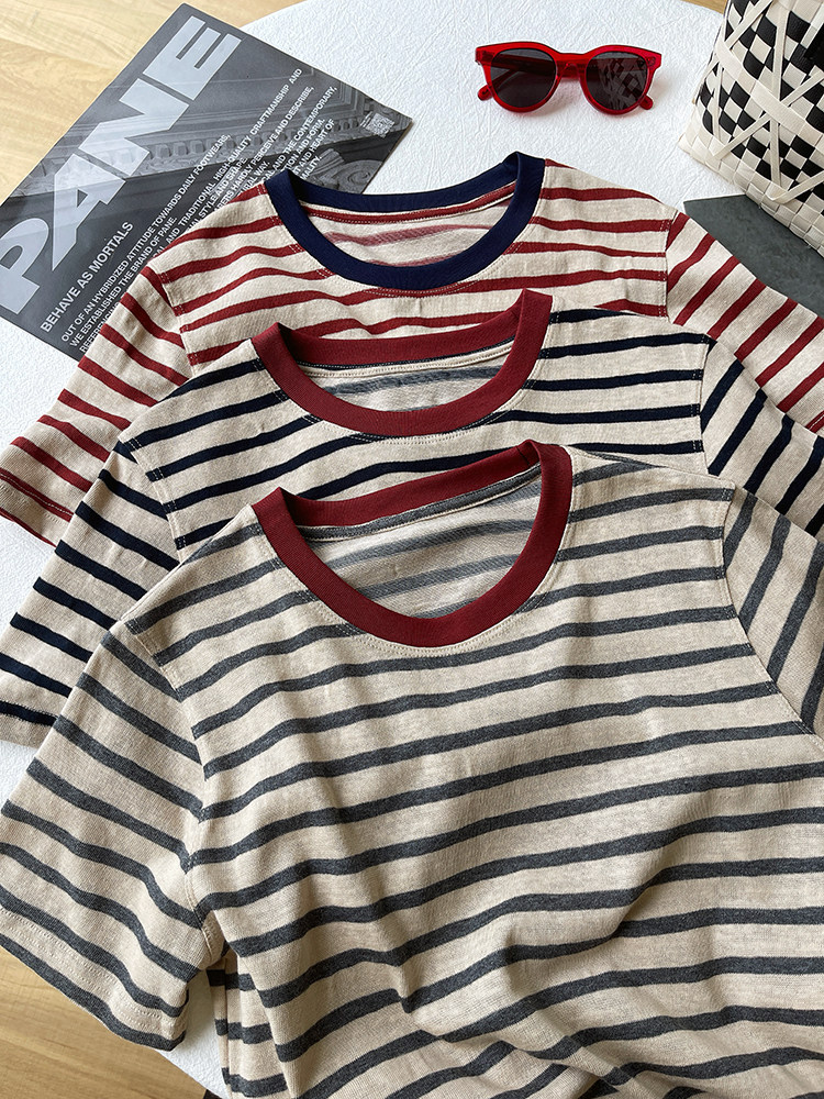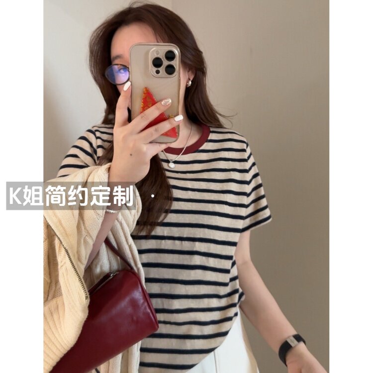 디자인 센스 틈새 기본은 2025 년에 따지지 않습니다 봄 여름 여성을위한 한국 라운드 넥 컬러 스트라이프 반팔 티셔츠스토어 가기