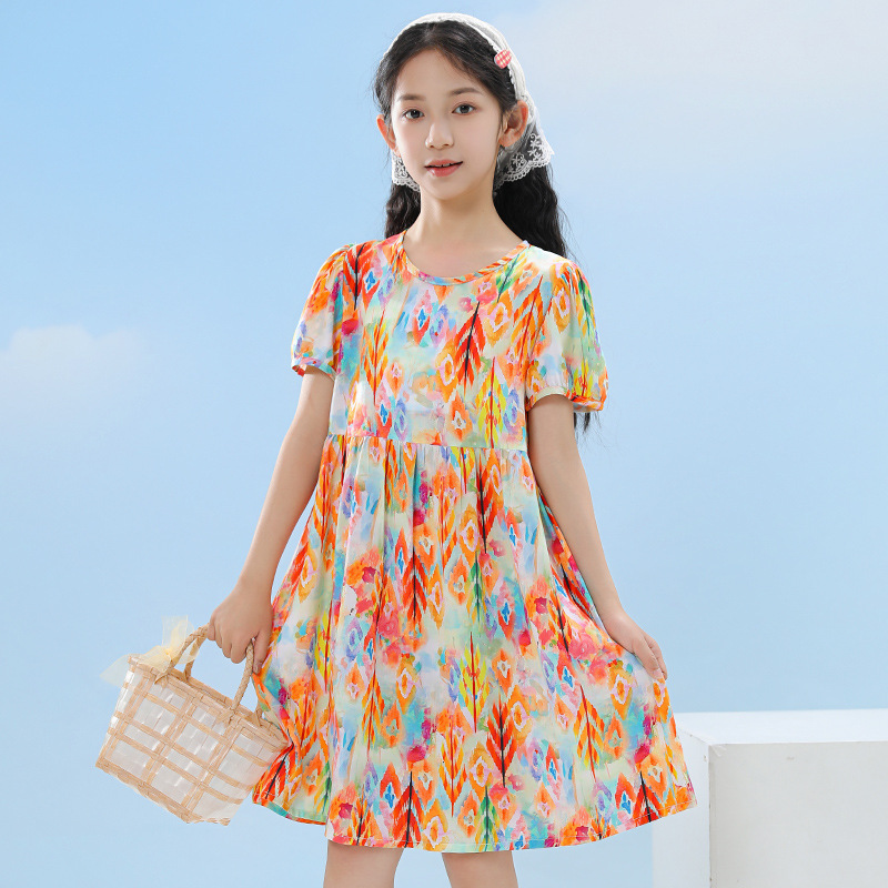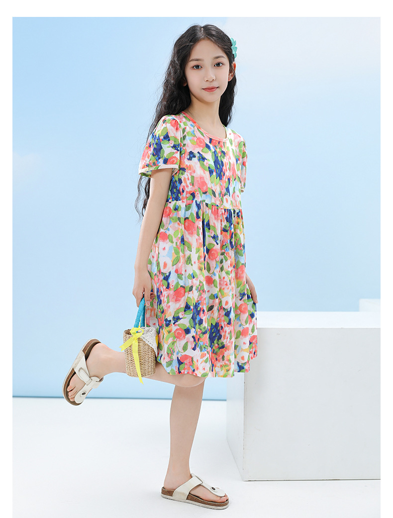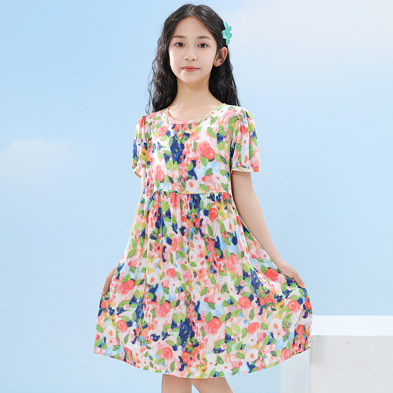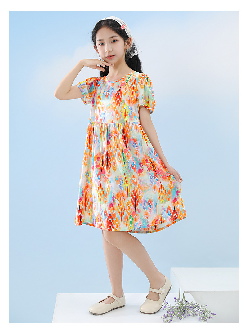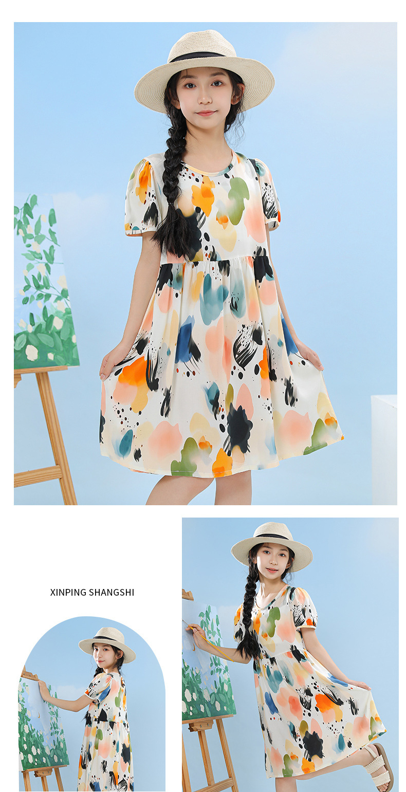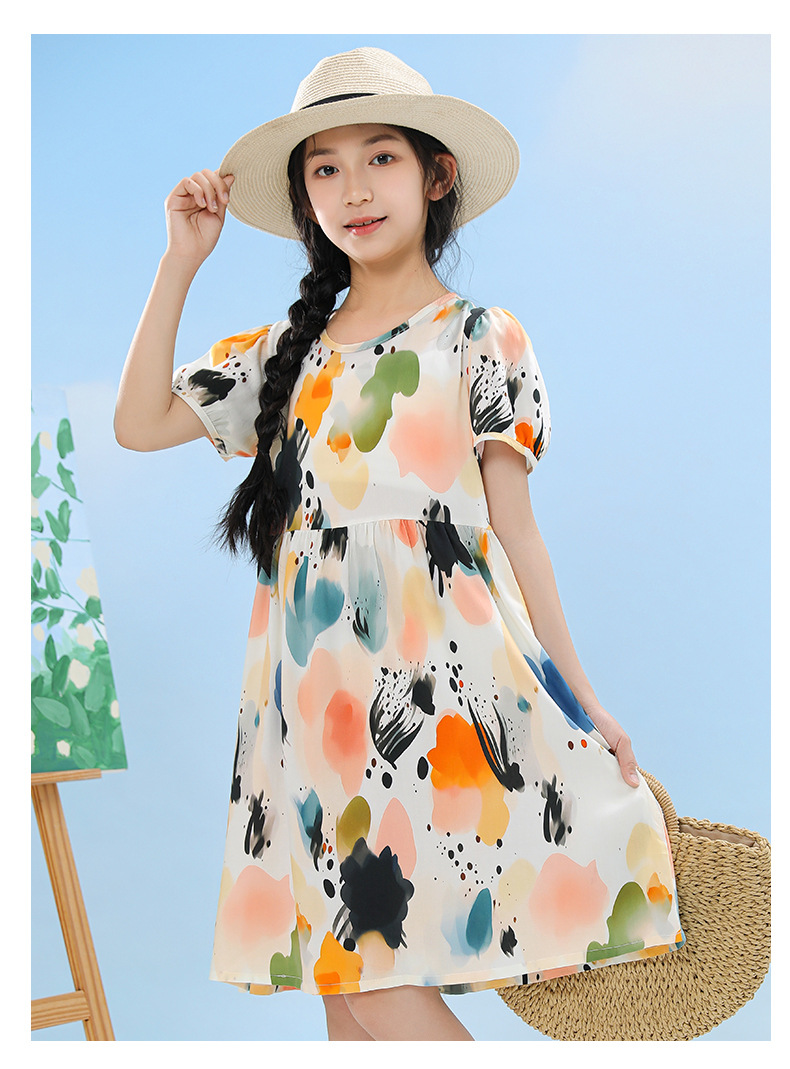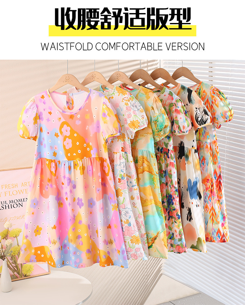 여름 어린이 페인트 퍼프 슬리브 드레스 2025 중대형 소녀 라운드 넥 통기성 반팔 꽃 공주 드레스스토어 가기