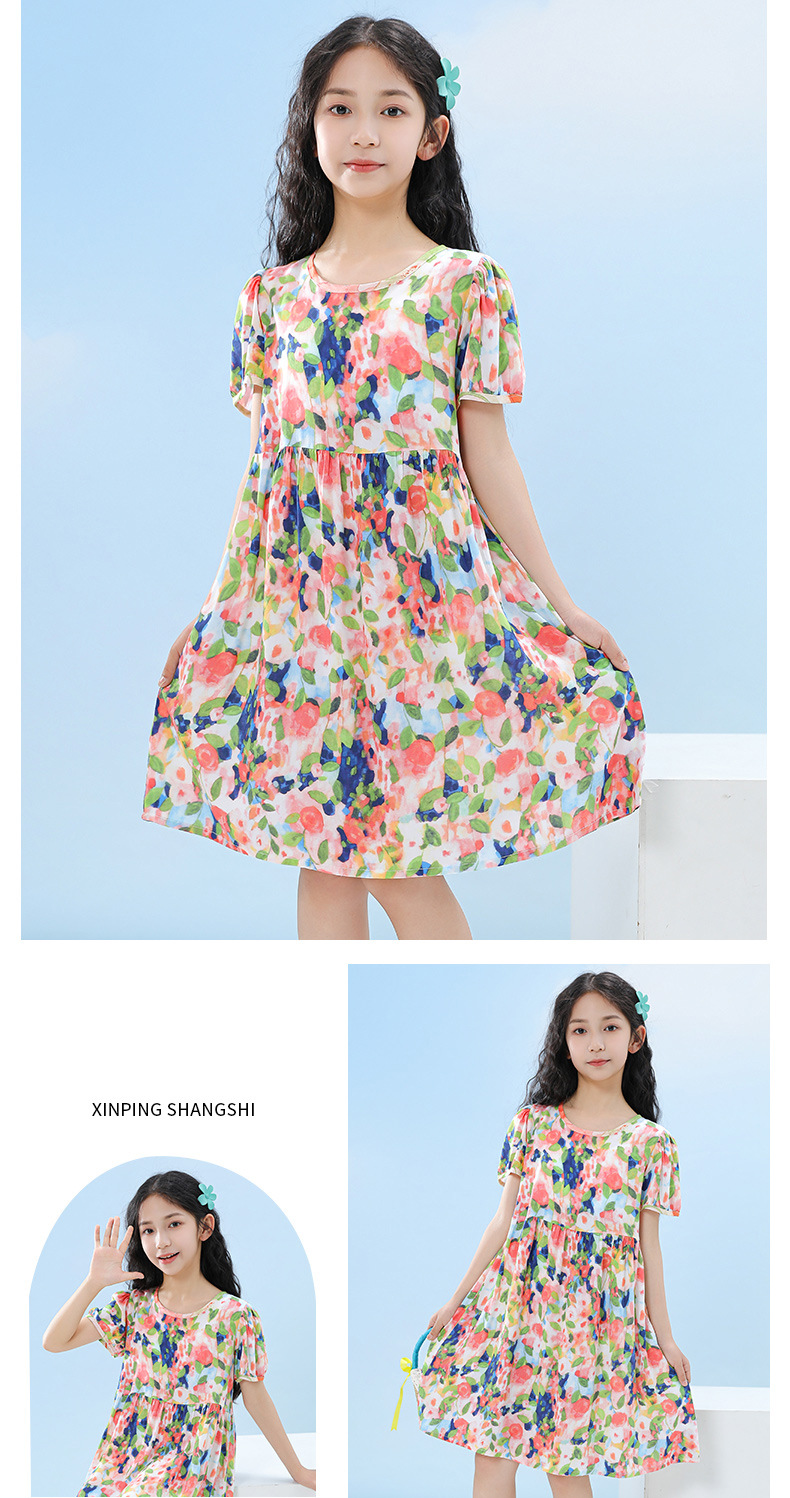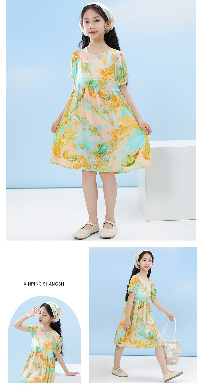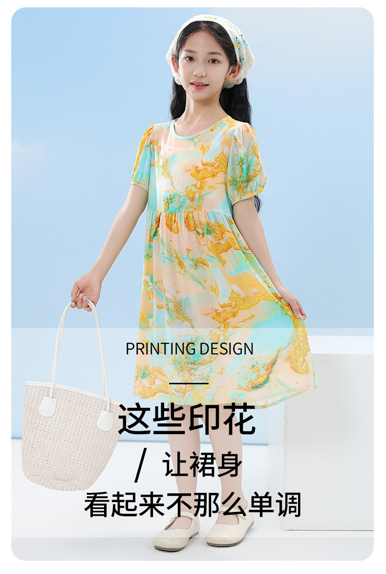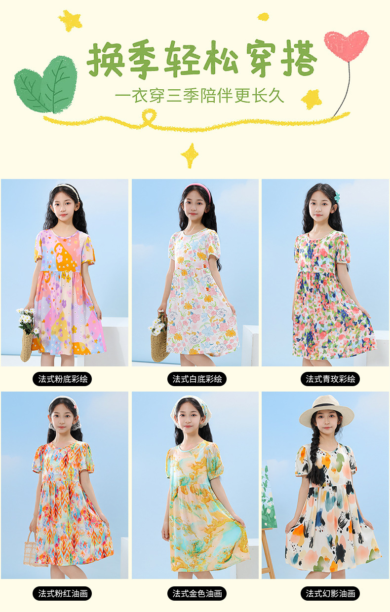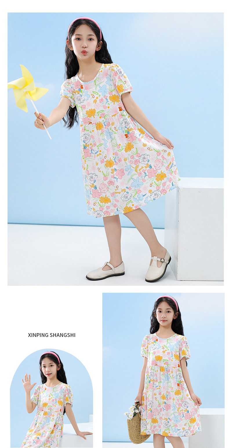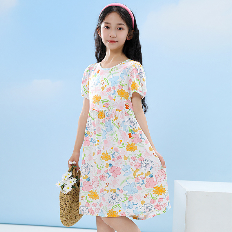 여름 어린이 페인트 퍼프 슬리브 드레스 2025 중대형 소녀 라운드 넥 통기성 반팔 꽃 공주 드레스스토어 가기