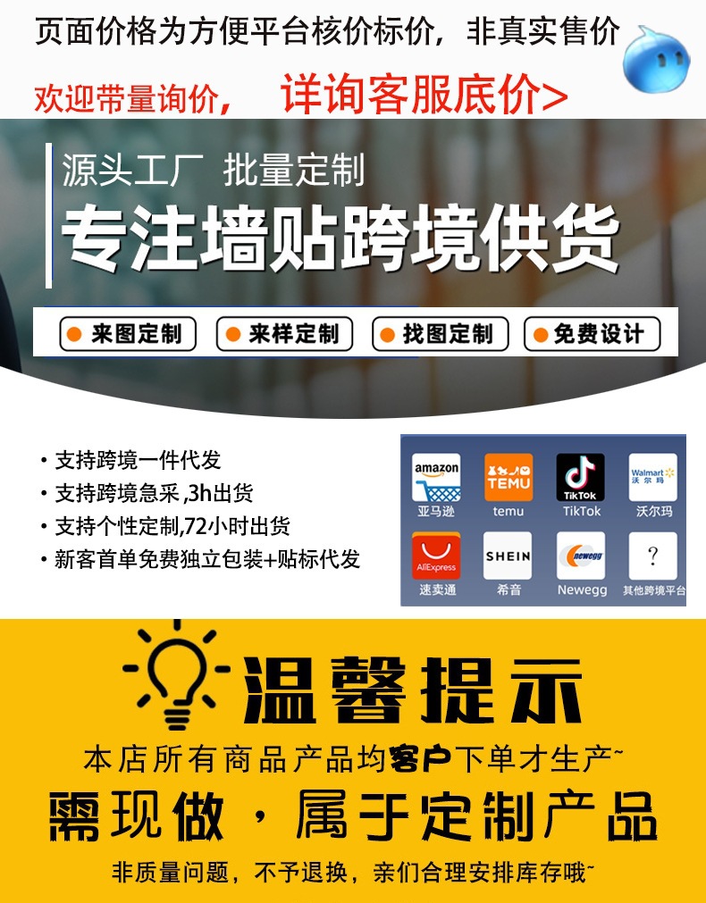 3、 若粘贴的墙面受潮、老化或刚刷了新漆,粘贴后可能会引起墙贴自动脱落,或者会引起墙面剥落,可以用吹风机热风将墙面吹干或待漆面挥发一段时间后再贴,但效果可能会有所出入,所以敬请广大顾客慎选所贴位置;