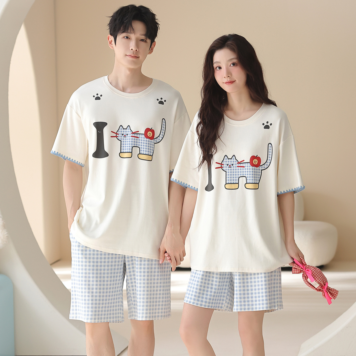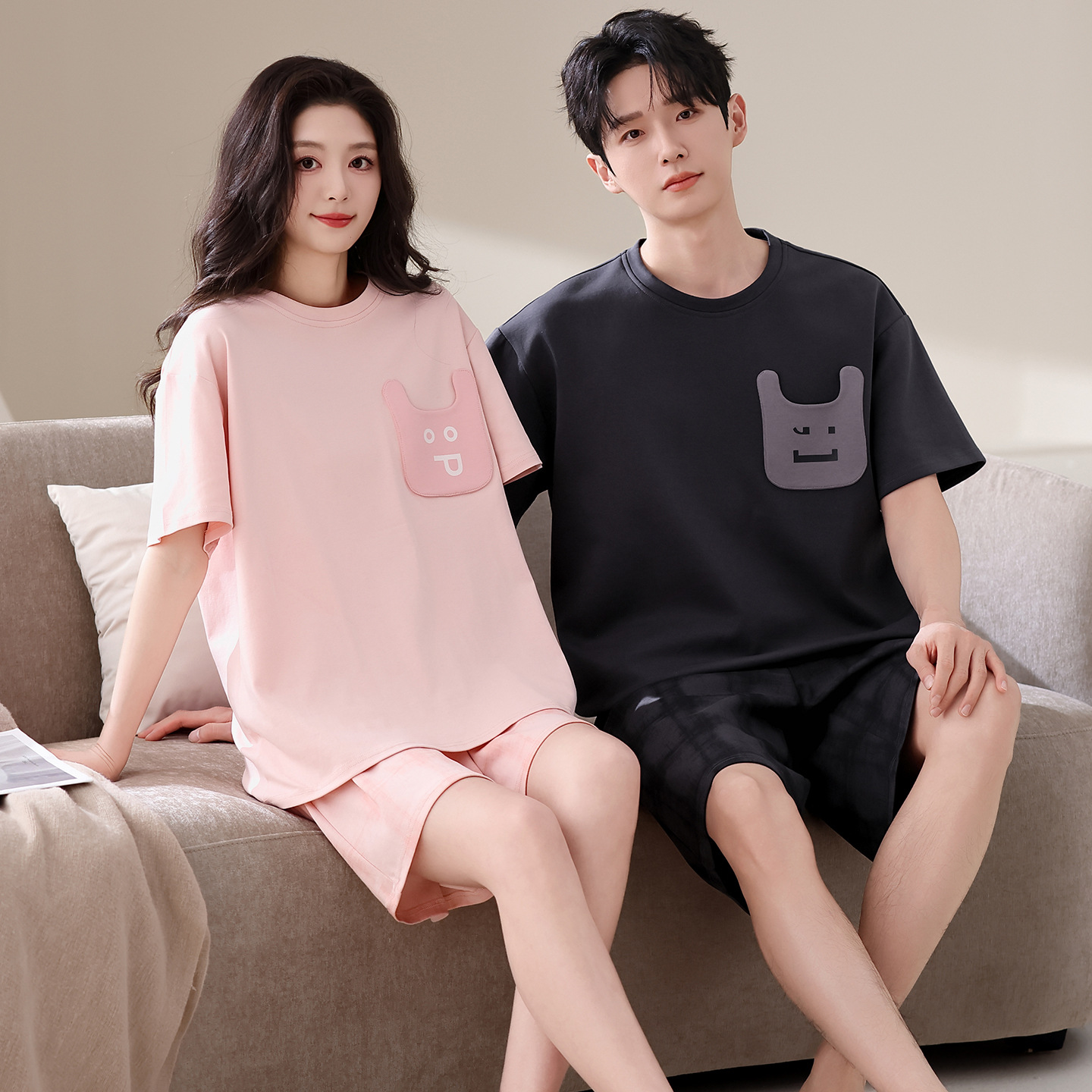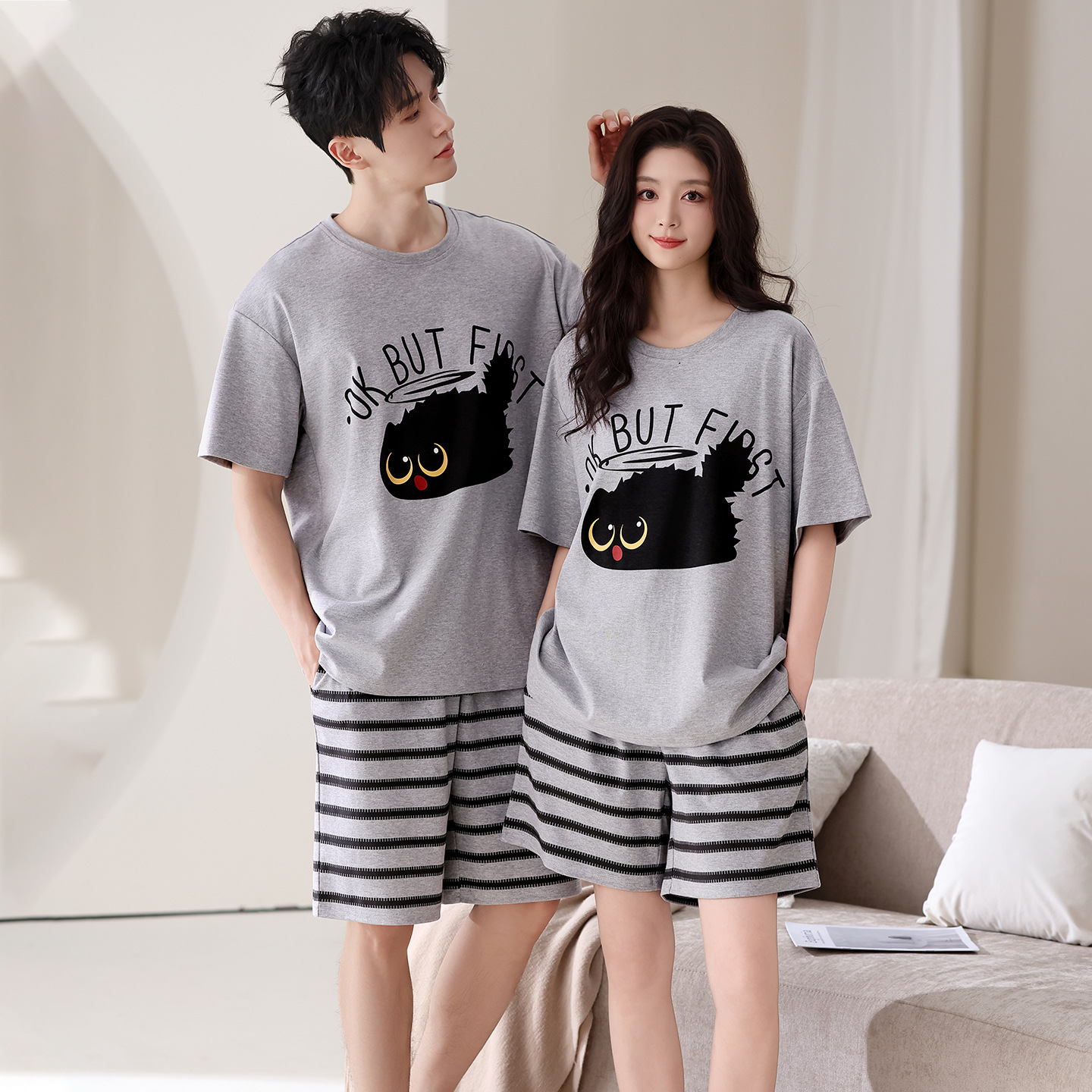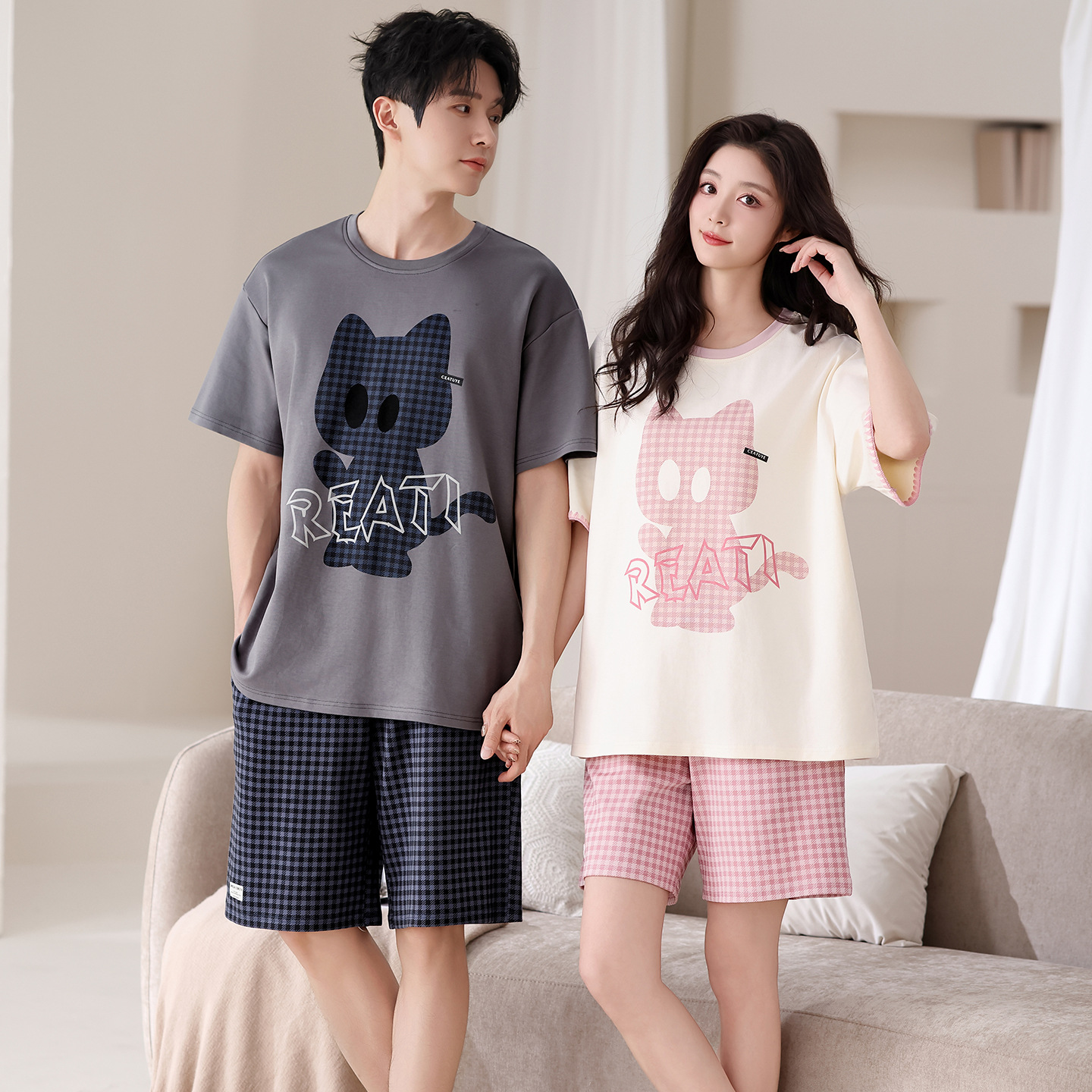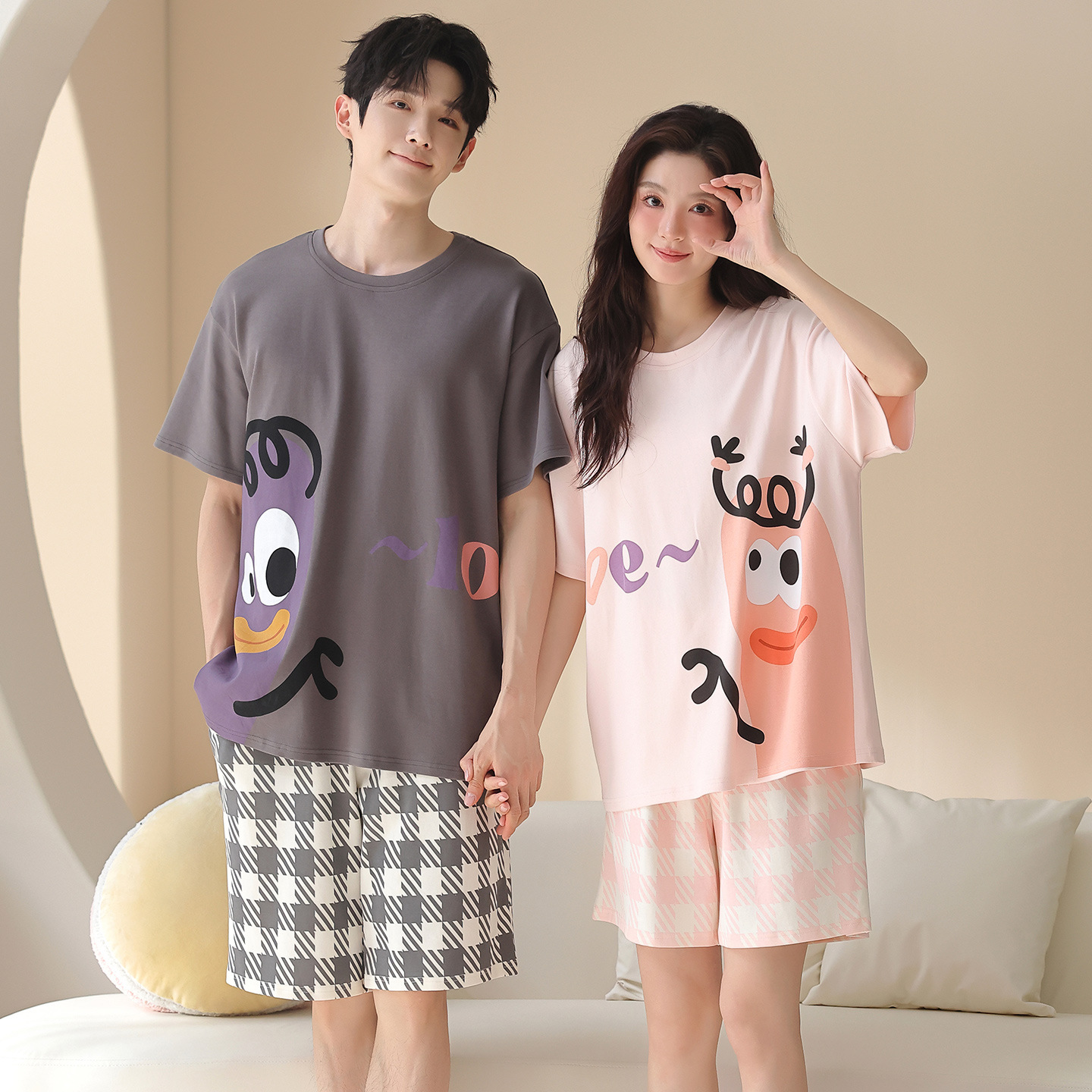 Ins 스타일 만화 반팔 반바지 커플 잠옷 여름 십대 여성 및 남성 느슨한 캐주얼 홈 옷스토어 가기