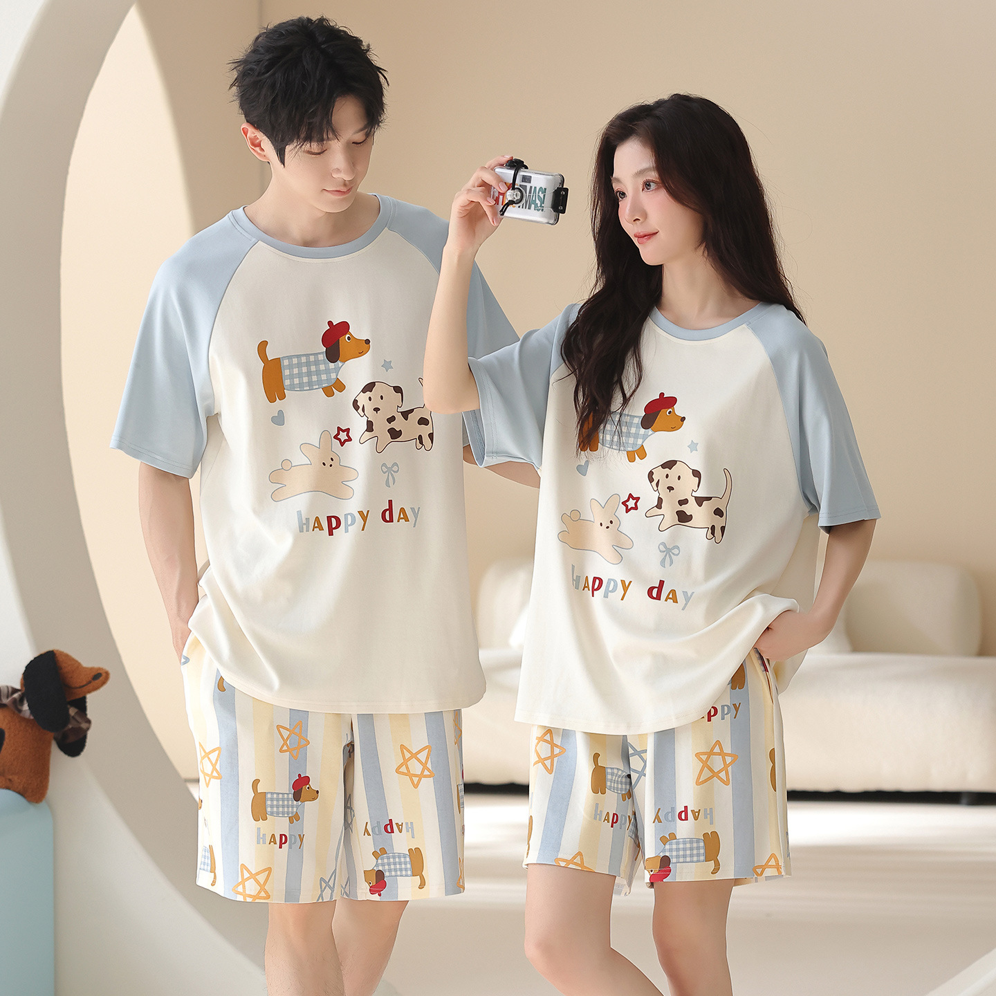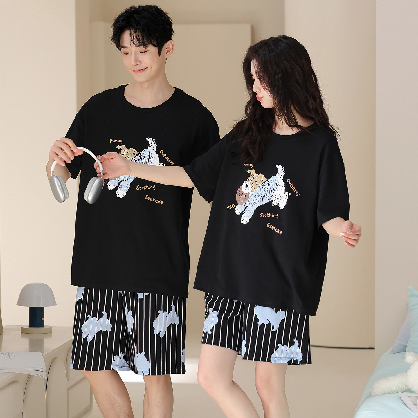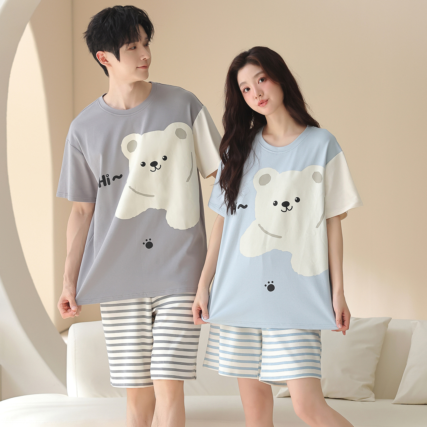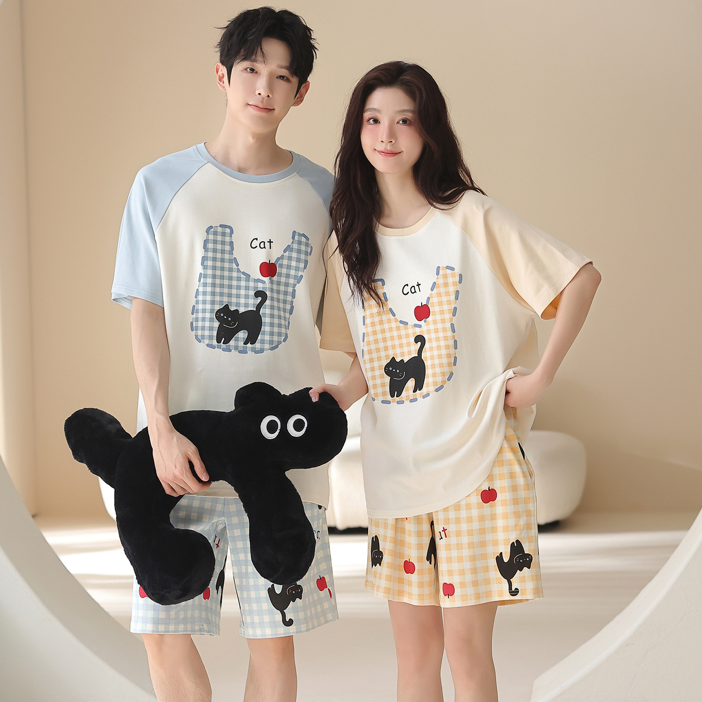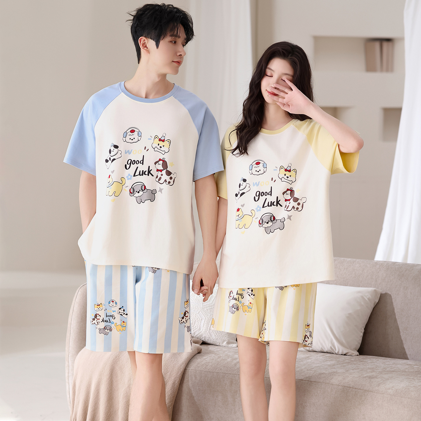 Ins 스타일 만화 반팔 반바지 커플 잠옷 여름 십대 여성 및 남성 느슨한 캐주얼 홈 옷스토어 가기
