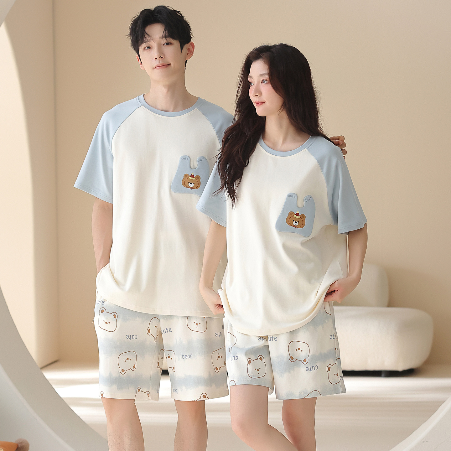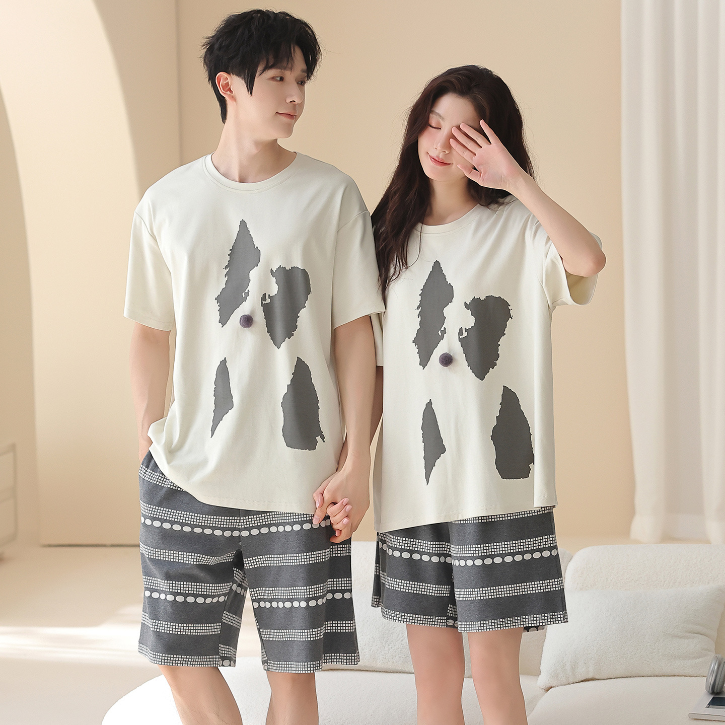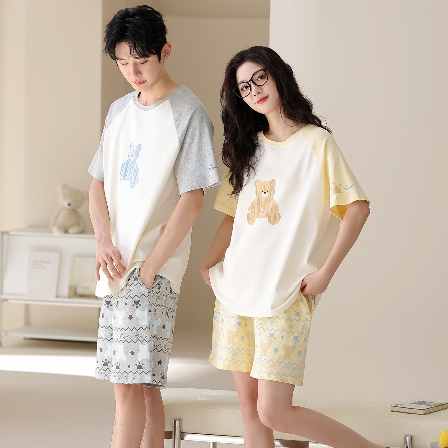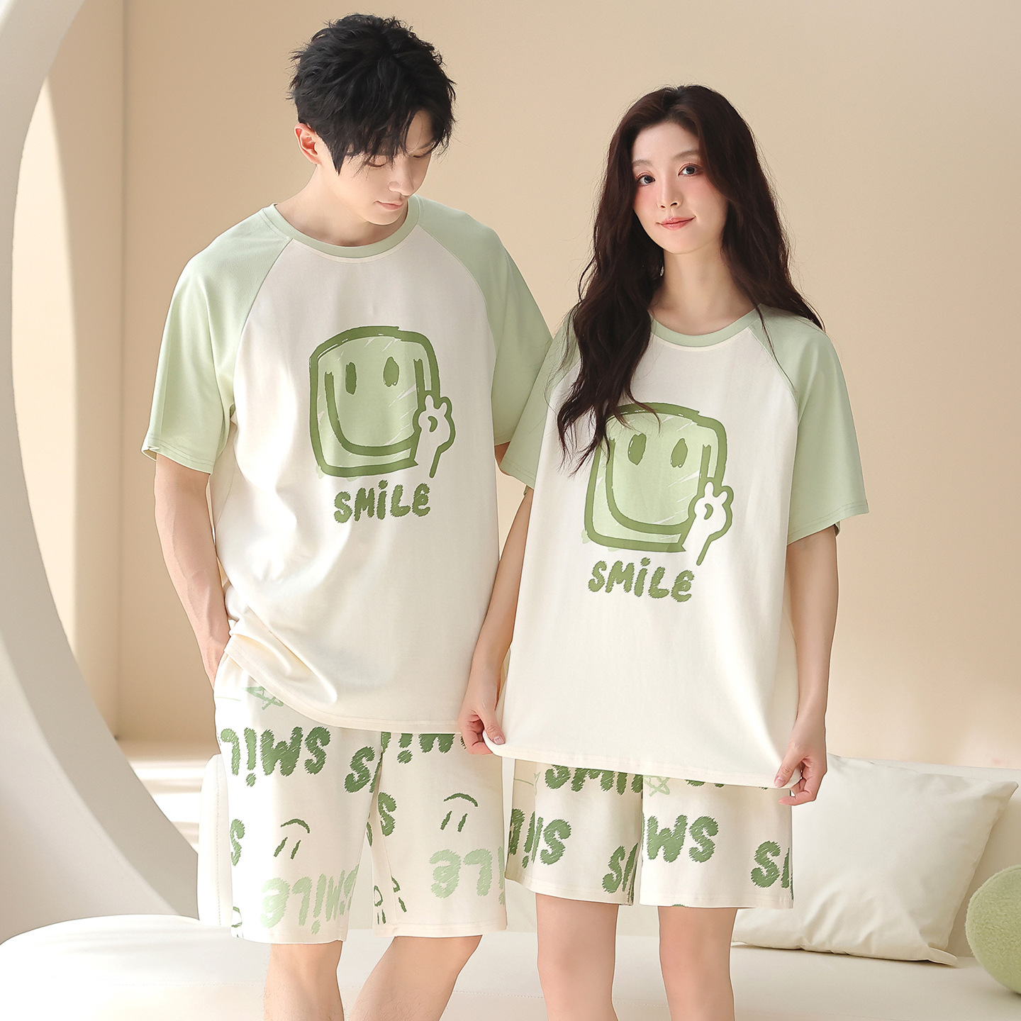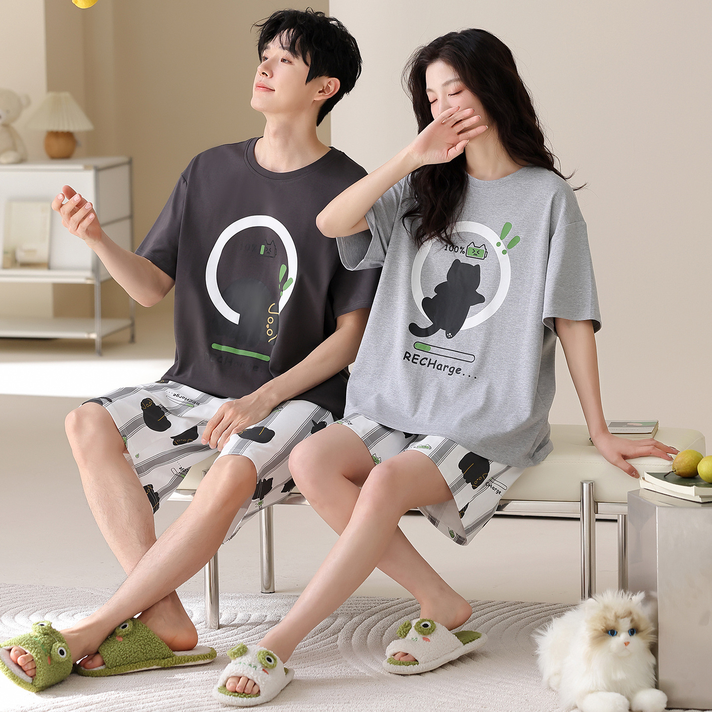 Ins 스타일 만화 반팔 반바지 커플 잠옷 여름 십대 여성 및 남성 느슨한 캐주얼 홈 옷스토어 가기