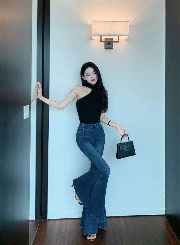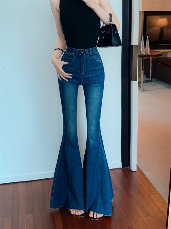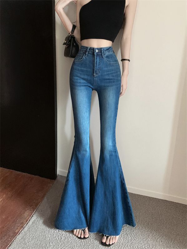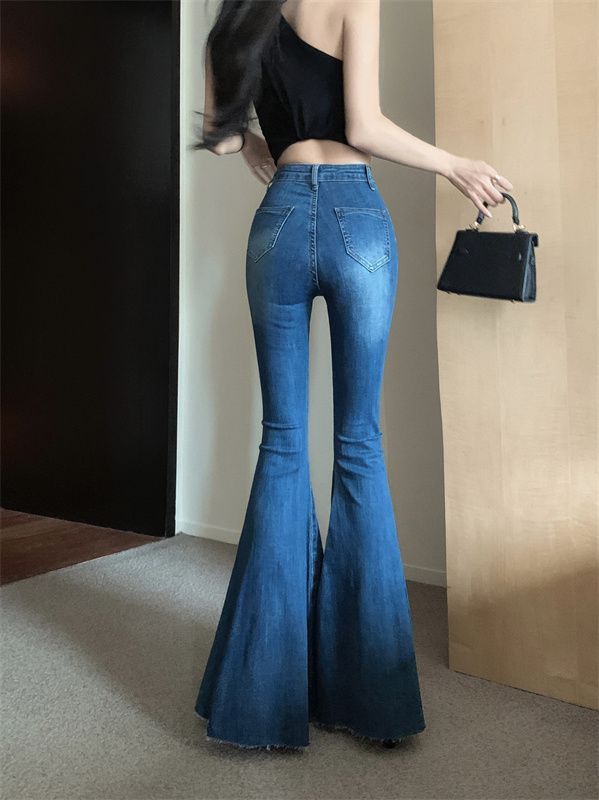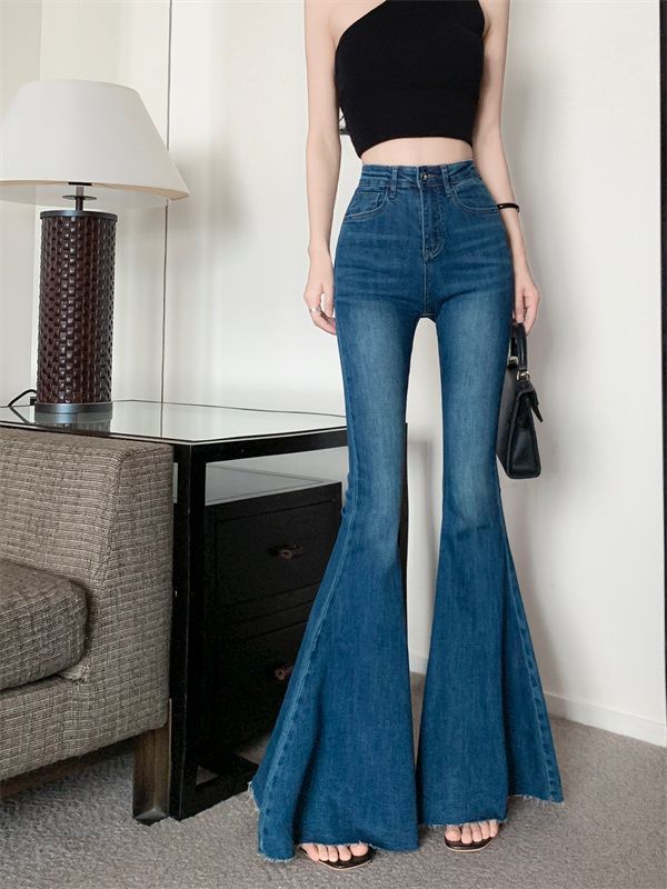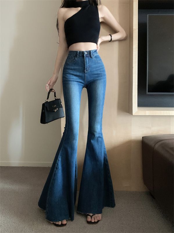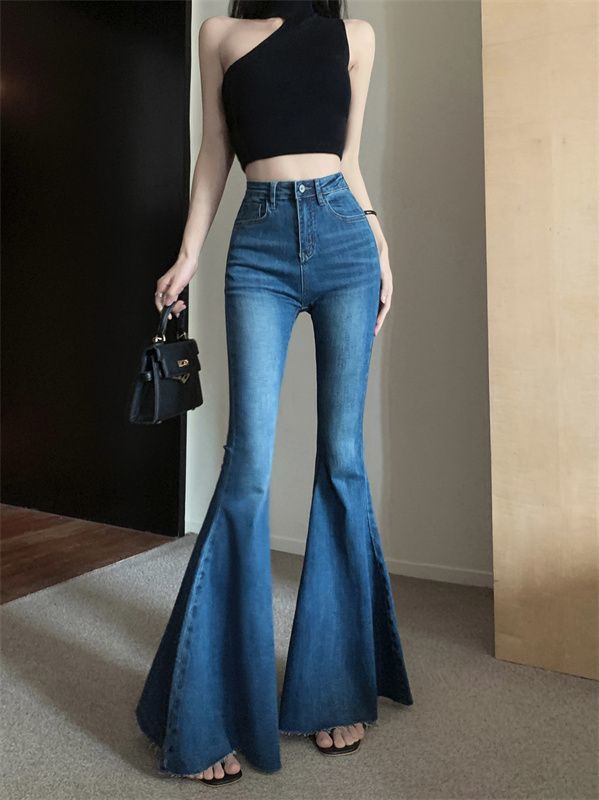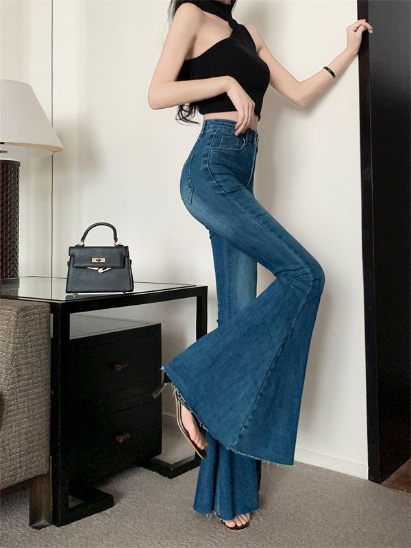 봄 여름 여성용 아메리칸 플레어 청바지, 틈새 디자인, 하이웨이스트, 슬림핏, 로우 엣지, 와이드 레그 바닥 길이 팬츠스토어 가기