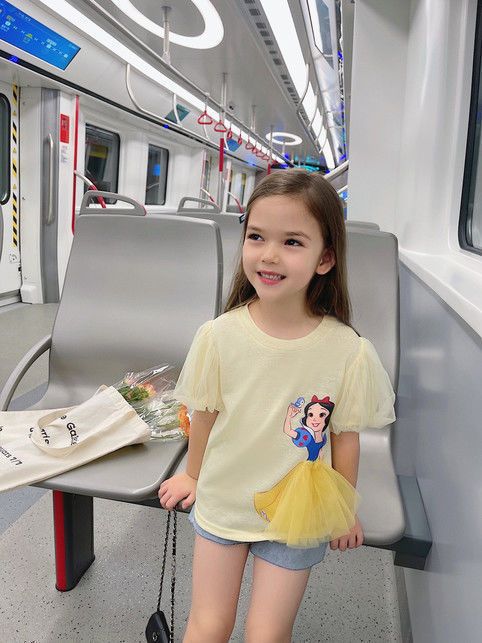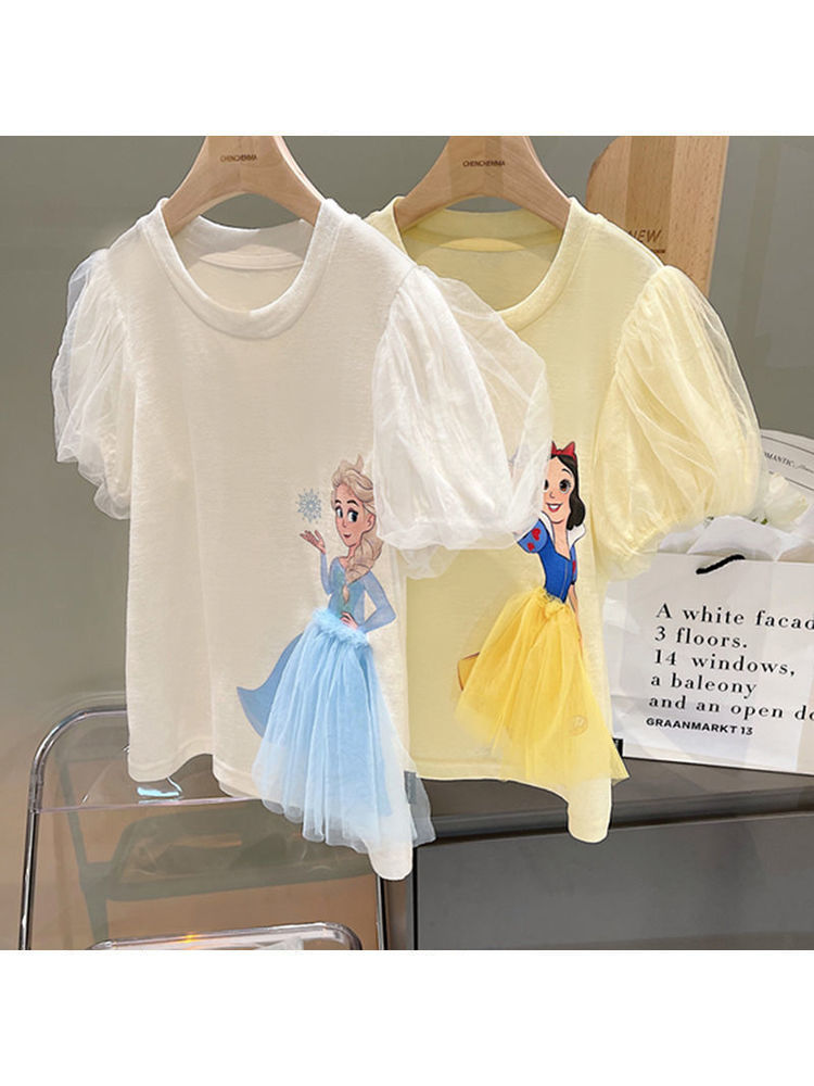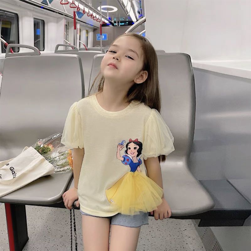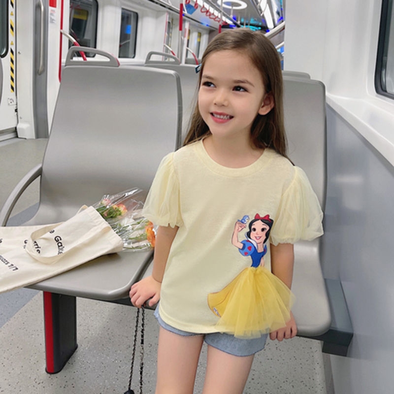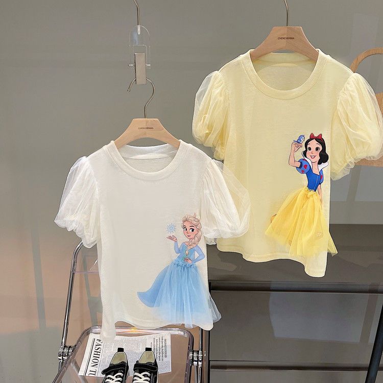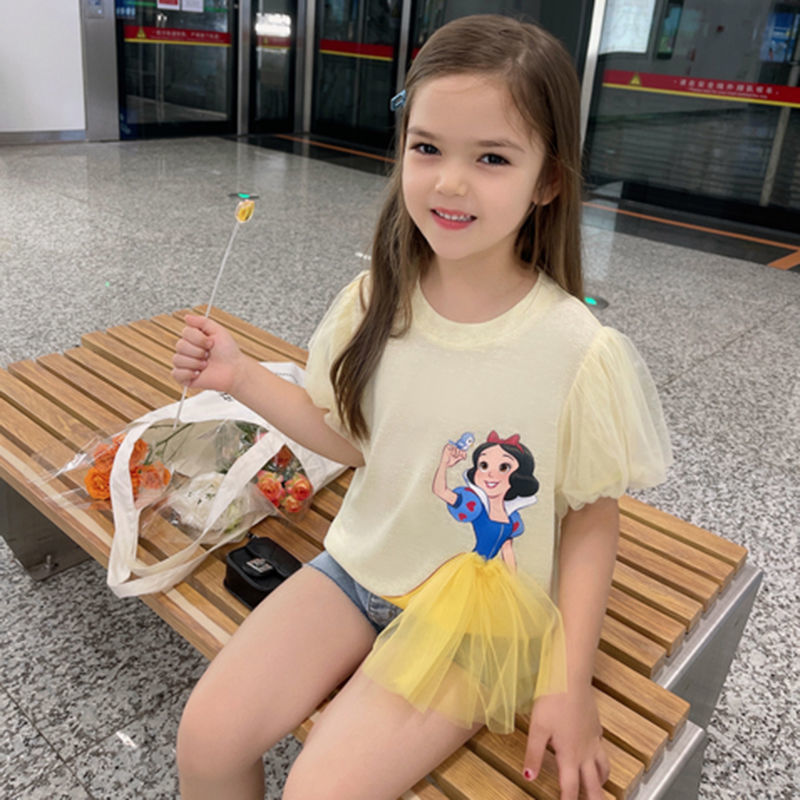 아기 소녀 티셔츠 여름 새 스타일 어린이 귀여운 공주 스플 라이스 메쉬 라운드 넥 버블 슬리브 탑 다목적스토어 가기