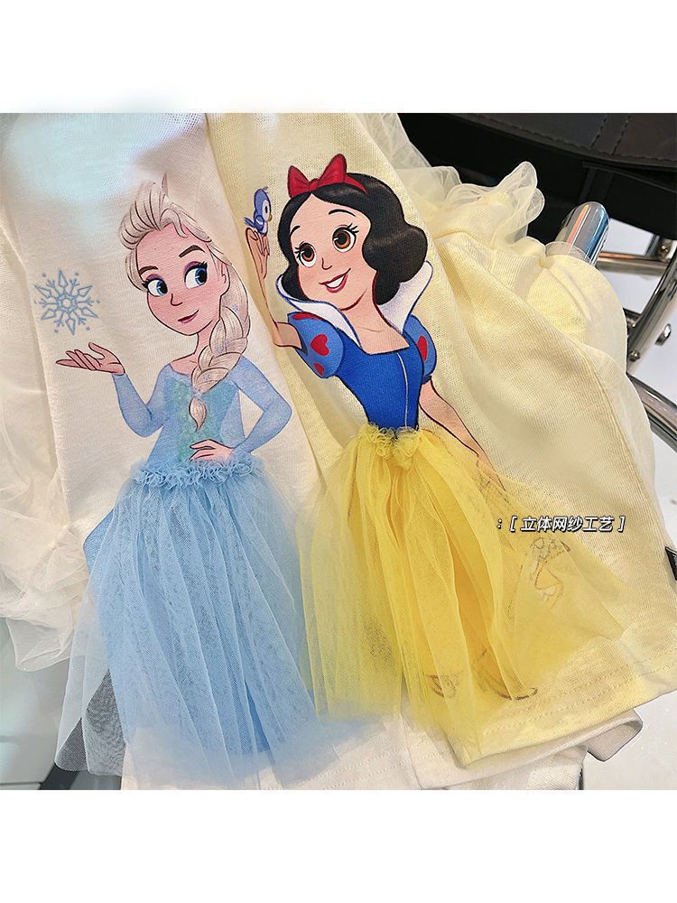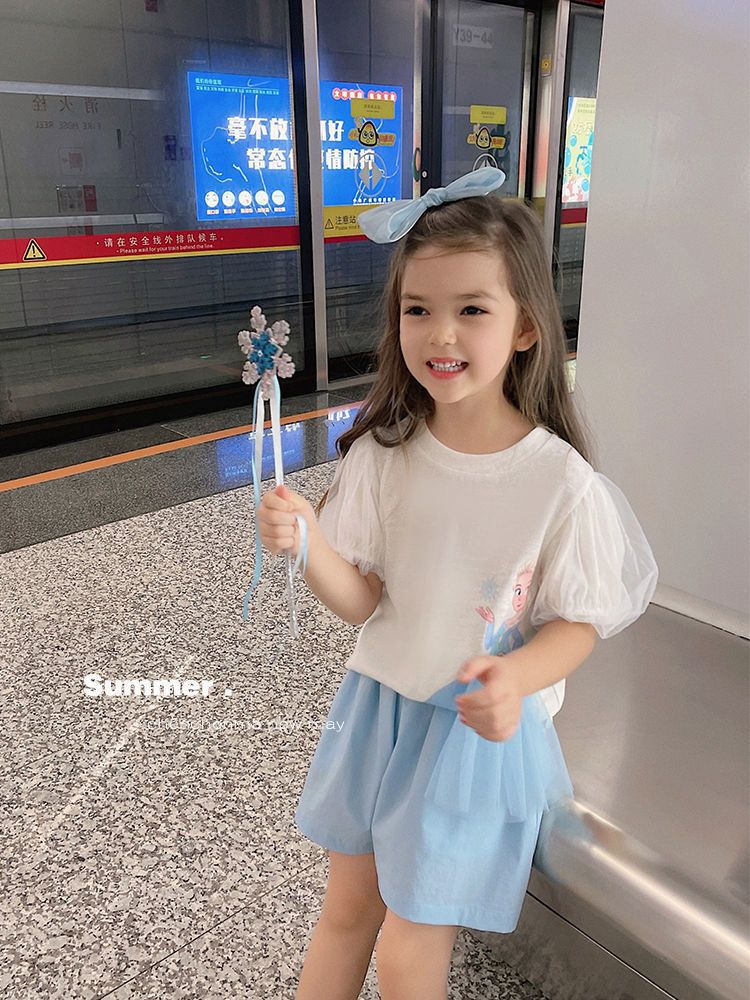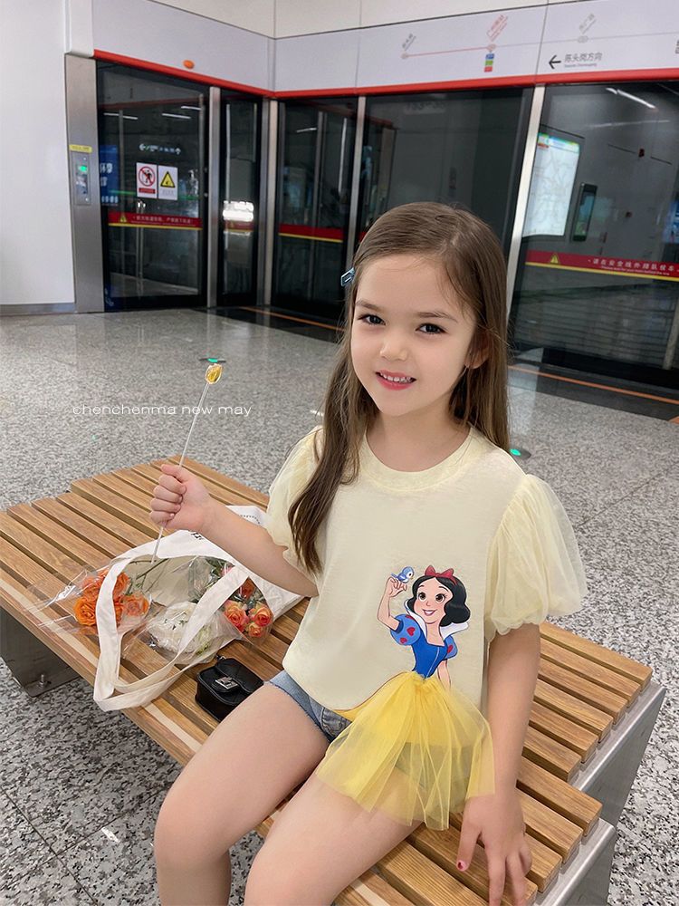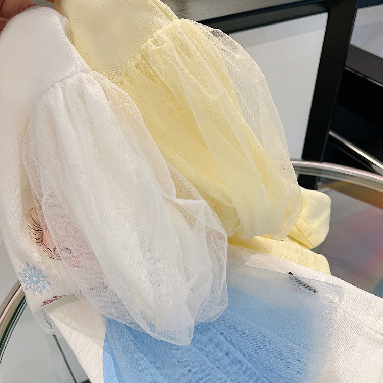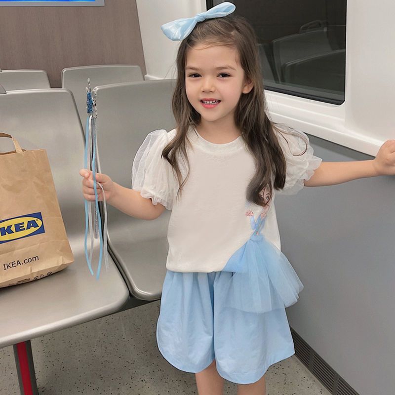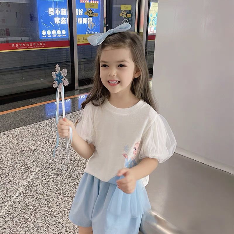 아기 소녀 티셔츠 여름 새 스타일 어린이 귀여운 공주 스플 라이스 메쉬 라운드 넥 버블 슬리브 탑 다목적스토어 가기