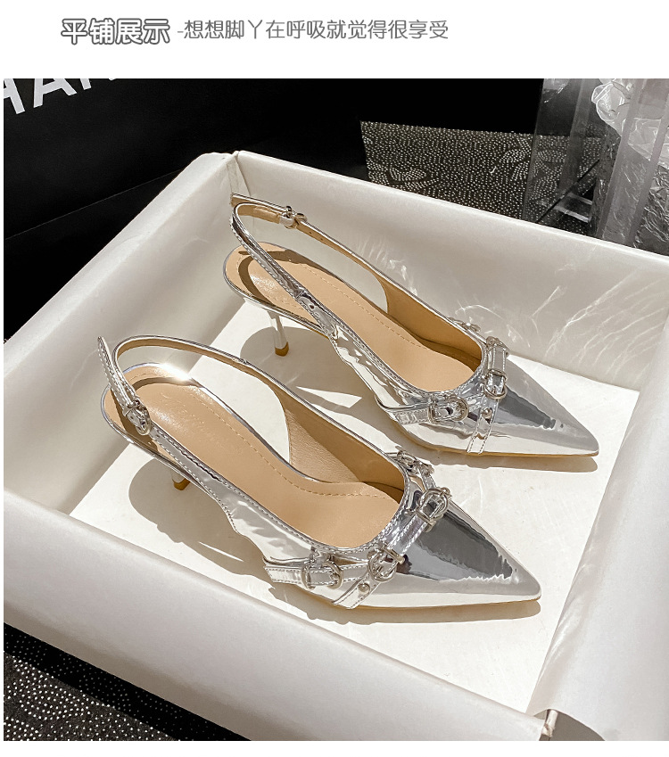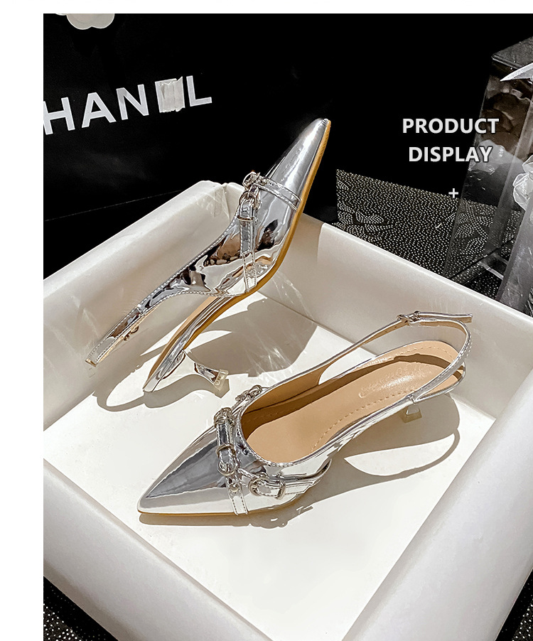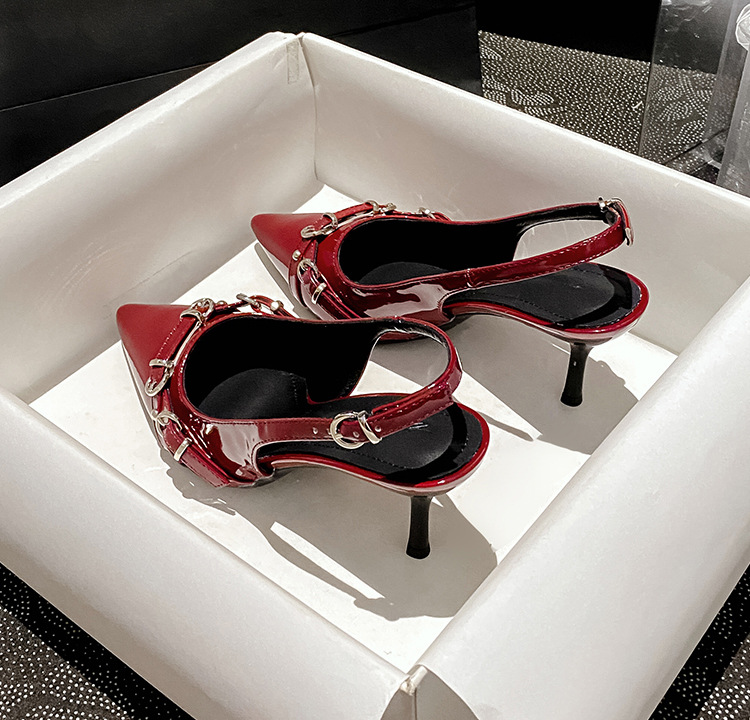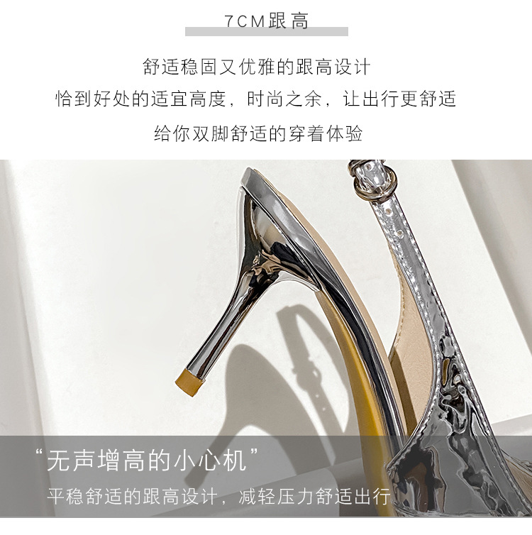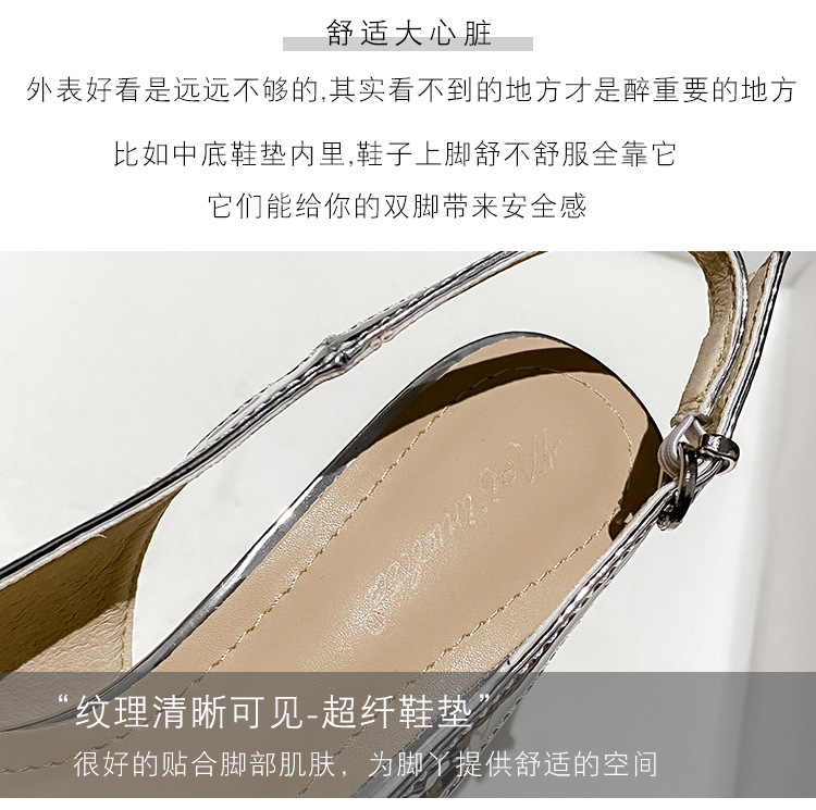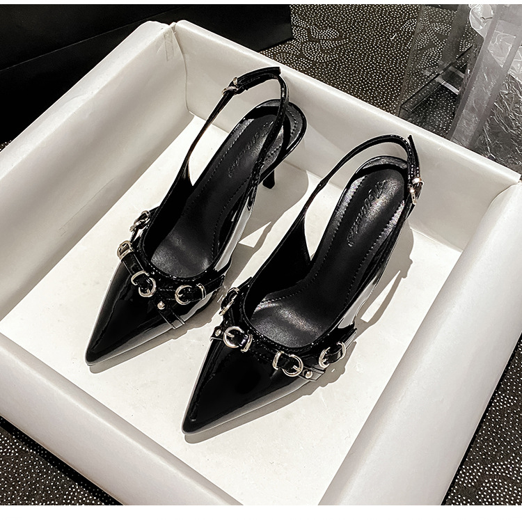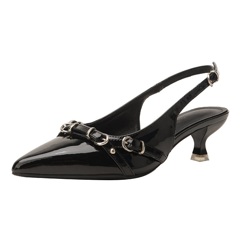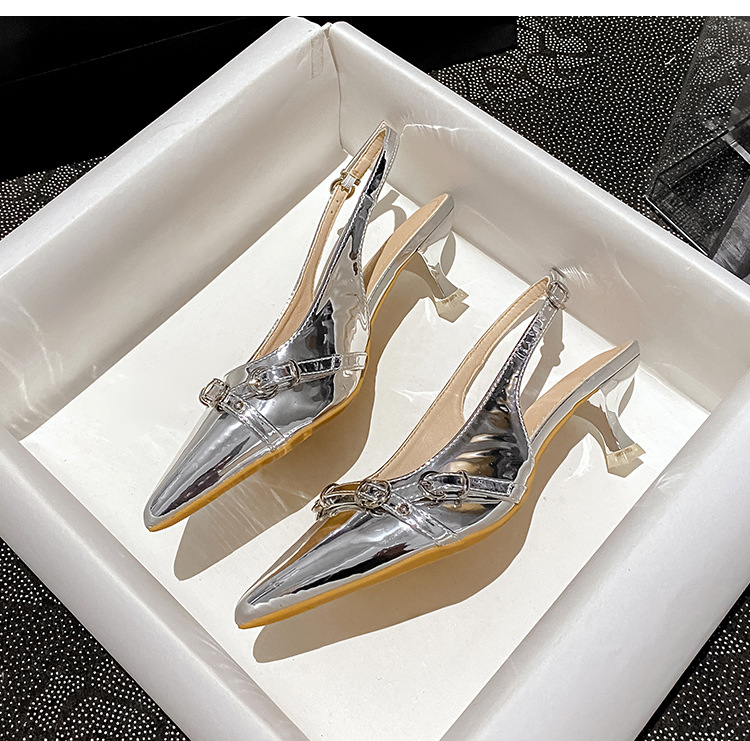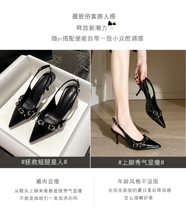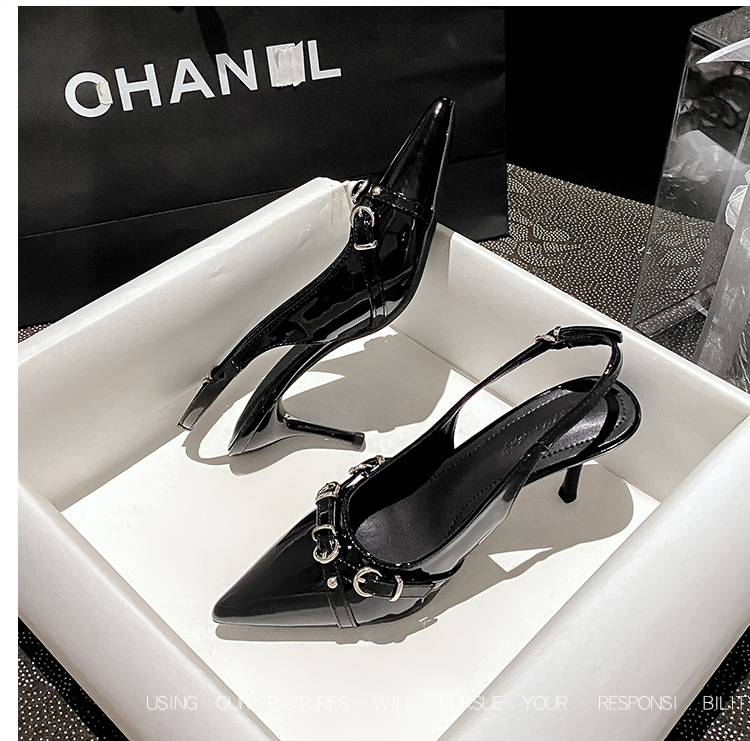 뾰족한 스틸레토 힐 신발 여성 2025 년 여름 새로운 도착 얕은 프랑스 특허 가죽 편평한 모양의 구멍 샌들스토어 가기