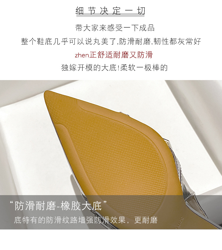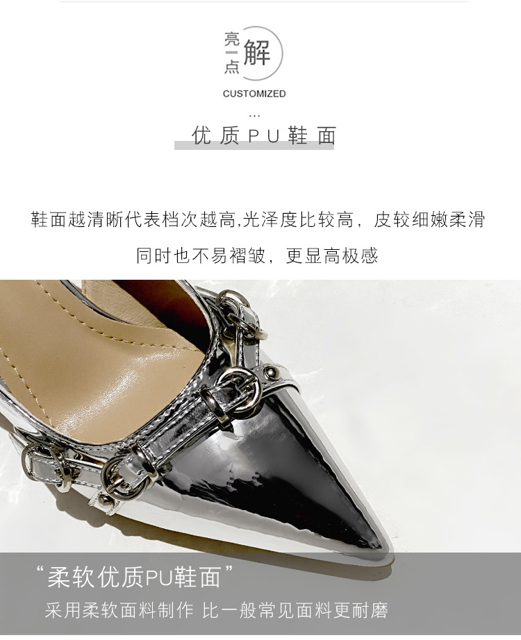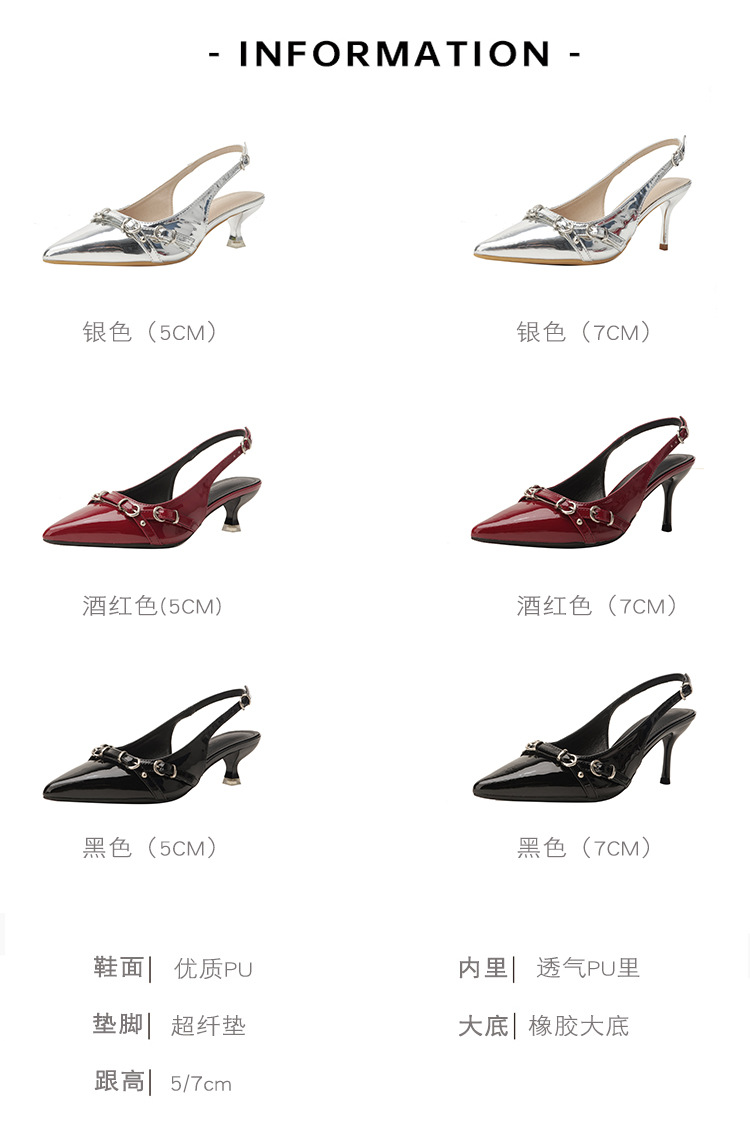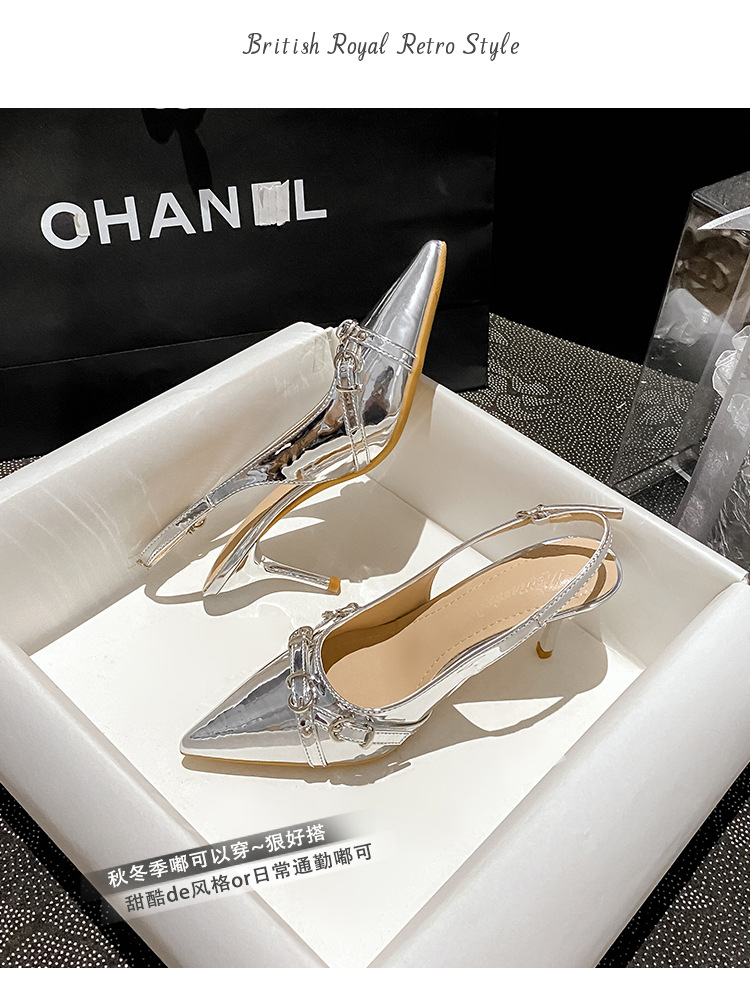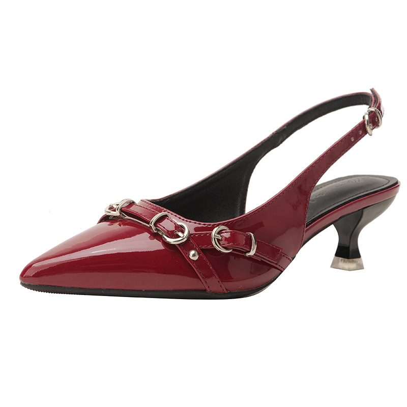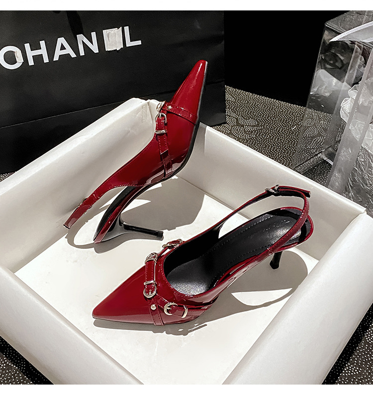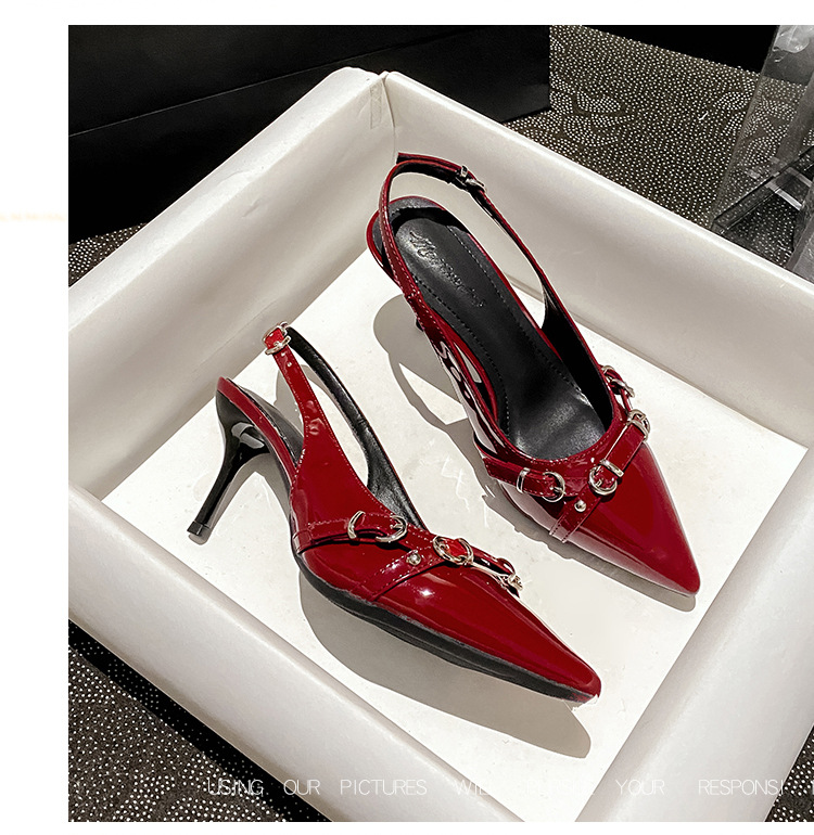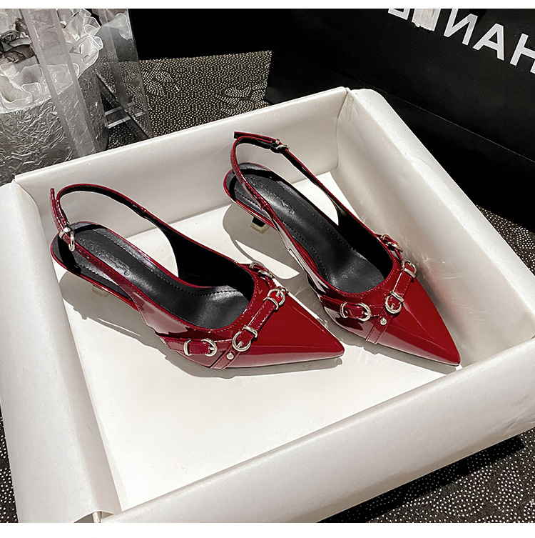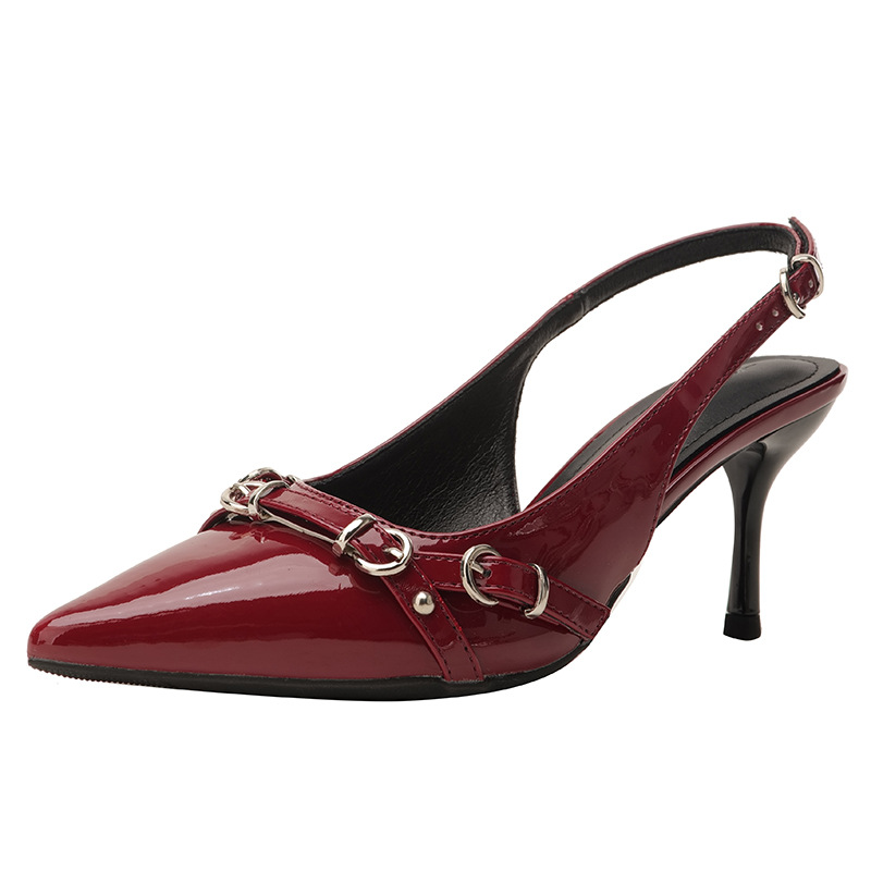 뾰족한 스틸레토 힐 신발 여성 2025 년 여름 새로운 도착 얕은 프랑스 특허 가죽 편평한 모양의 구멍 샌들스토어 가기