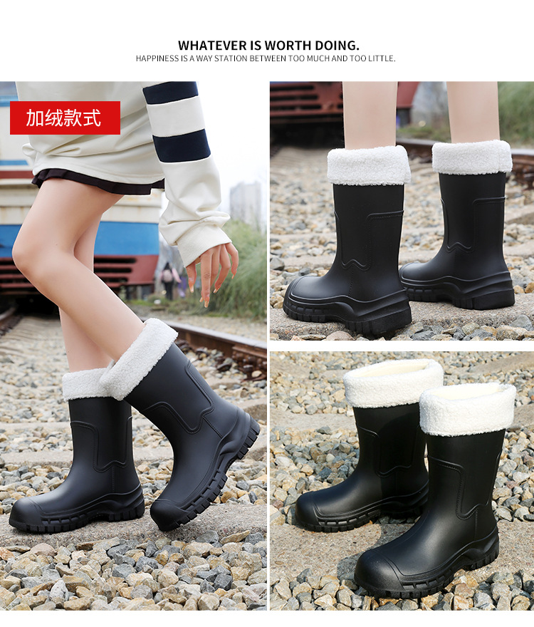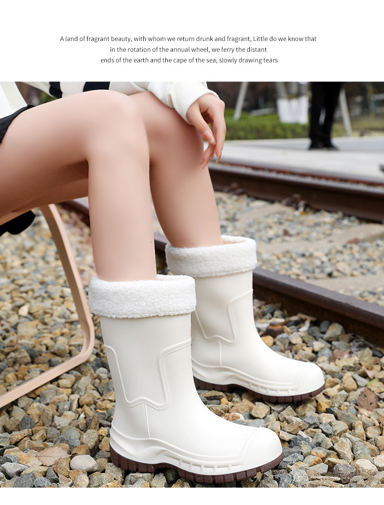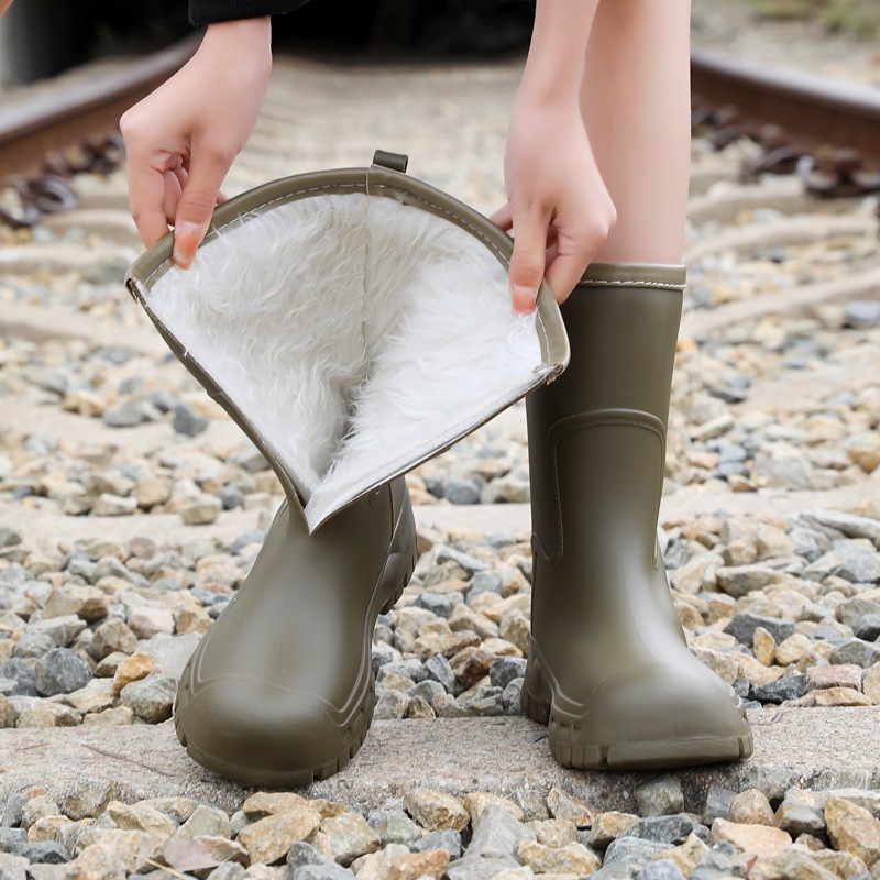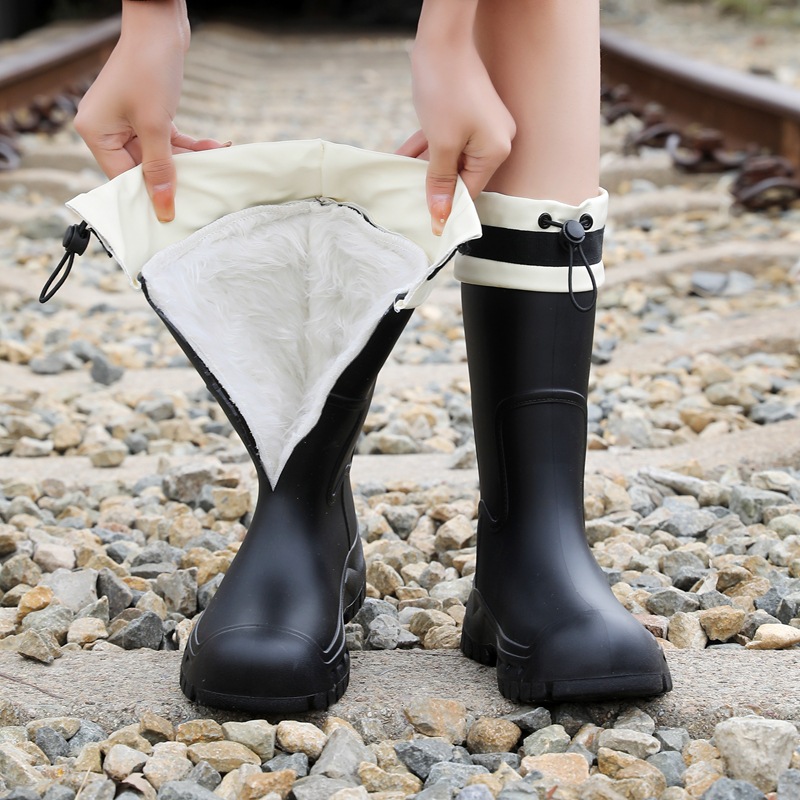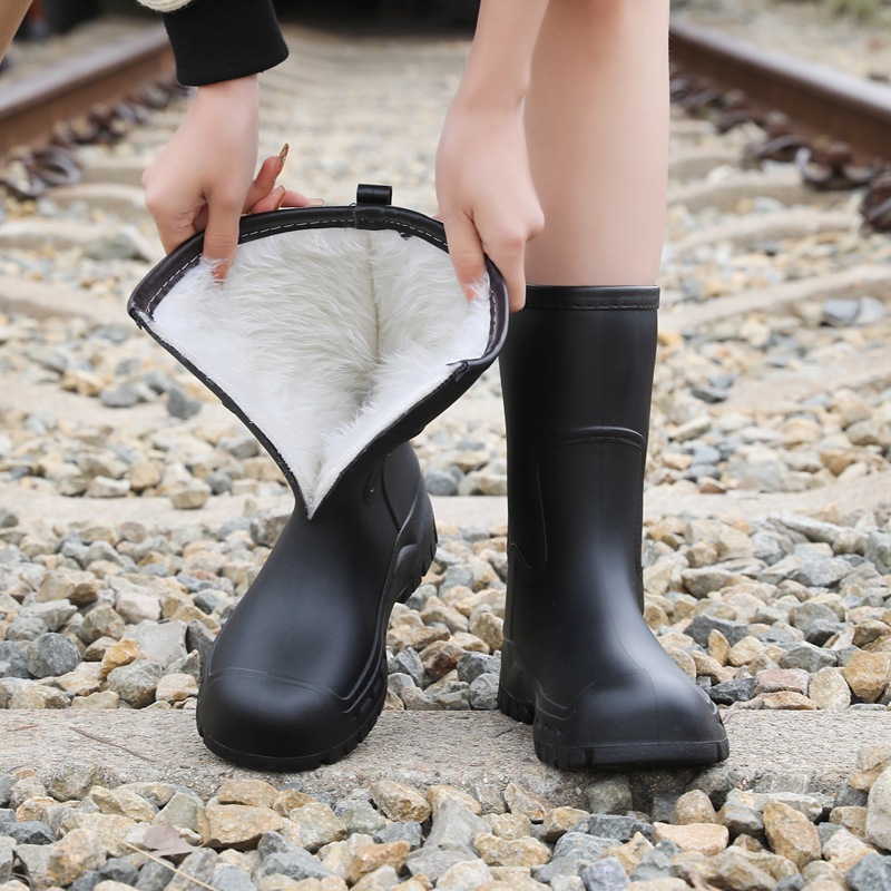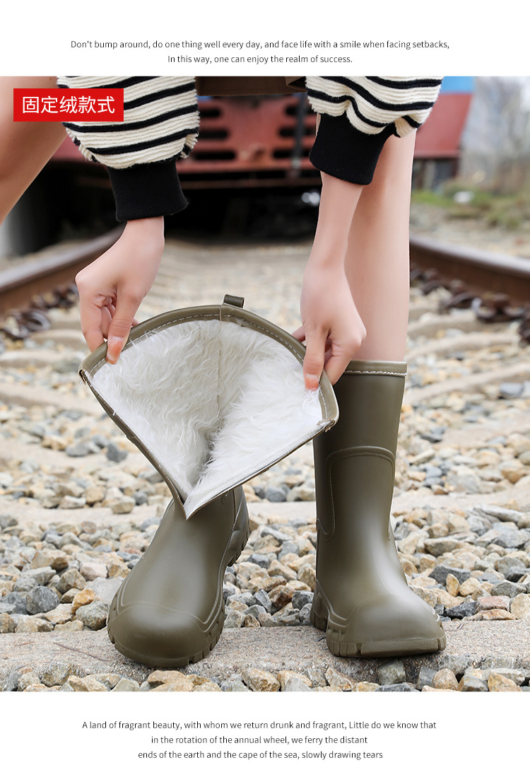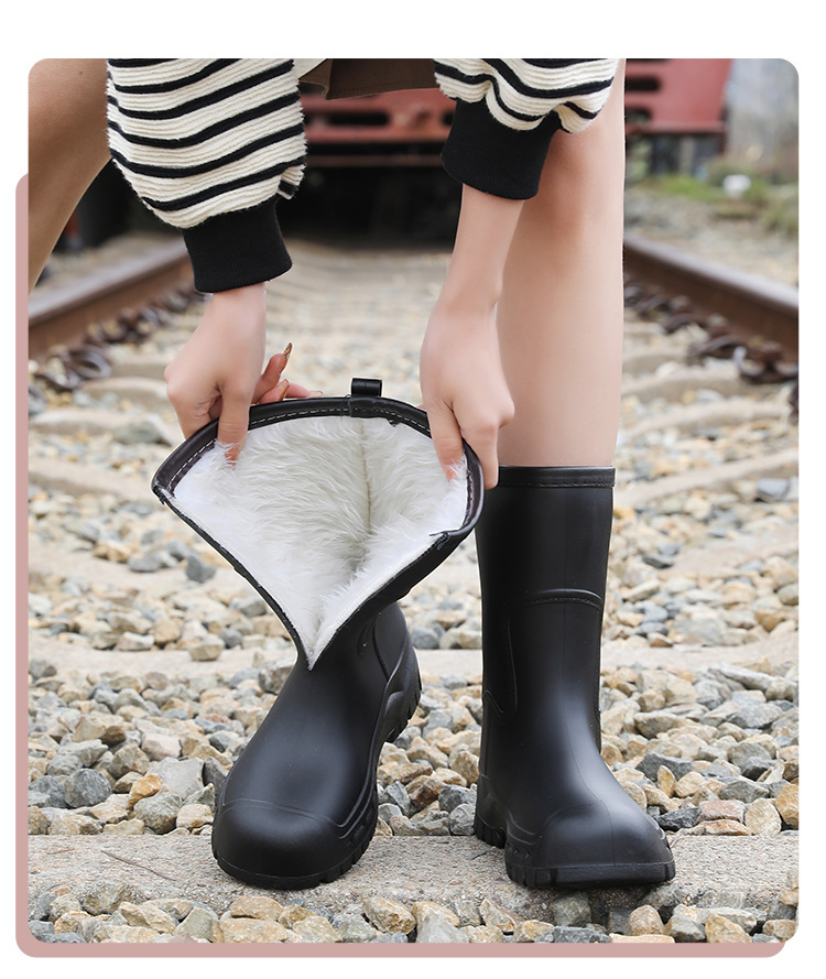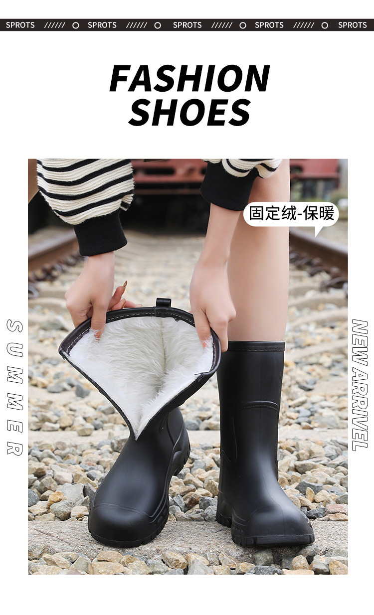 여성용 장화, 중간 길이의 야외 방수 두꺼운 밑창 내마모성 워터 부츠, 일본식 아름다운 비오는 날 미끄럼 방지 플러스 벨벳 주방 고무 신발스토어 가기