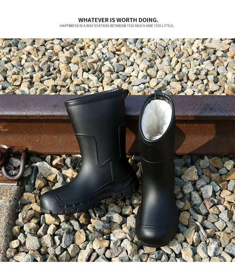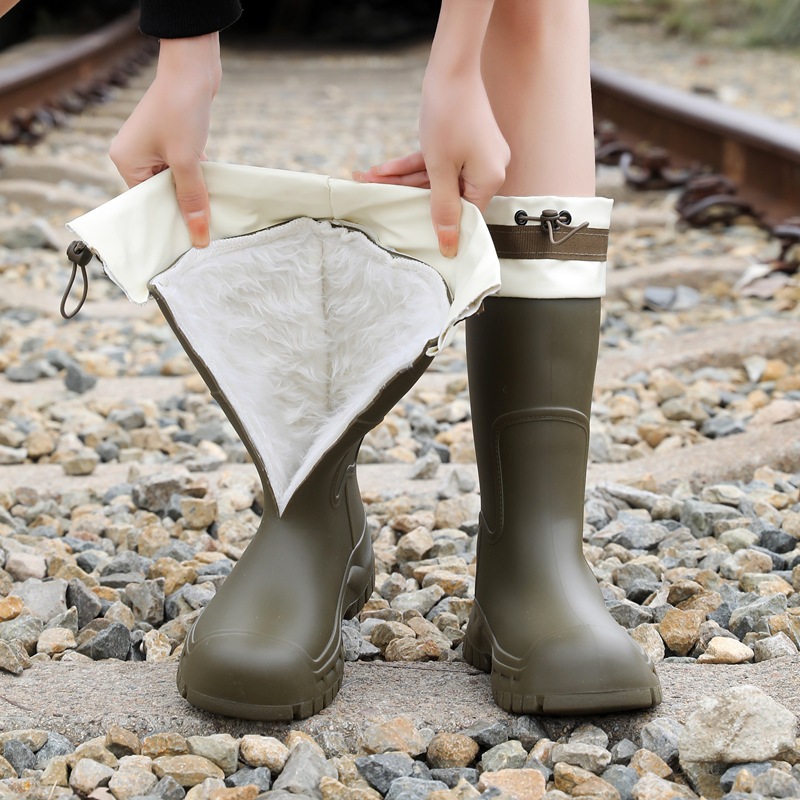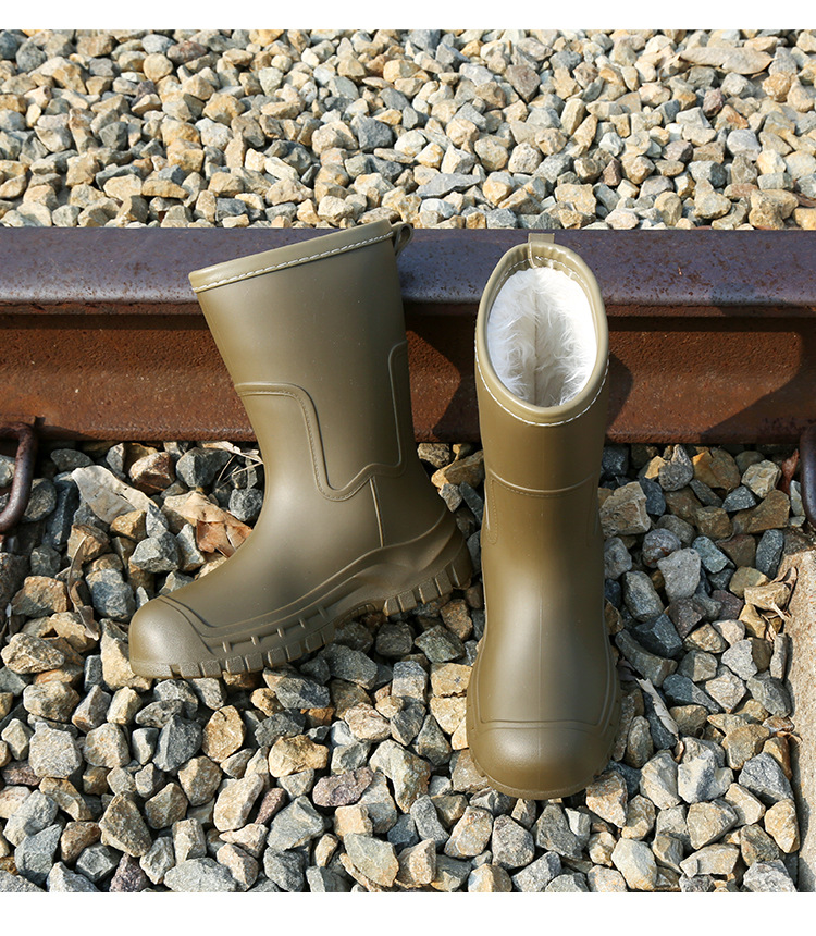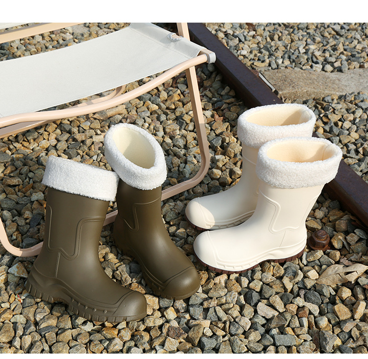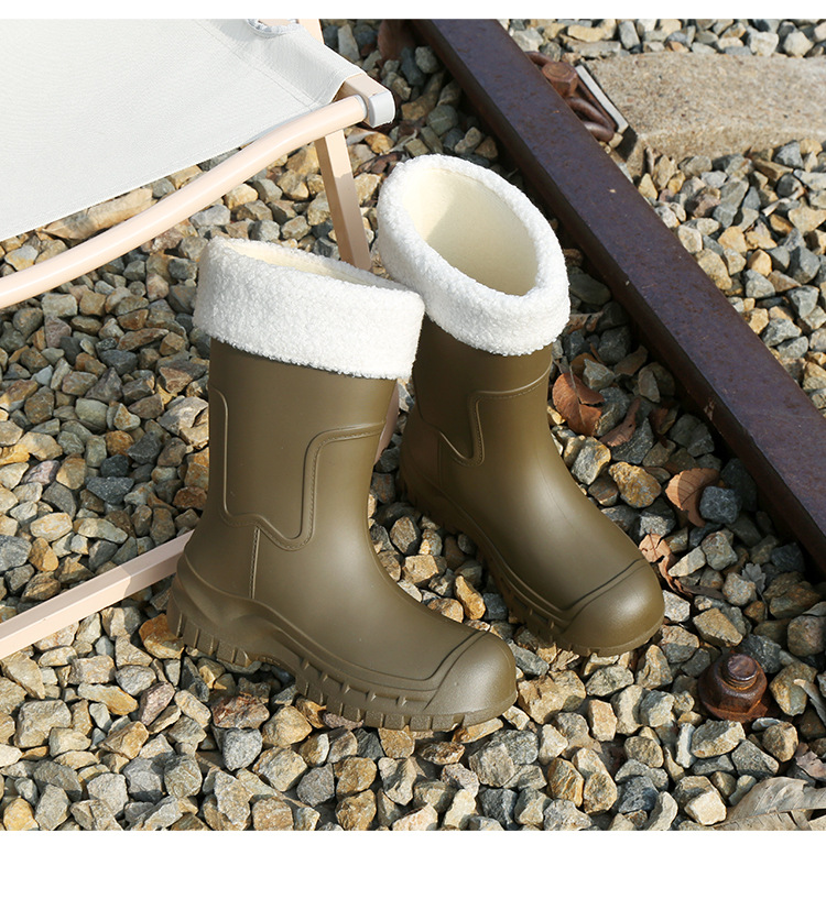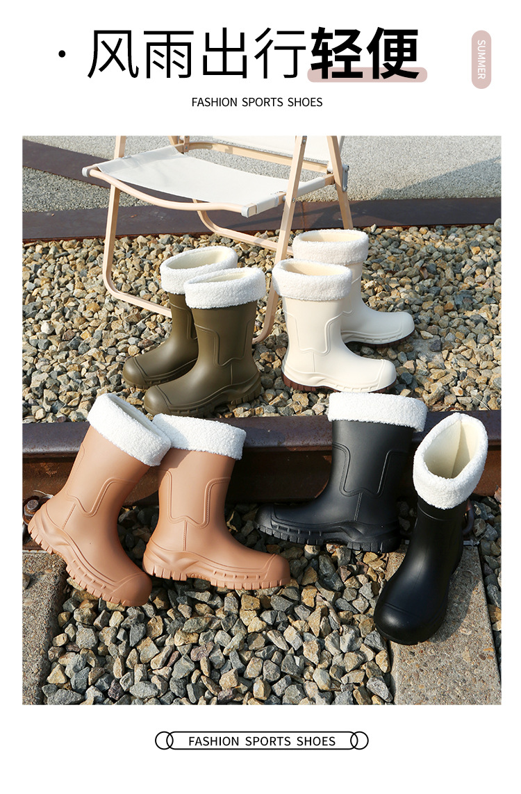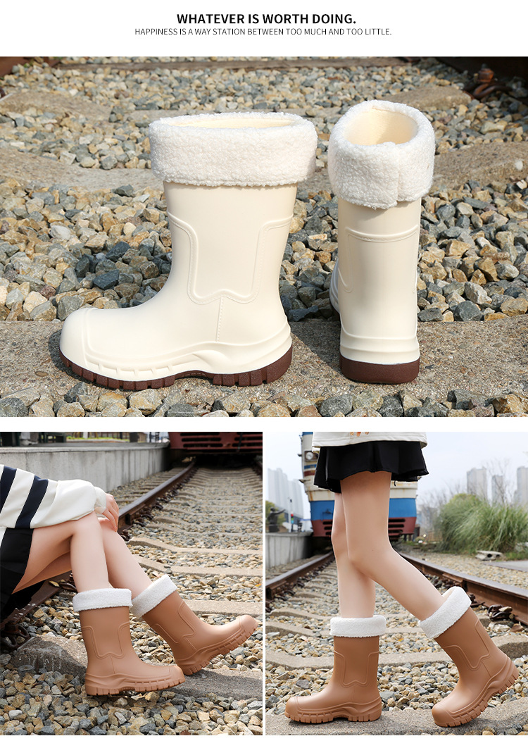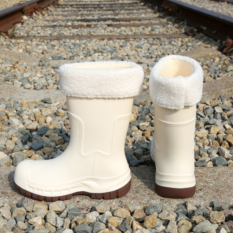 여성용 장화, 중간 길이의 야외 방수 두꺼운 밑창 내마모성 워터 부츠, 일본식 아름다운 비오는 날 미끄럼 방지 플러스 벨벳 주방 고무 신발스토어 가기