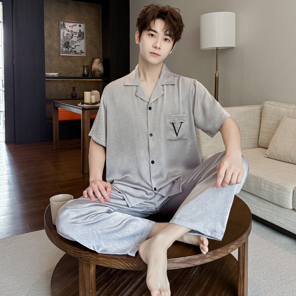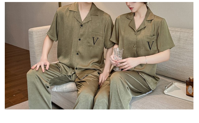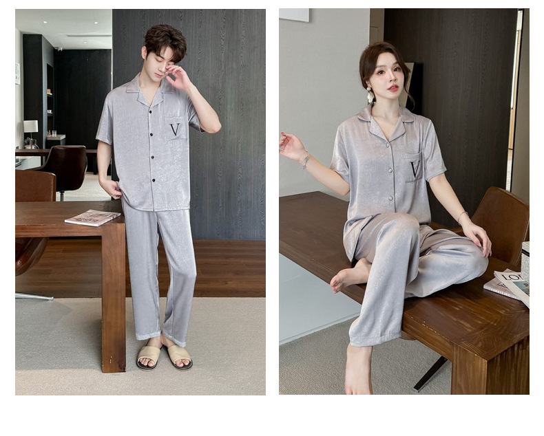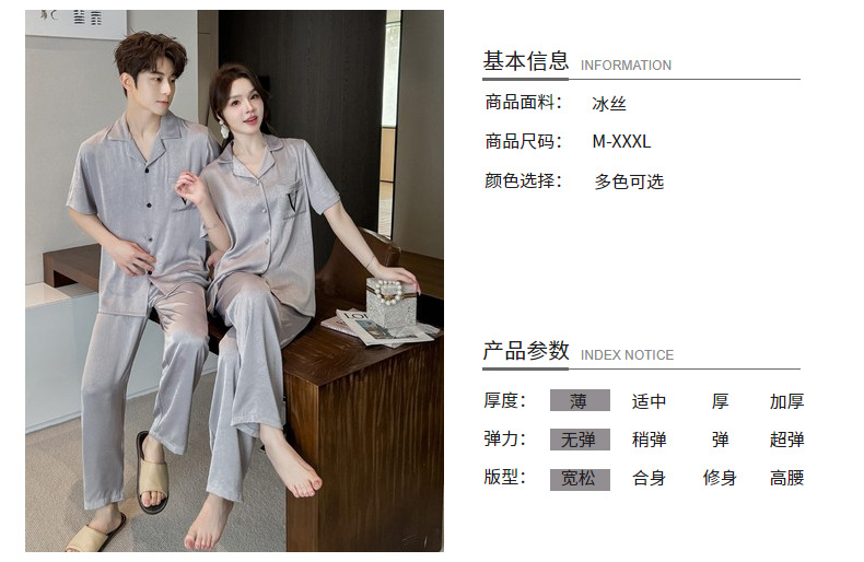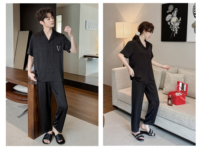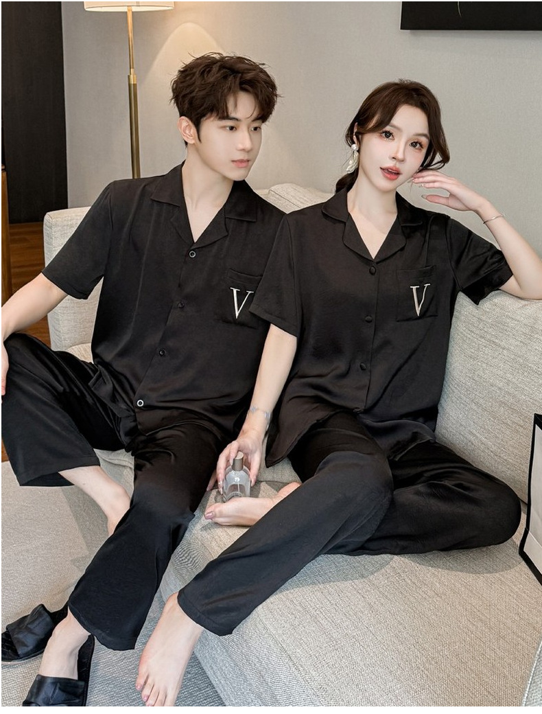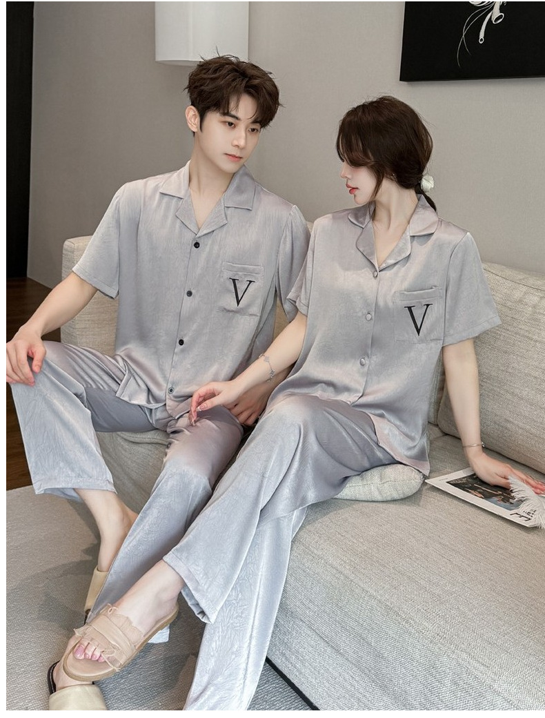 커플 잠옷 2025 봄과 가을 남자의 새로운 얼음 실크 짧은 소매 바지 세트 얇은 여성 홈 웨어 도매스토어 가기